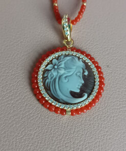 A jewel of rare beauty: a delicate coral paste round with sophisticated cameo pendant from Torre del greco with coral beading that echoes the necklace. A skillful relief carving depicts an elegant female profile, rich in finely delineated details, which is breathtaking in its precision and beauty.
