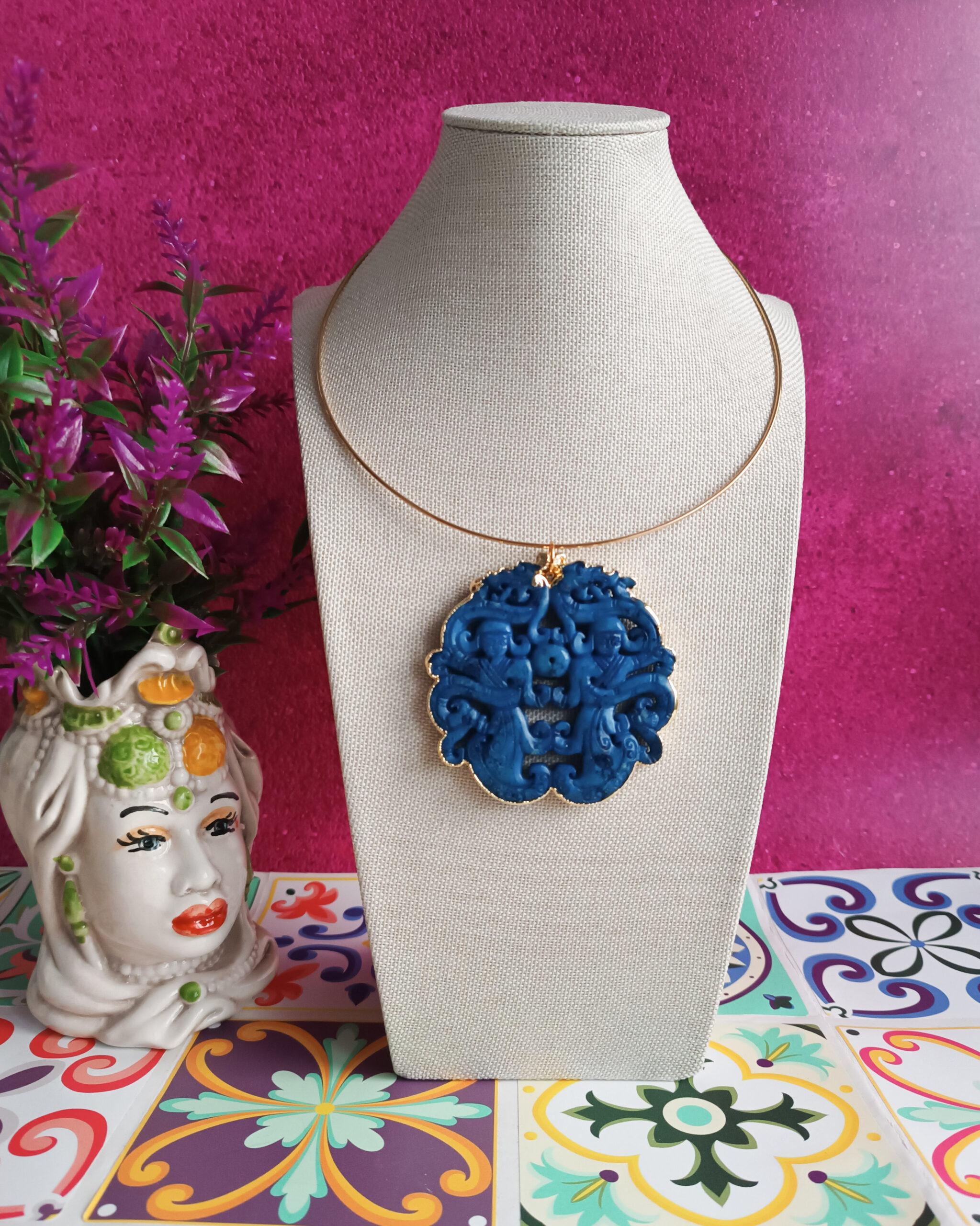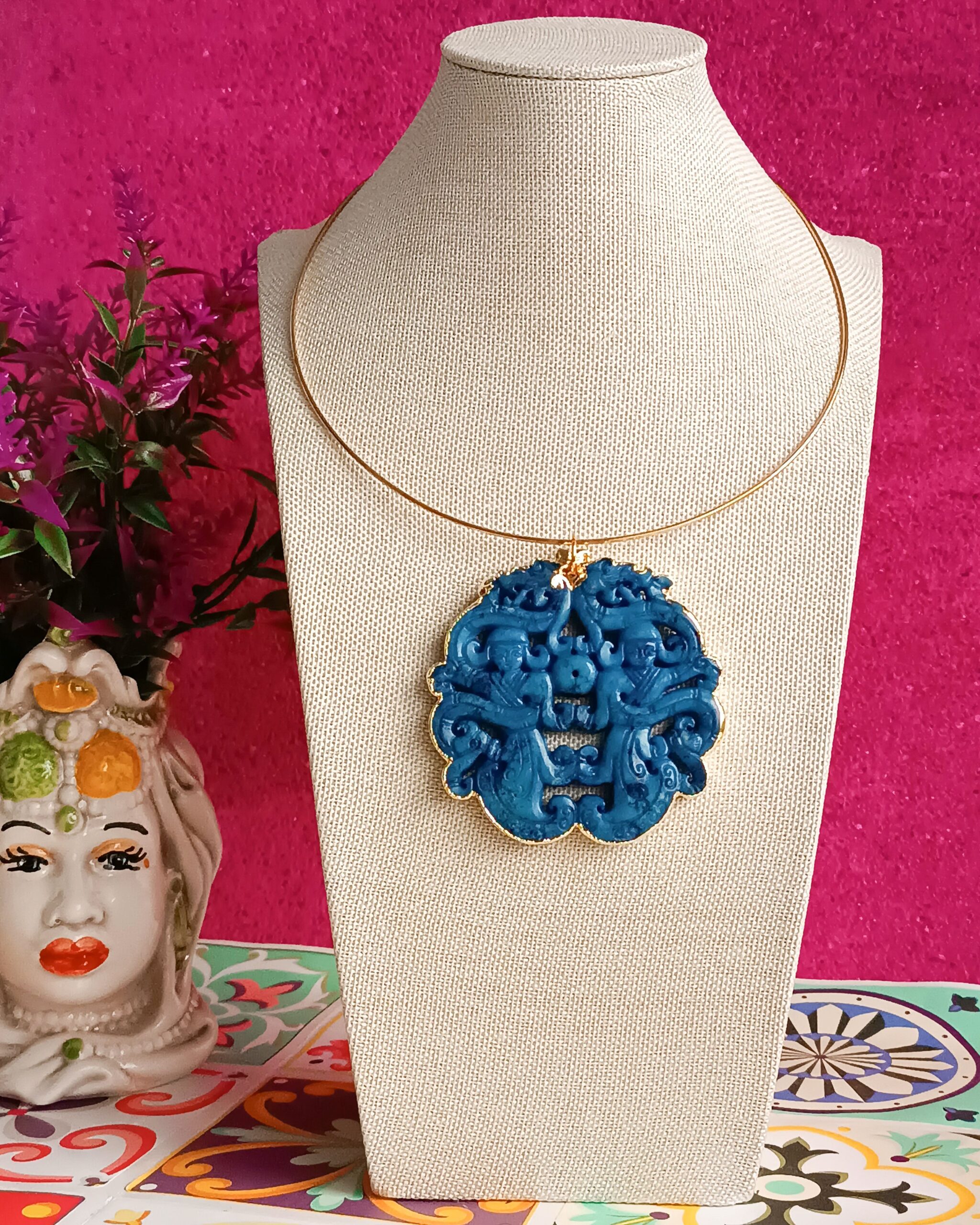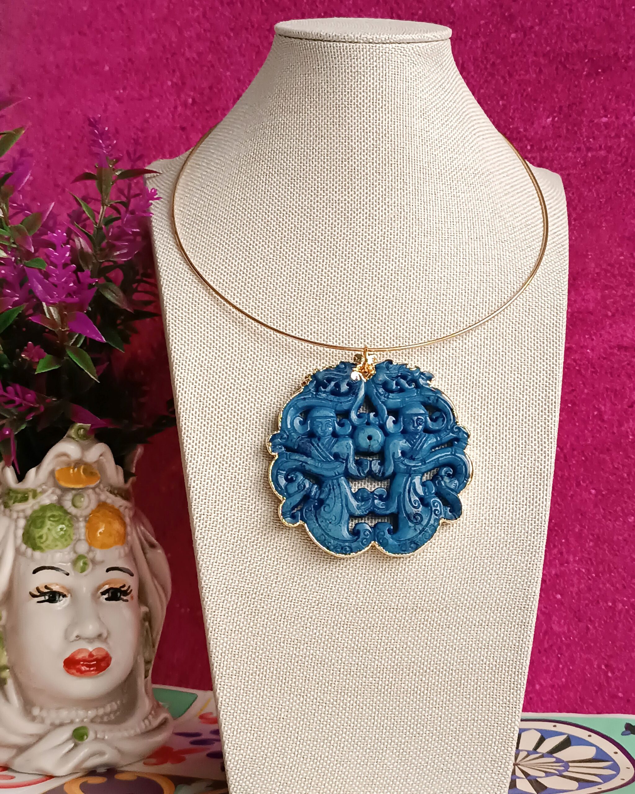 The pendant is made of natural jade, is hand-carved and framed within a golden structure.