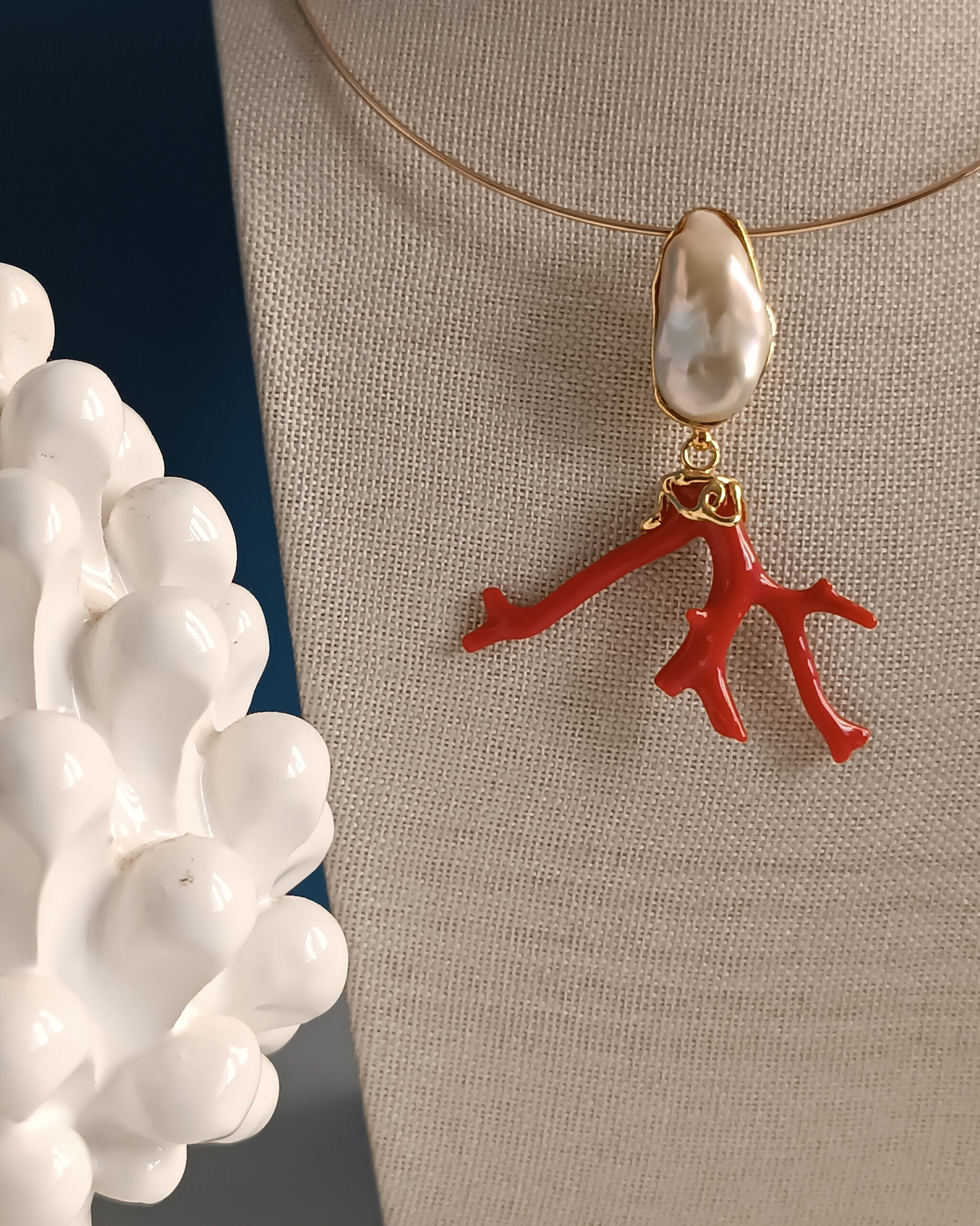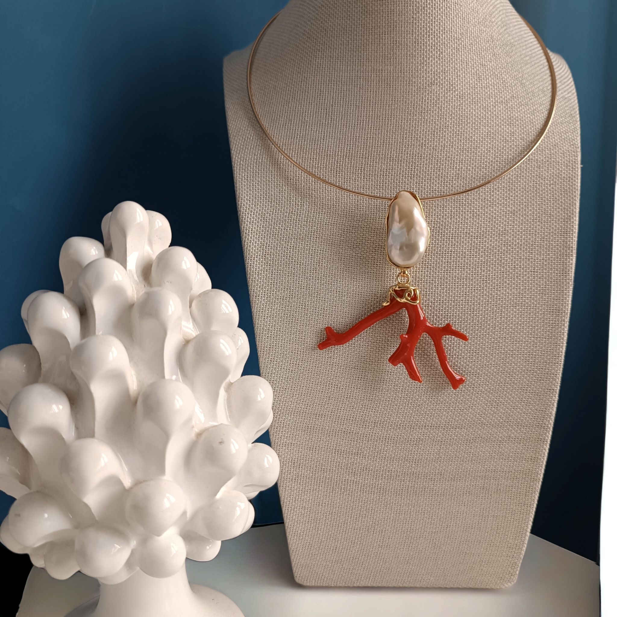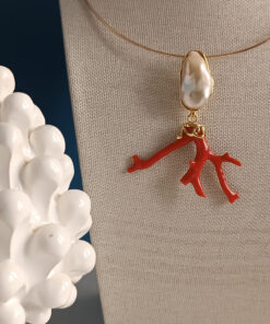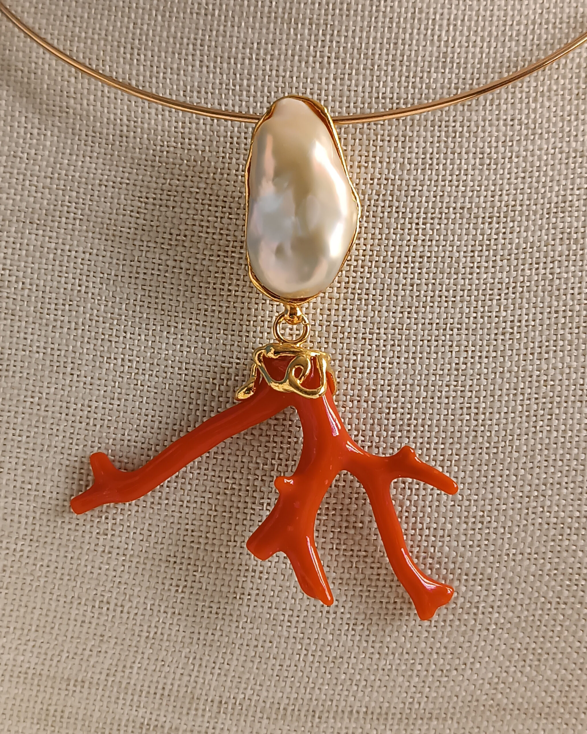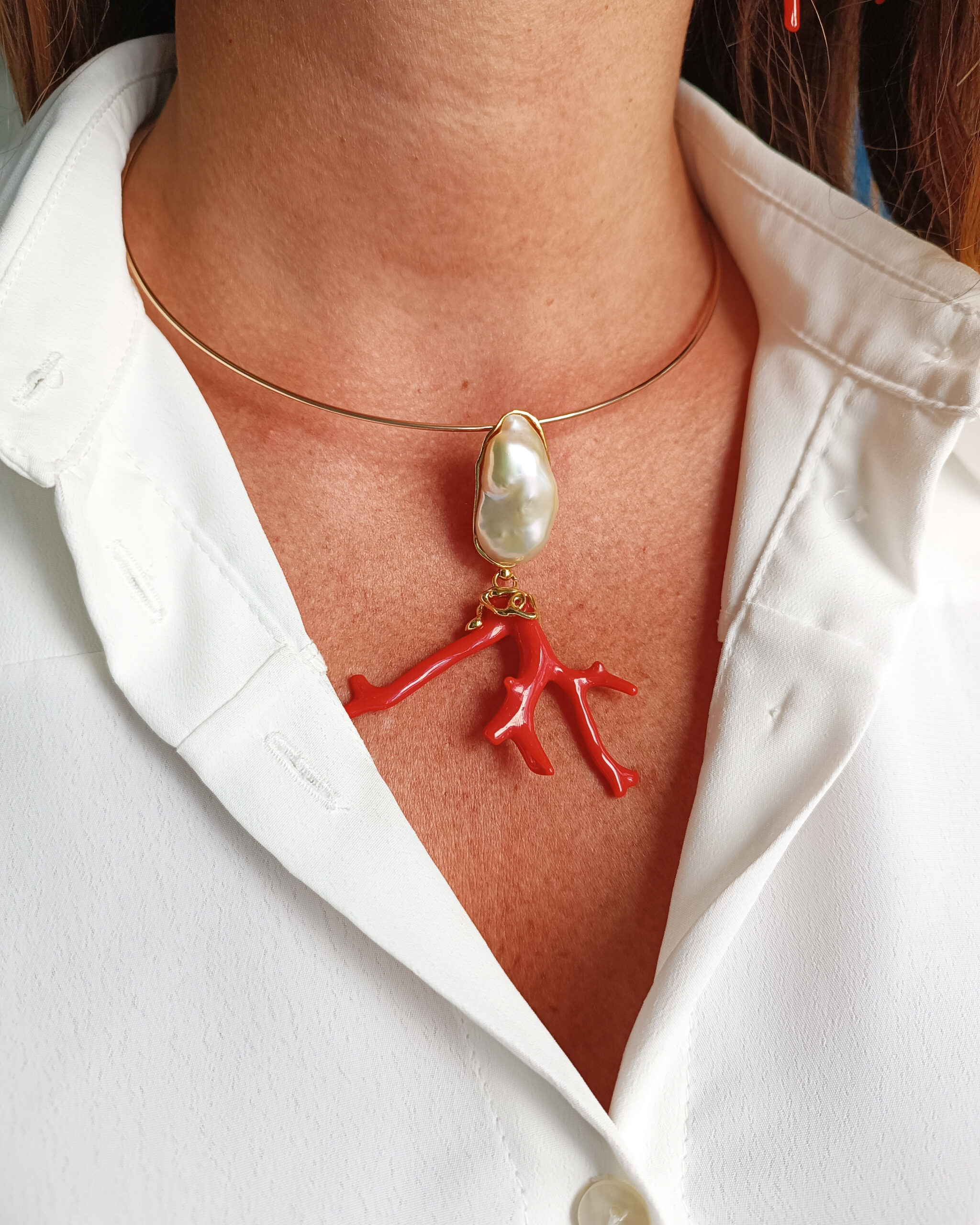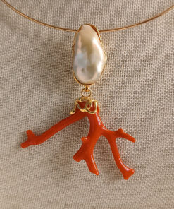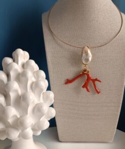 Rigid Choker Necklace with Statement Pendant with Pearl and Coral Branch