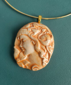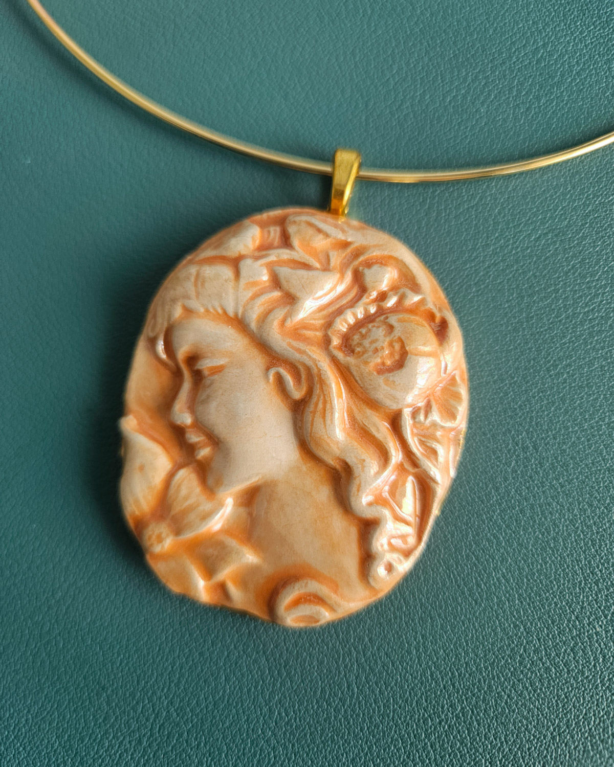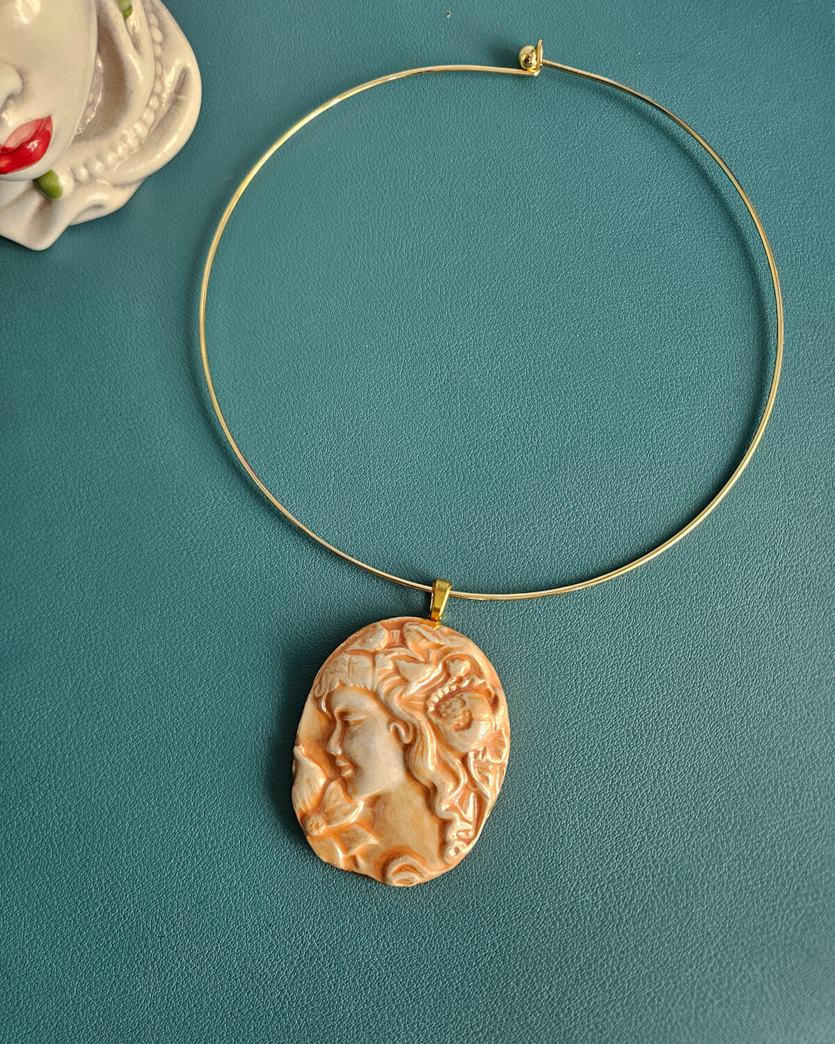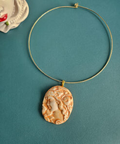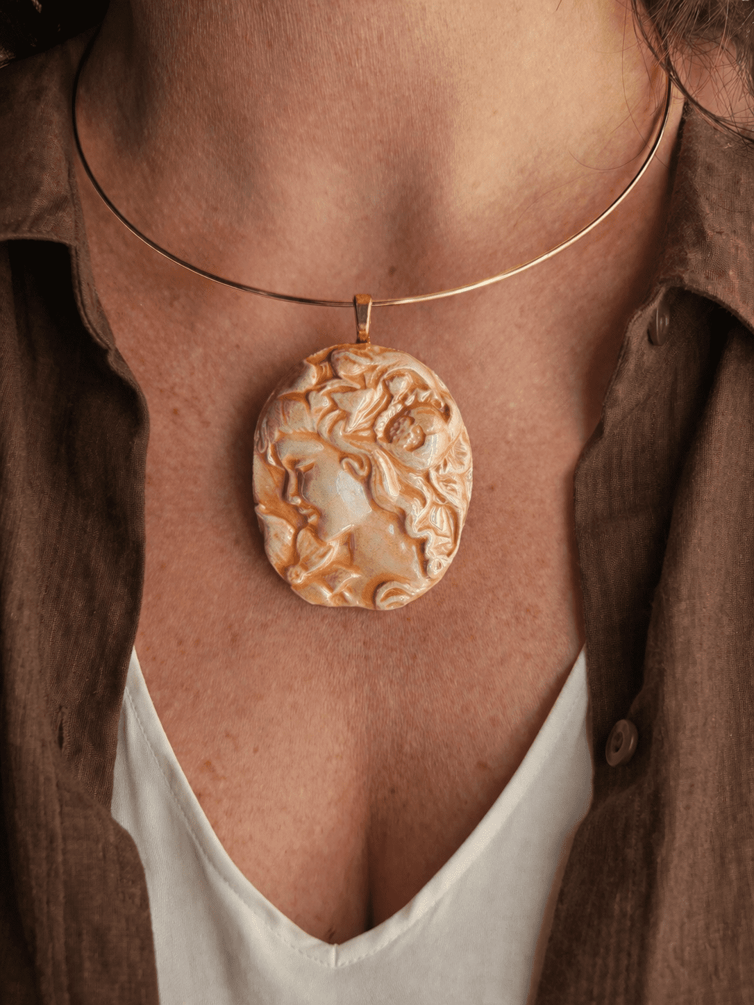 A minimalist, rigid choker featuring a ceramic cameo pendant with a delicate, embossed face in shades of orange, framed by a gold border that adds an extra touch of elegance. It is a romantic and refined piece of jewelry, perfect for those who appreciate unique and timeless details.