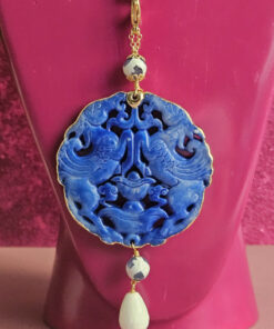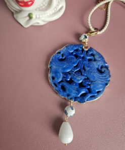 The pendant is made of hand-carved natural jade and is embellished with a chain and natural hard stones.