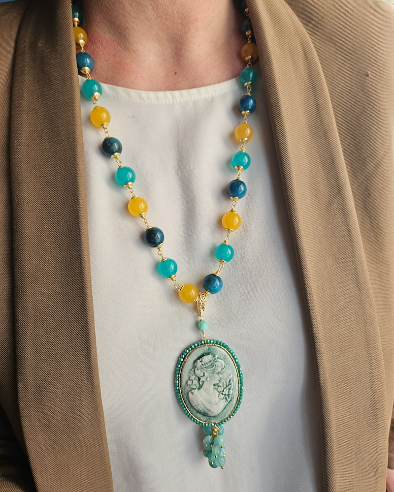 This new necklace is a modern reinterpretation of a classic piece of jewelry, and this is where tradition merges with innovation. The cameo, a symbol of elegance and tradition, has been totally revisited and made of Caltagirone ceramic. The result of meticulous workmanship, it comes to life in its unique details with a new vision. Each piece is an expression of authentic craftsmanship, where the ceramic, with its distinctive texture and vibrant color, enriches the cameo with a unique visual depth.