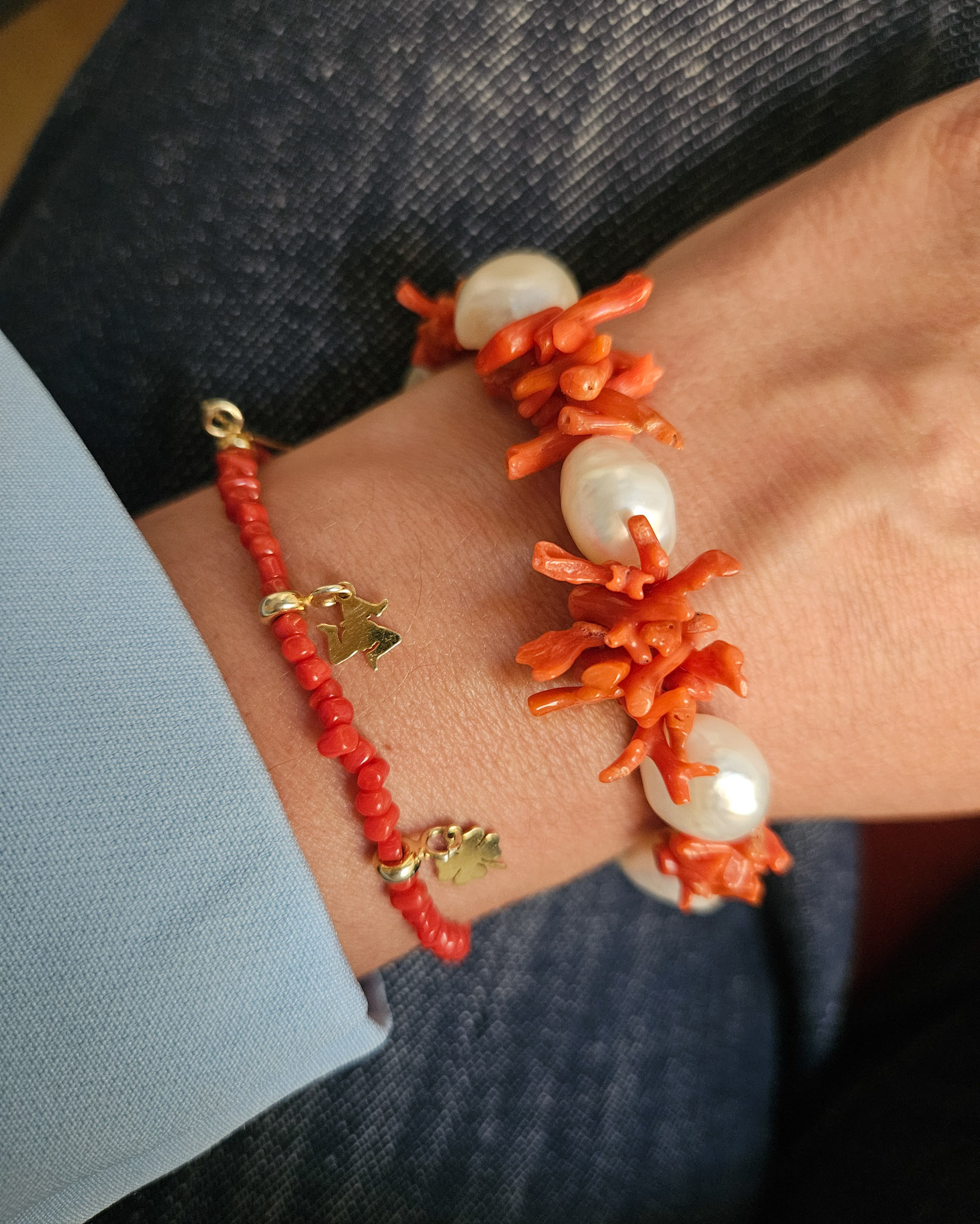 This parure made with luminous pearls and coral branches represents a sophisticated and original choice for those who love jewelry with a distinctive character.The necklace features a harmonious arrangement of white pearls and natural red coral branches. The choice of necklace enhances the décolleté, bringing light and refinement to the face. The contrast between the sheen of the pearls and the vibrancy of the coral creates a stunning visual effect. The bracelet incorporates the same decorative elements, with a more fluid and dynamic composition.A parure that doesn’t go unnoticed, perfect for ceremonies, special occasions, or simply for those who wish to wear a unique piece that will enhance your femininity.