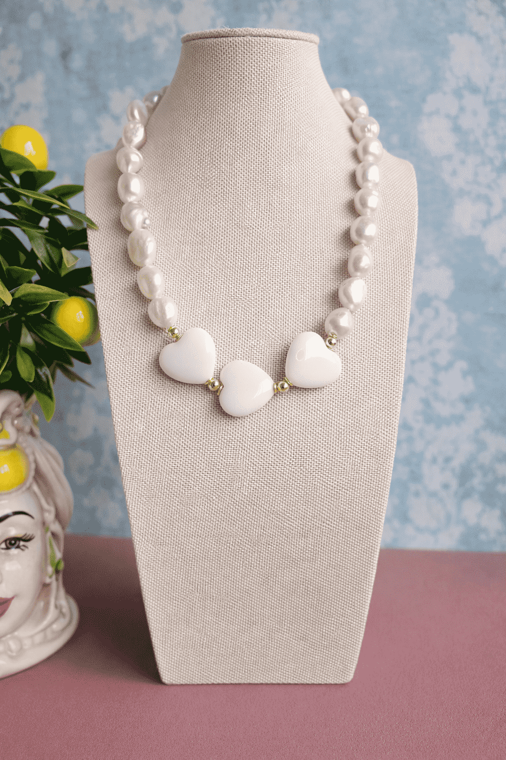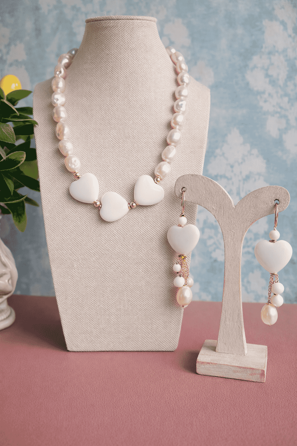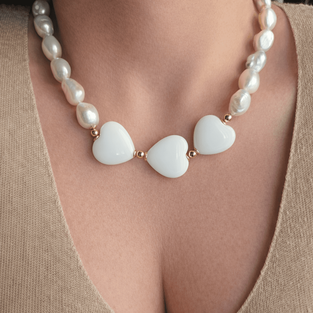 Set Necklace and Earrings 2 ANIME with Natural Pearls and White Hearts