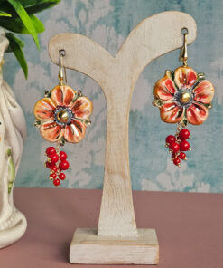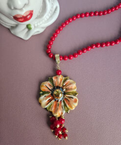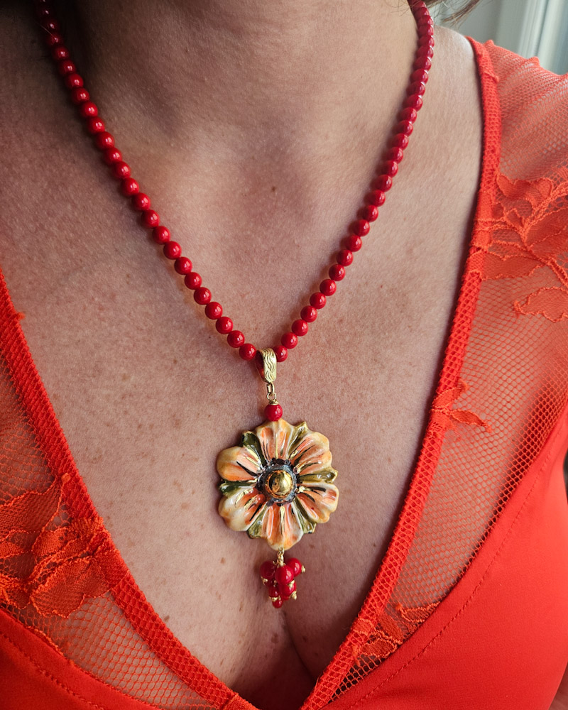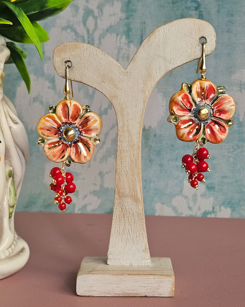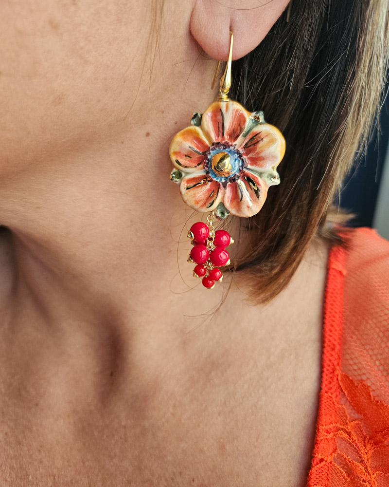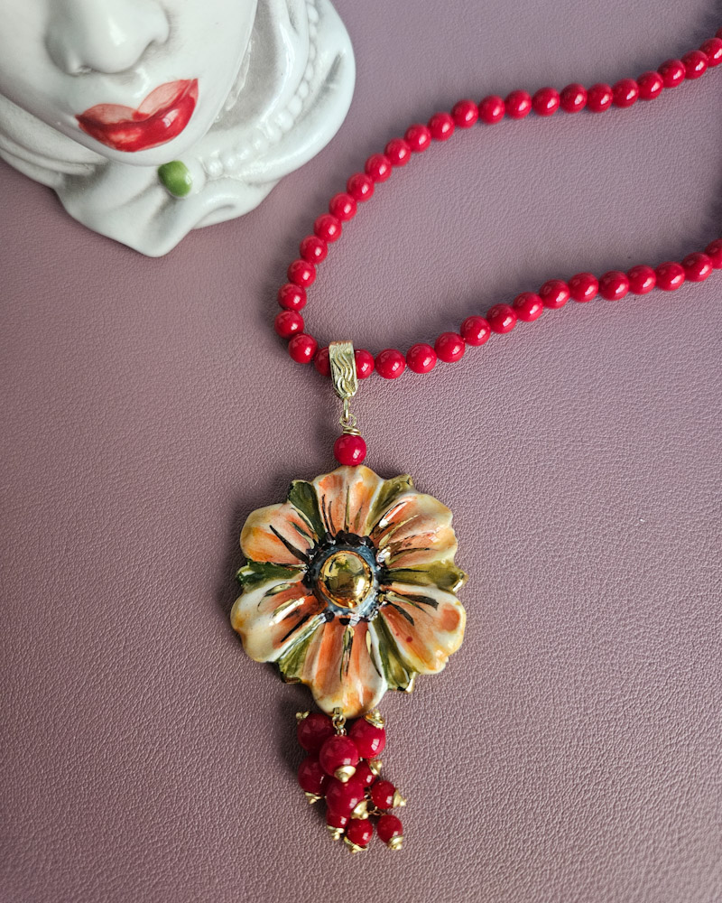 Ceramic flowers, modeled and painted by hand, give a distinctive and refined touch, while red stones add warmth and color. A combination that combines Sicilian tradition and contemporary style, ideal for those looking for an original accessory that is sure to be an object of admiration.