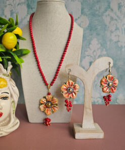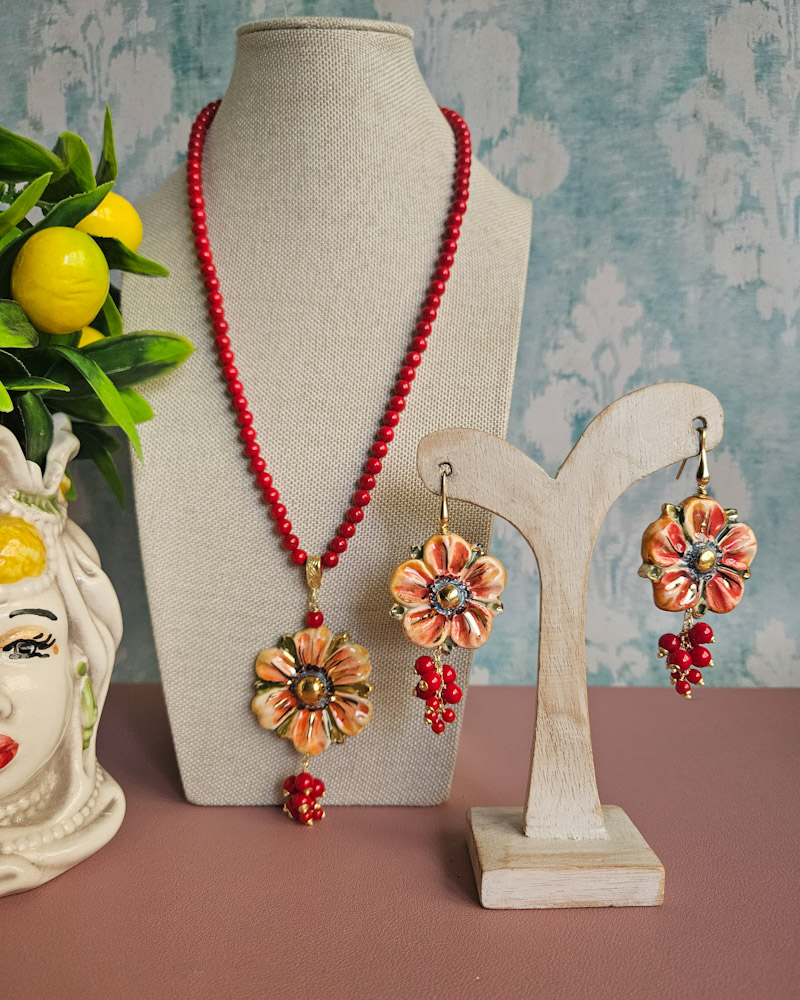 Set Necklace and Earrings with Ceramic Flowers and Red Stones