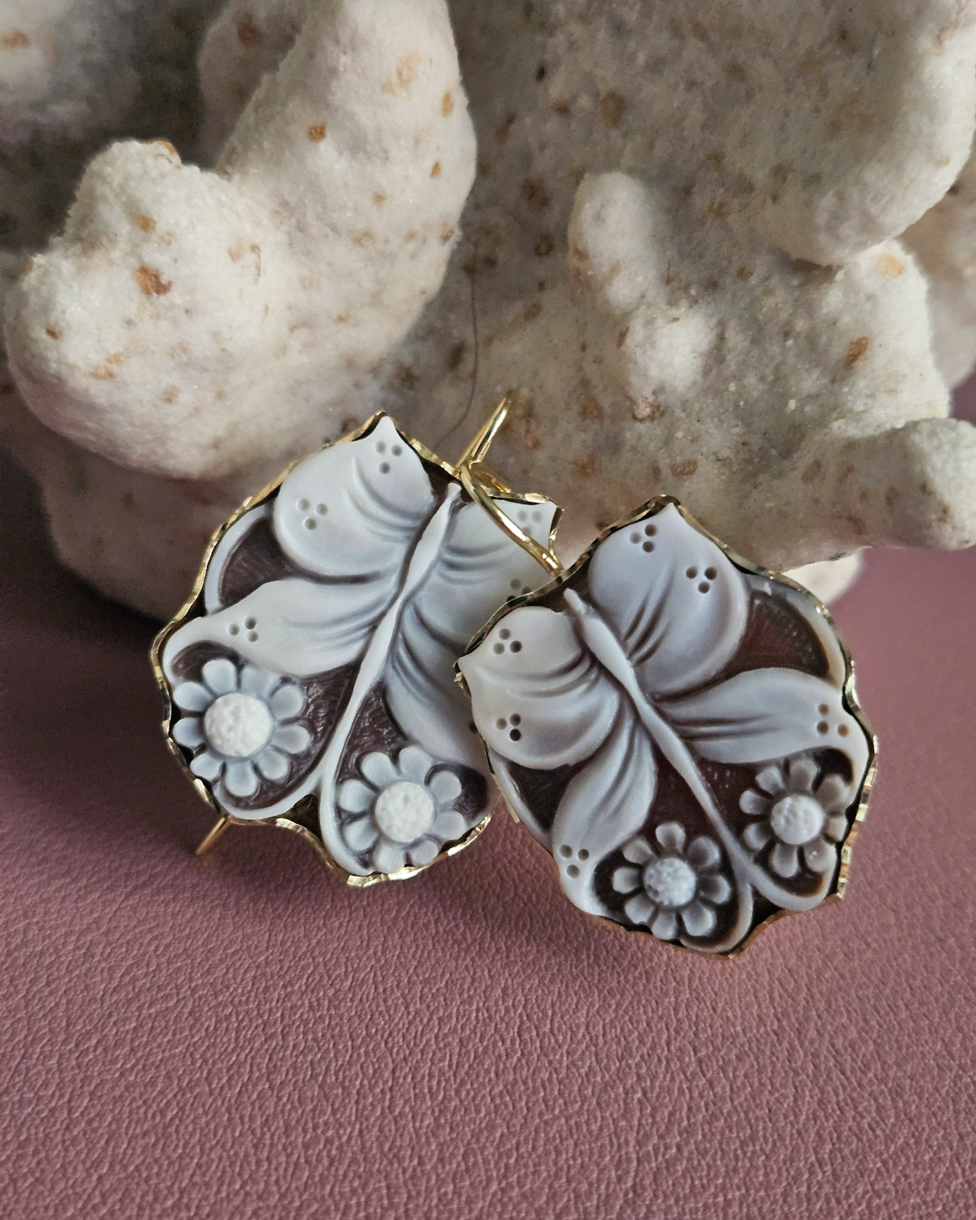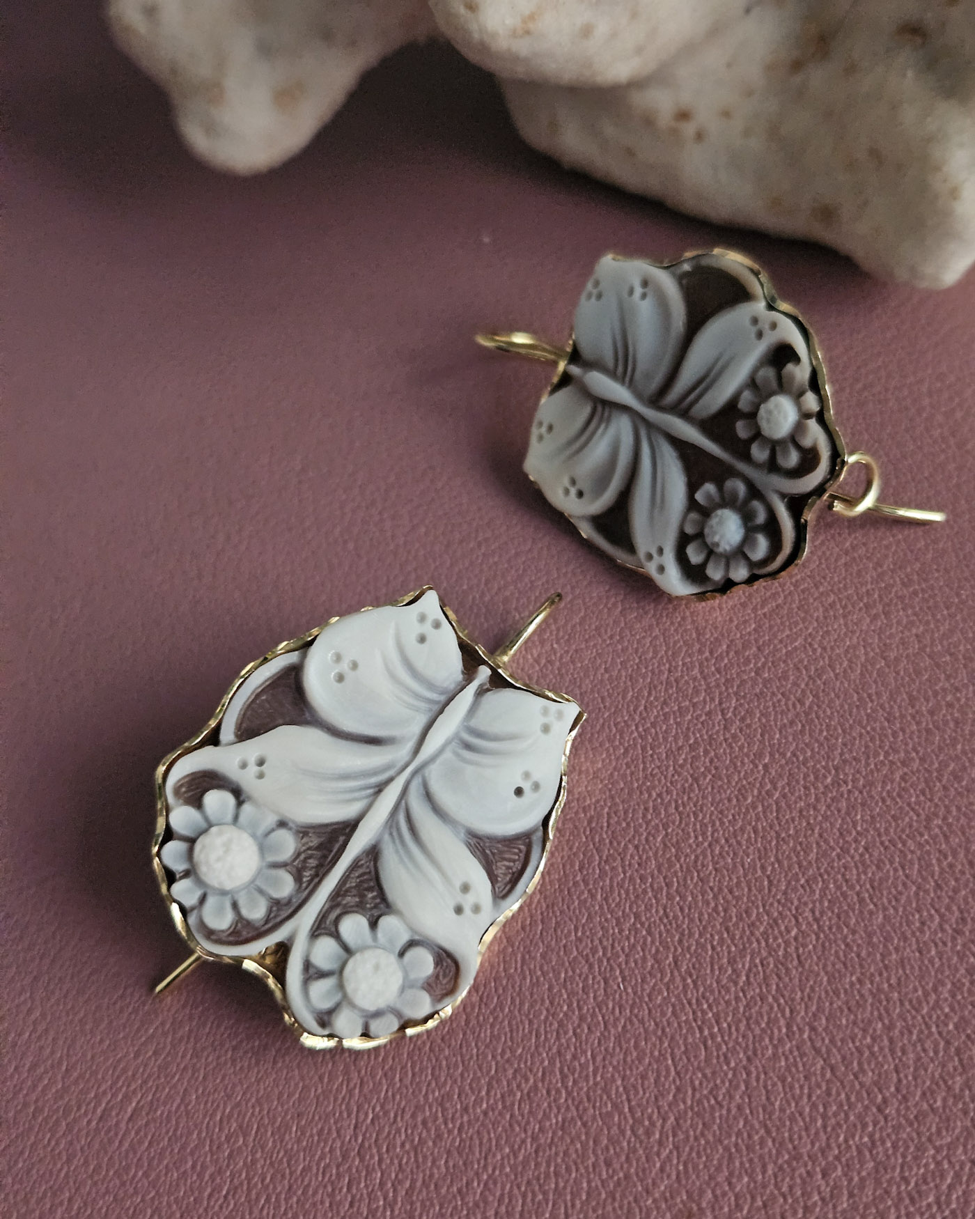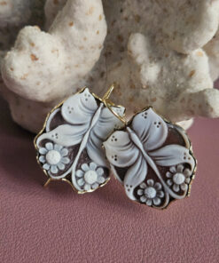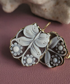 Each cameo is carved with extraordinary precision, where the butterfly comes to life near flowers with soft, perfectly defined petals, modeled one by one with a sure hand and artistic sensitivity. The natural contrast of the sardonic shell enhances the reliefs, creating depth and movement, while the darker background enhances the purity of the flower, making it luminous and harmonious.