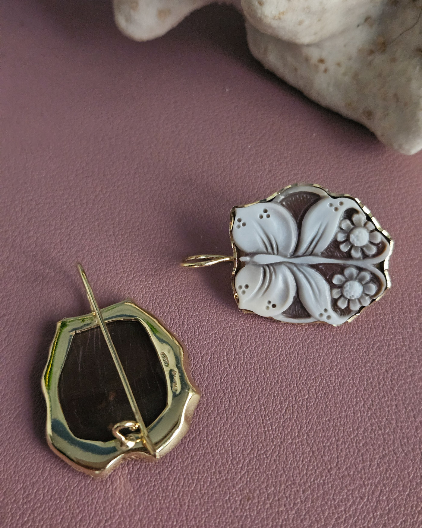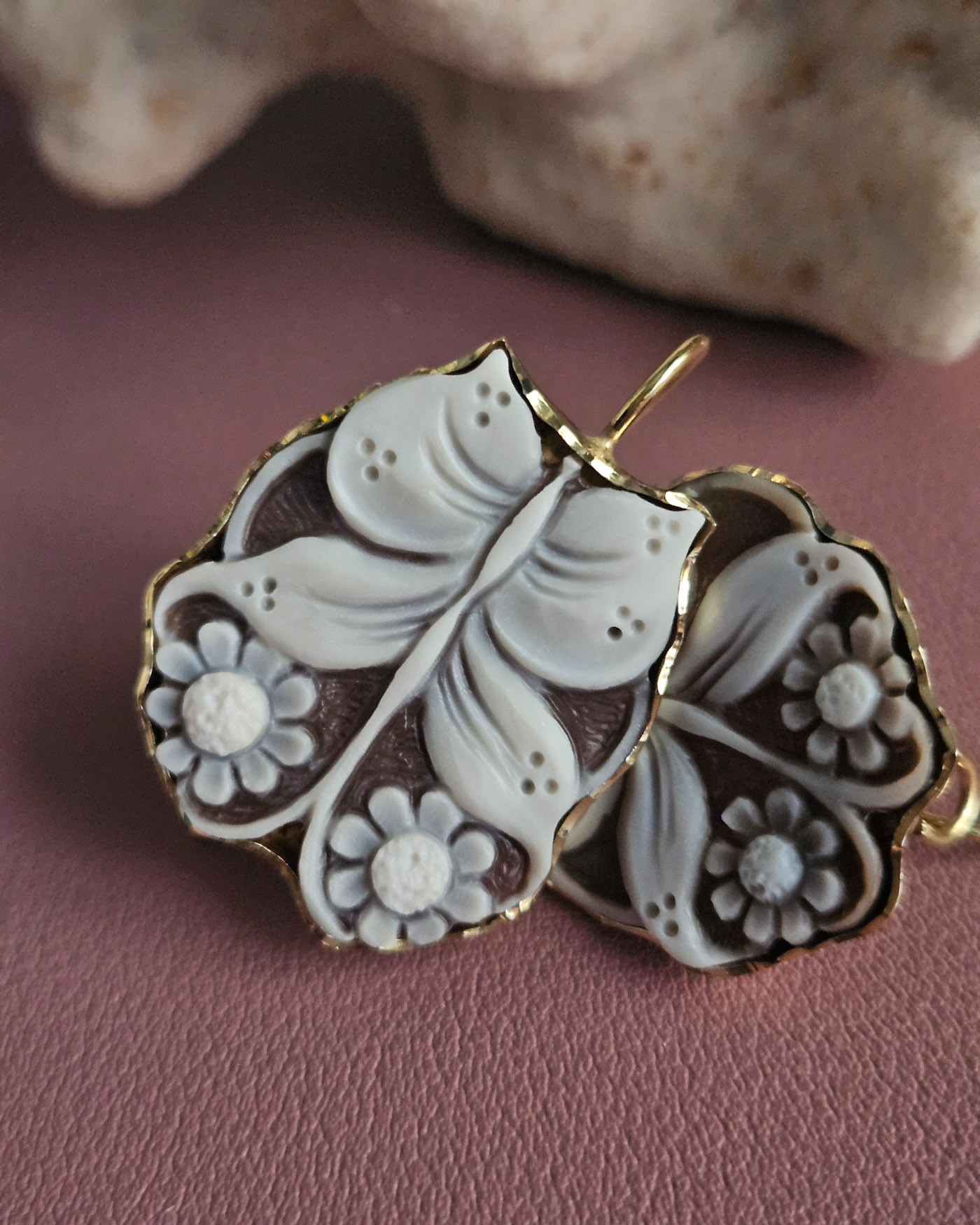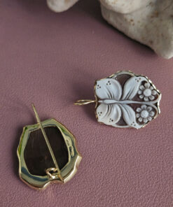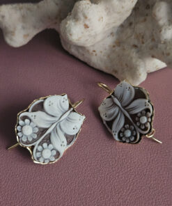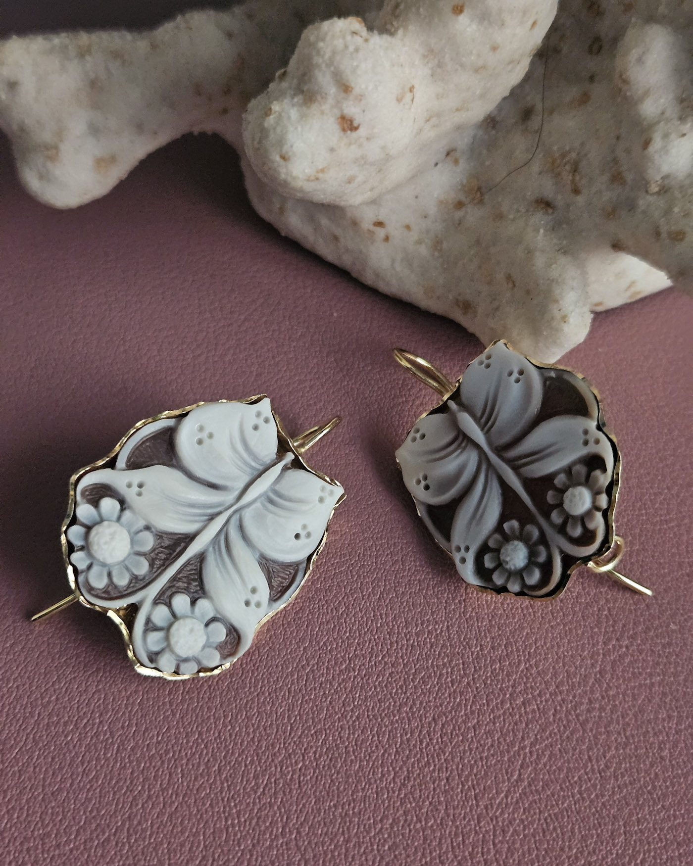 Each cameo is carved with extraordinary precision, where the butterfly comes to life near flowers with soft, perfectly defined petals, modeled one by one with a sure hand and artistic sensitivity. The natural contrast of the sardonic shell enhances the reliefs, creating depth and movement, while the darker background enhances the purity of the flower, making it luminous and harmonious.