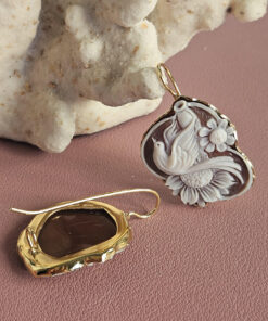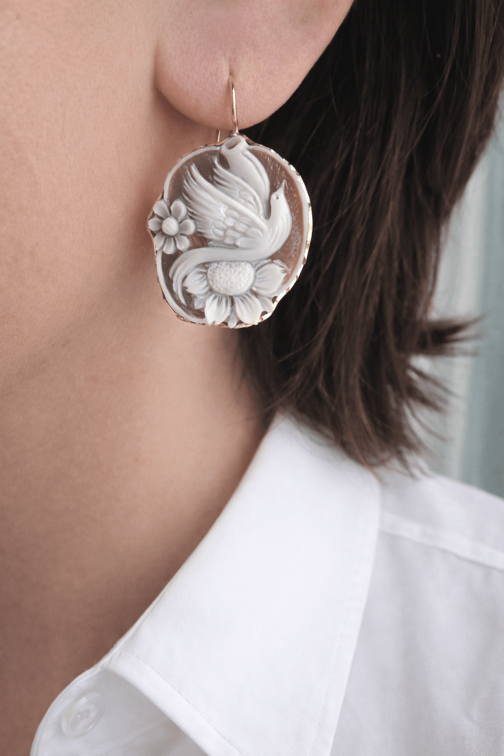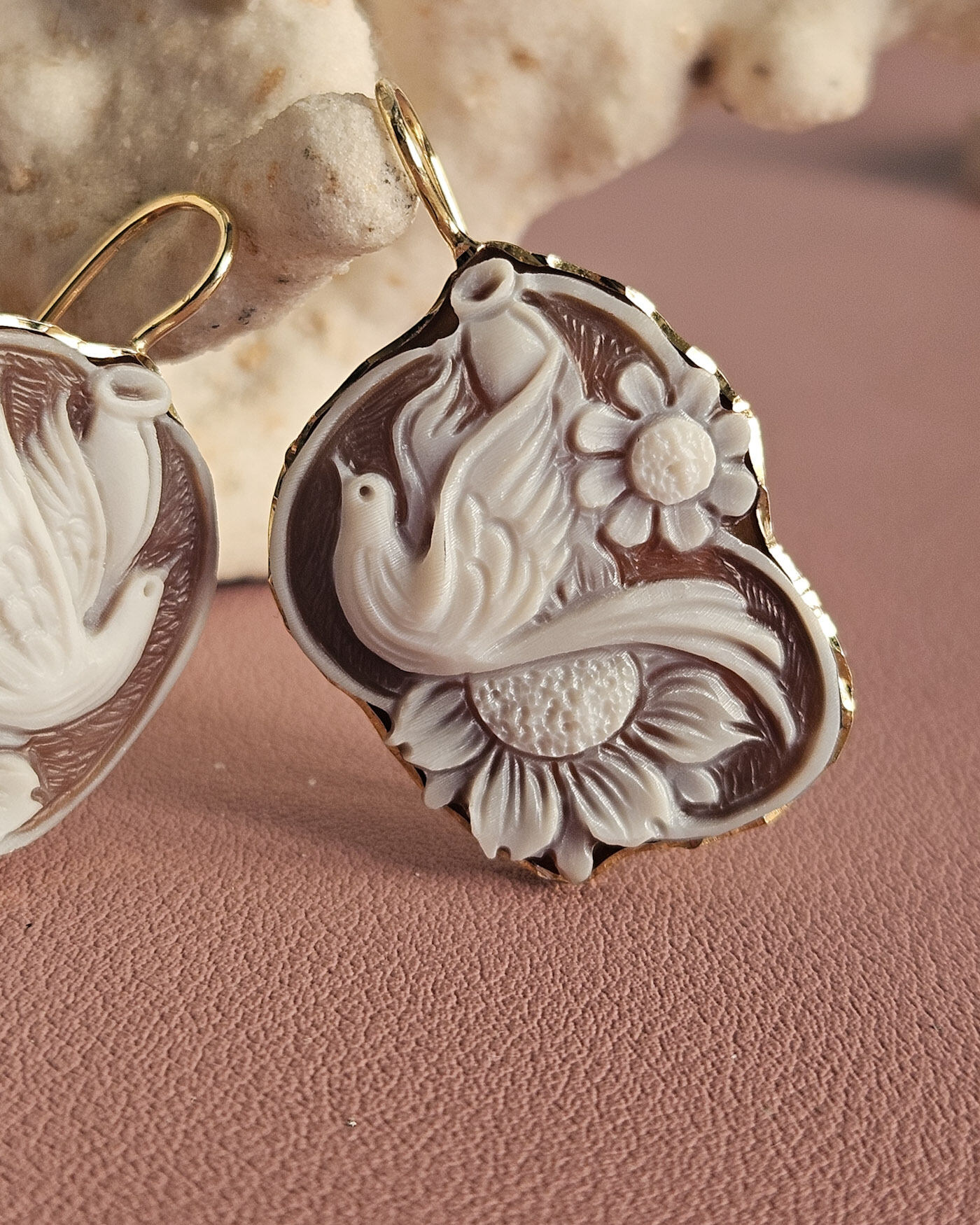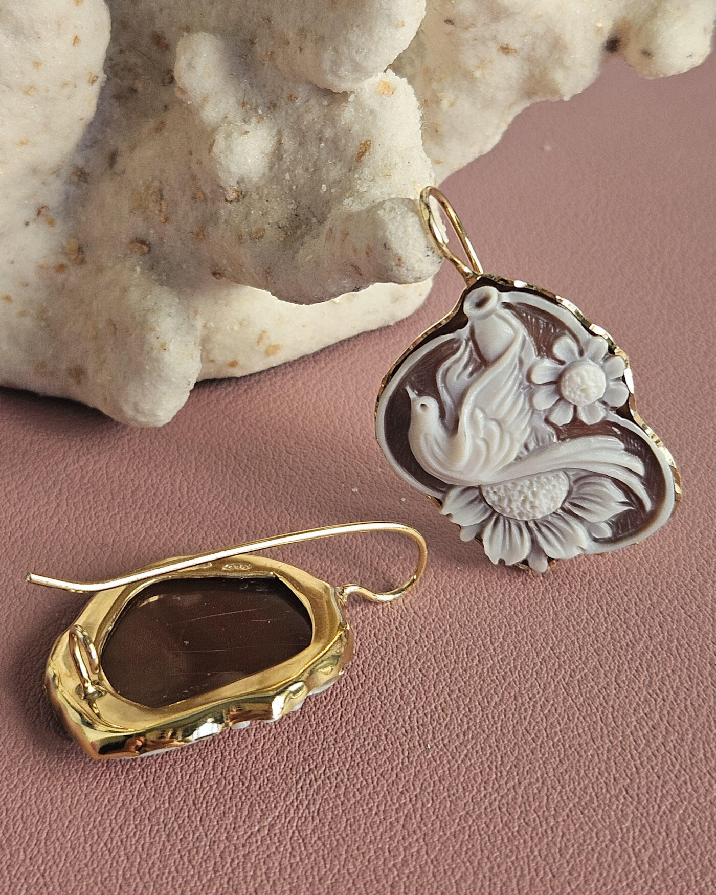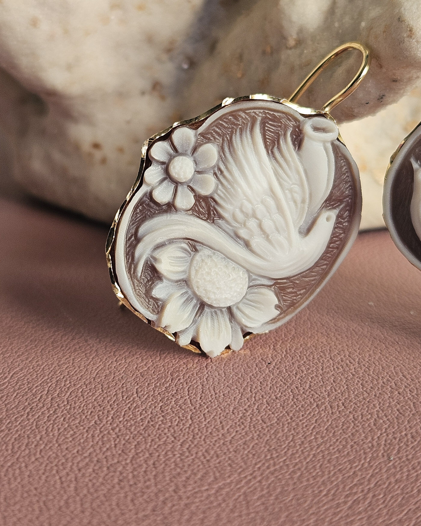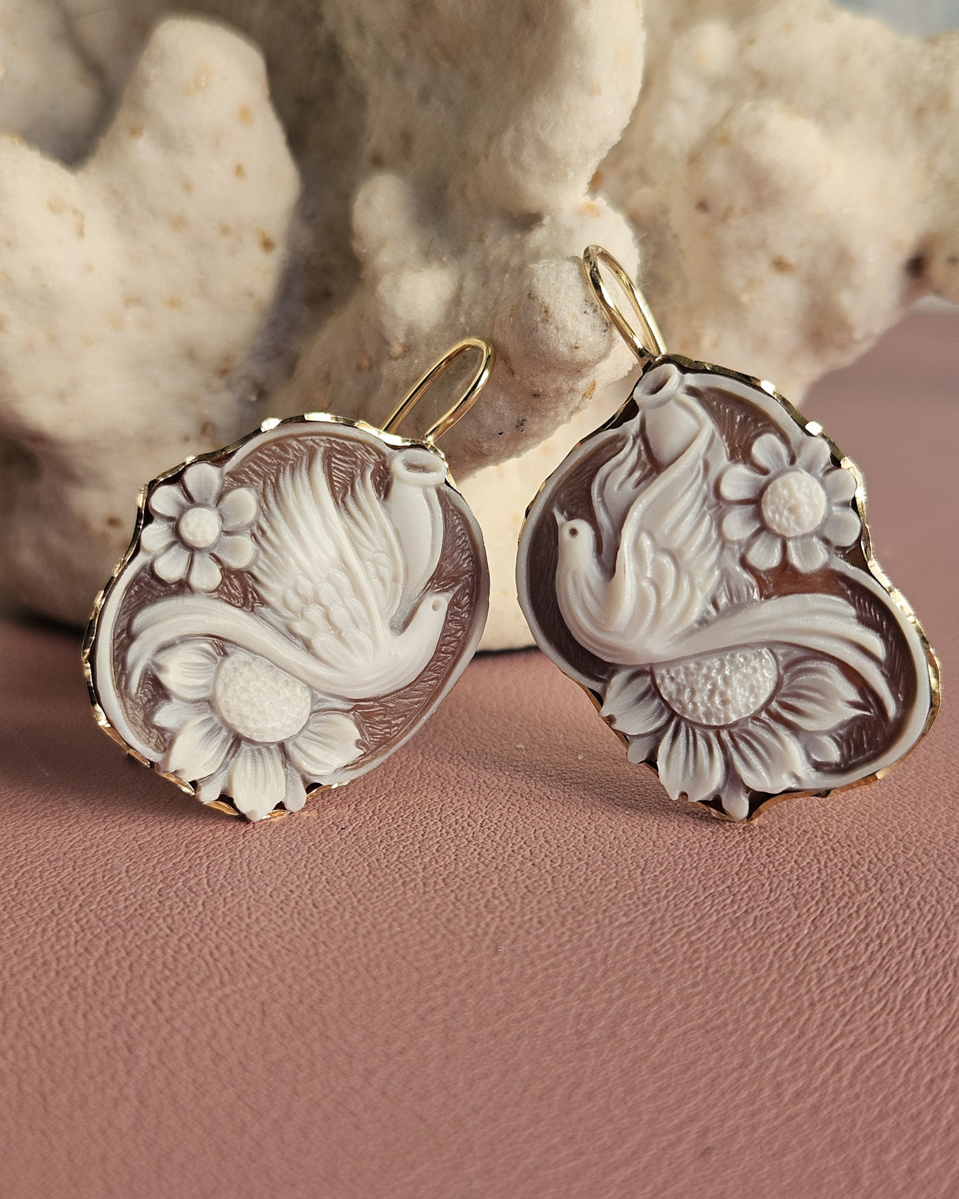 These cameo earrings are a small masterpiece of elegance. Made with delicate engraved cameos, they depict refined flowers and a sinuous dove in flight, in ivory tones that stand out gracefully against the warm background. The careful craftsmanship highlights every detail, creating a refined play of light and shadow that gives depth and character to the jewel.