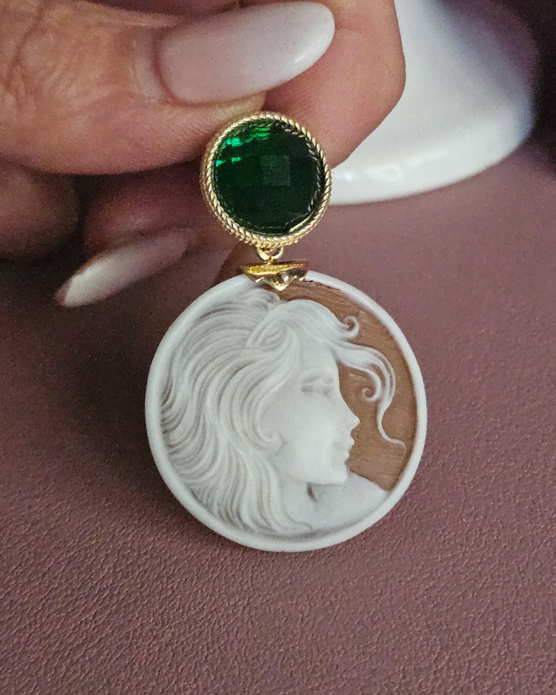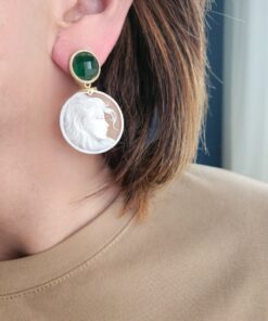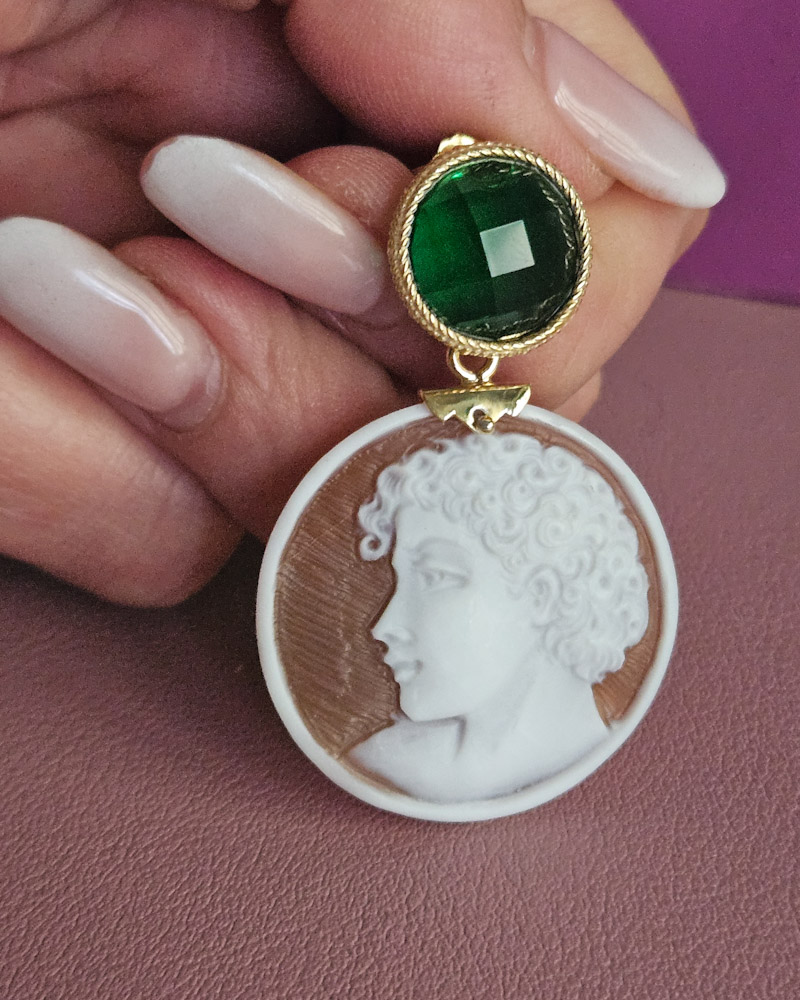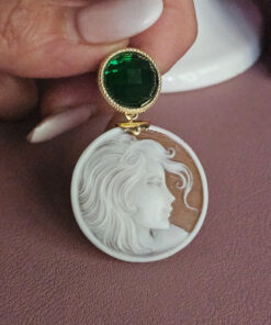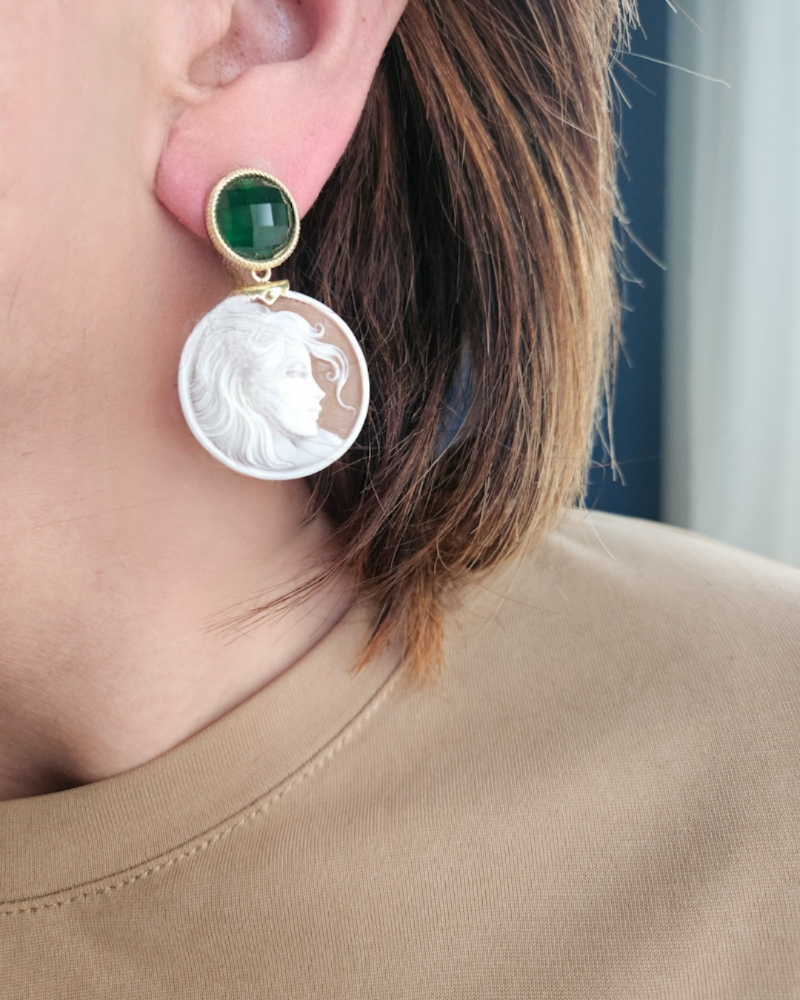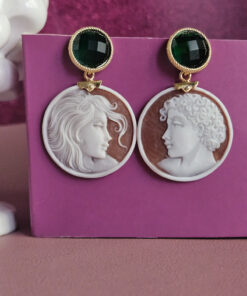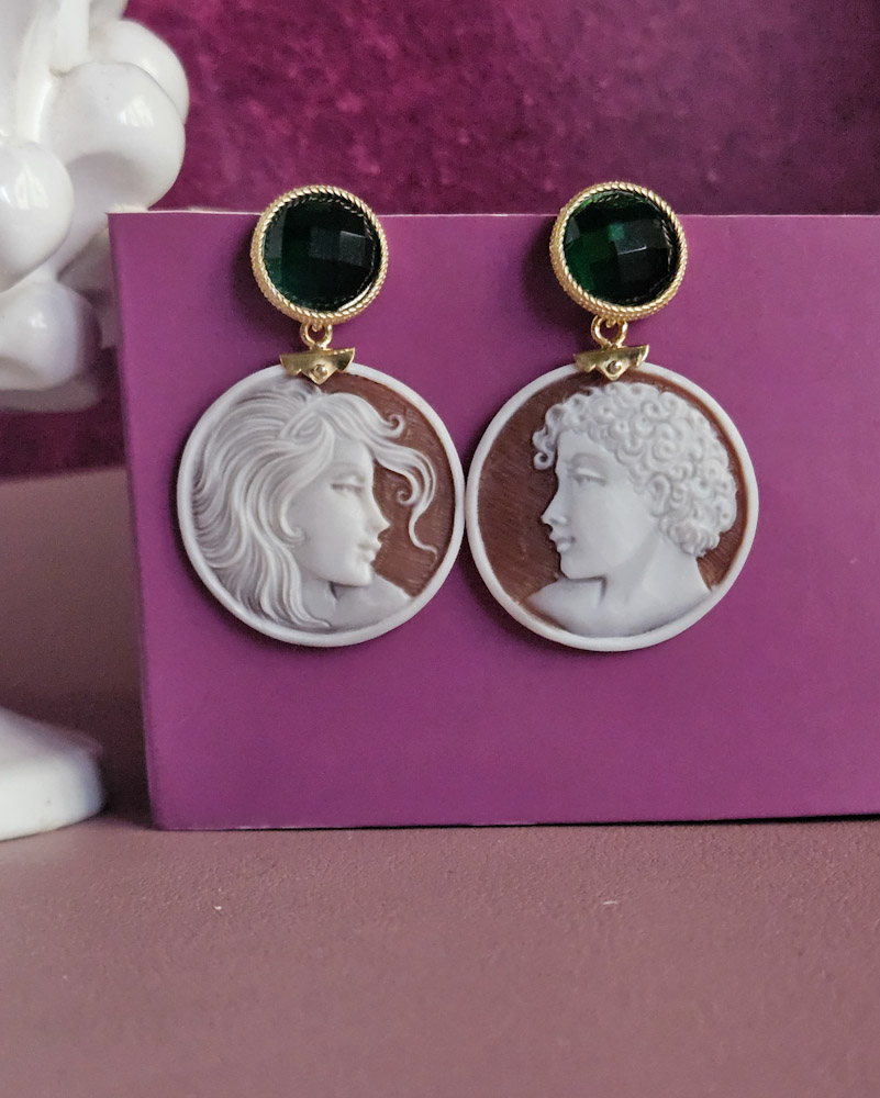 In these earrings, the cameo tradition is renewed in a symbolic and refined key. Two faces, one male and one female, hand carved on authentic shell, face each other and complement each other, as if telling a story as old as the world: that of the balance between opposites, of the meeting of different but complementary identities.