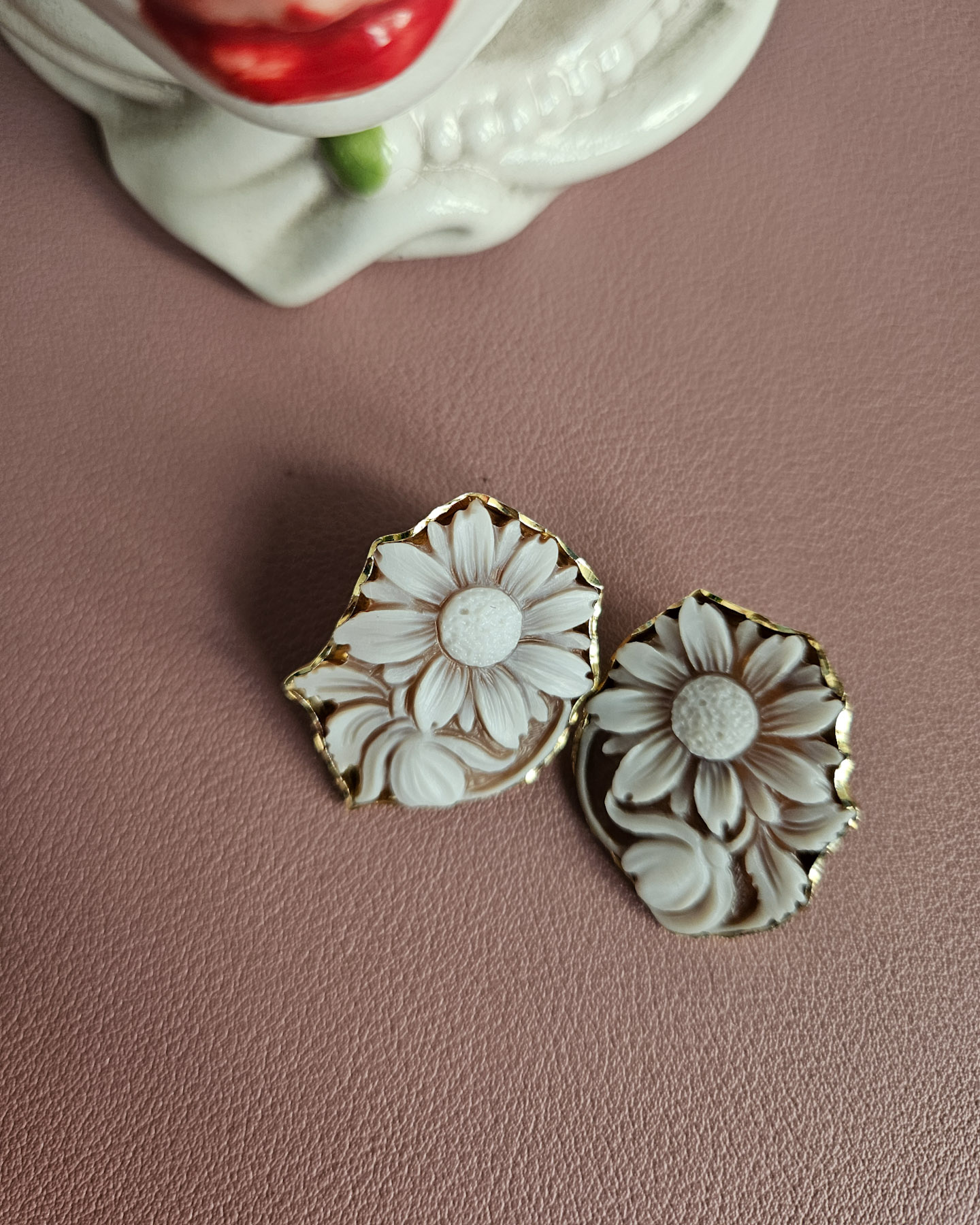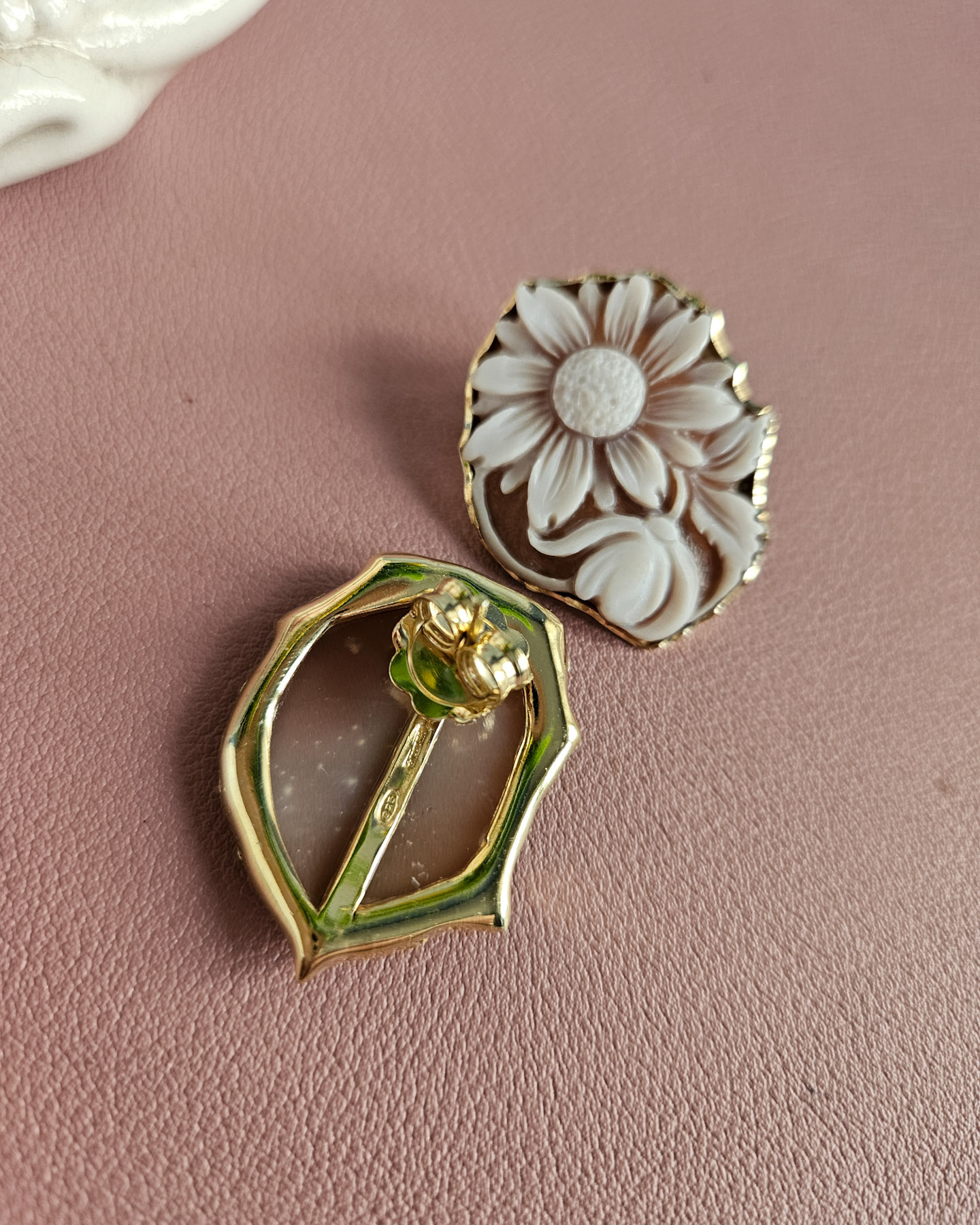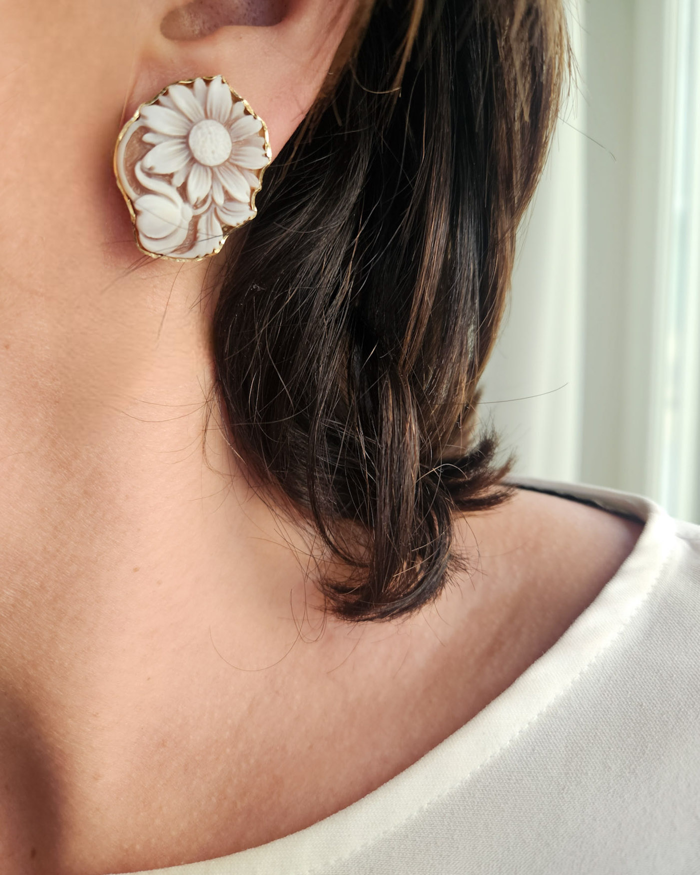 These earrings with daisy cameos in sardonic shell are a true ode to beauty.