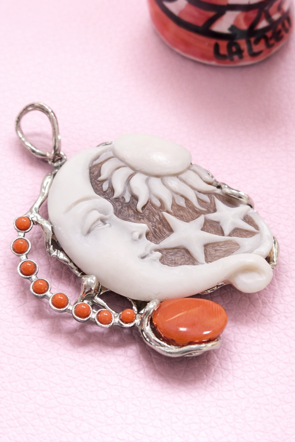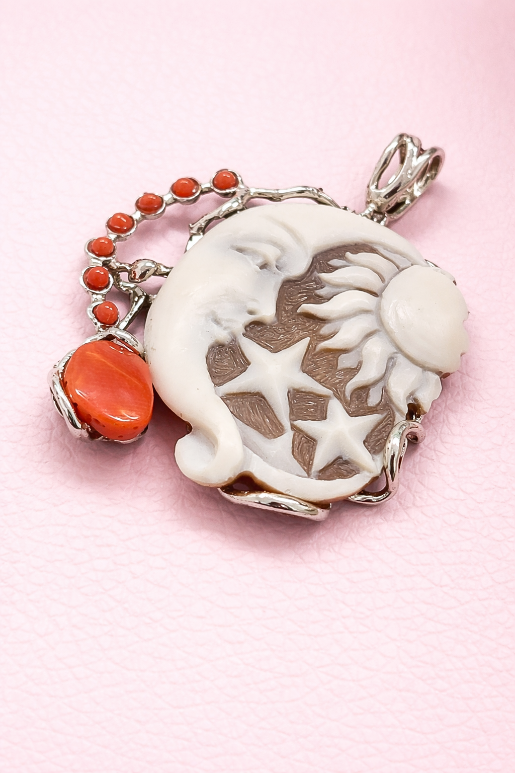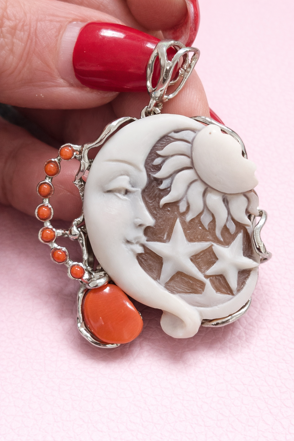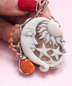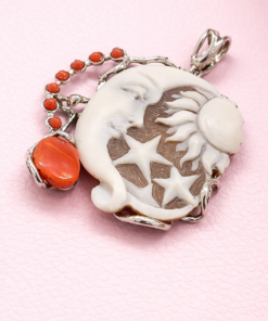 A pendant with an authentic cameo of rare beauty. A skillful relief carving depicts a wonderful face, rich in finely detailed features, which leaves you breathless with its precision and beauty. All enriched with natural coral.