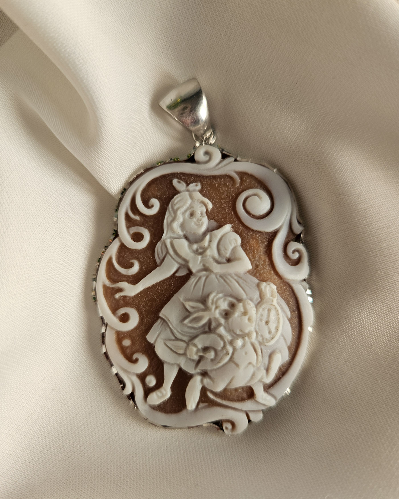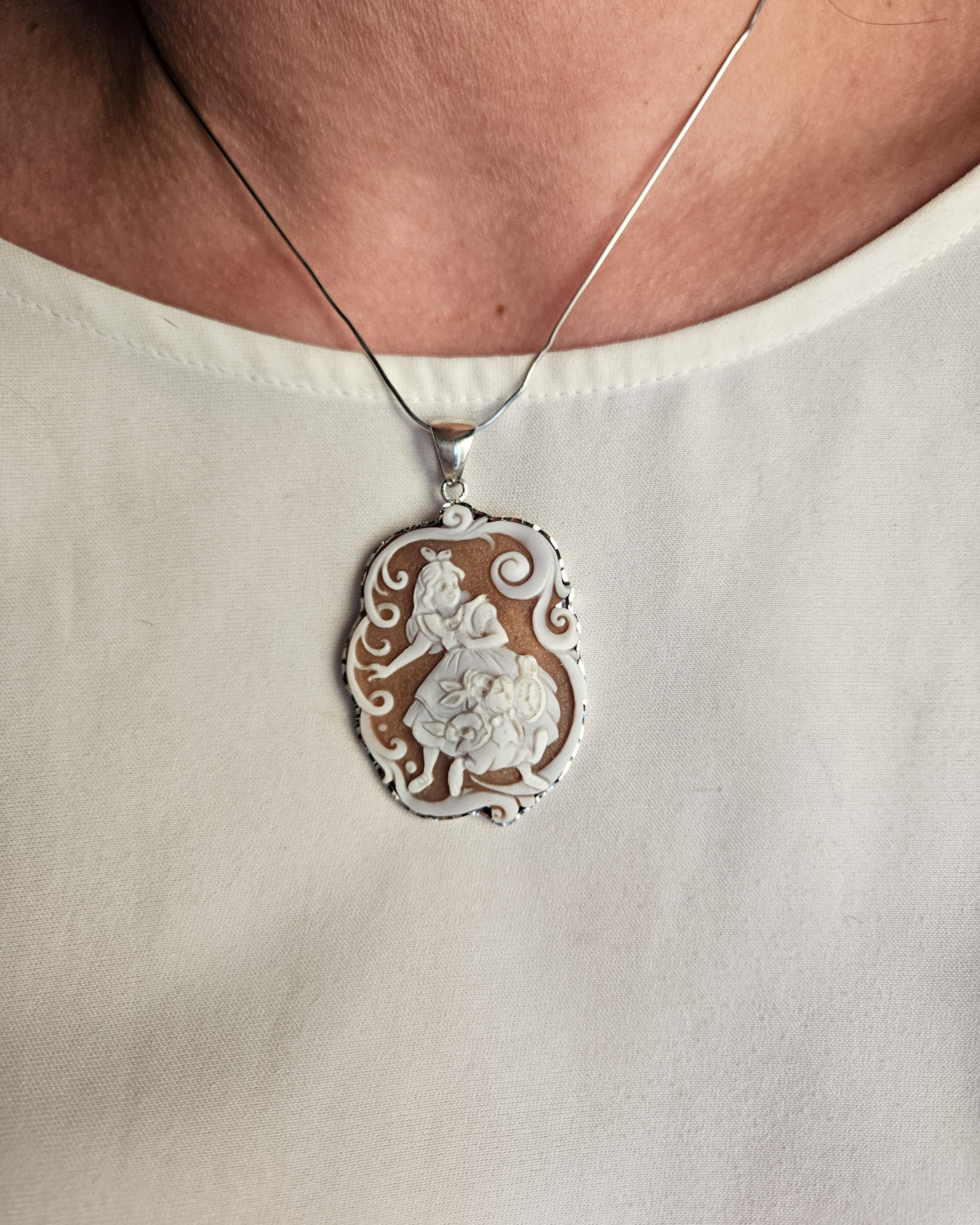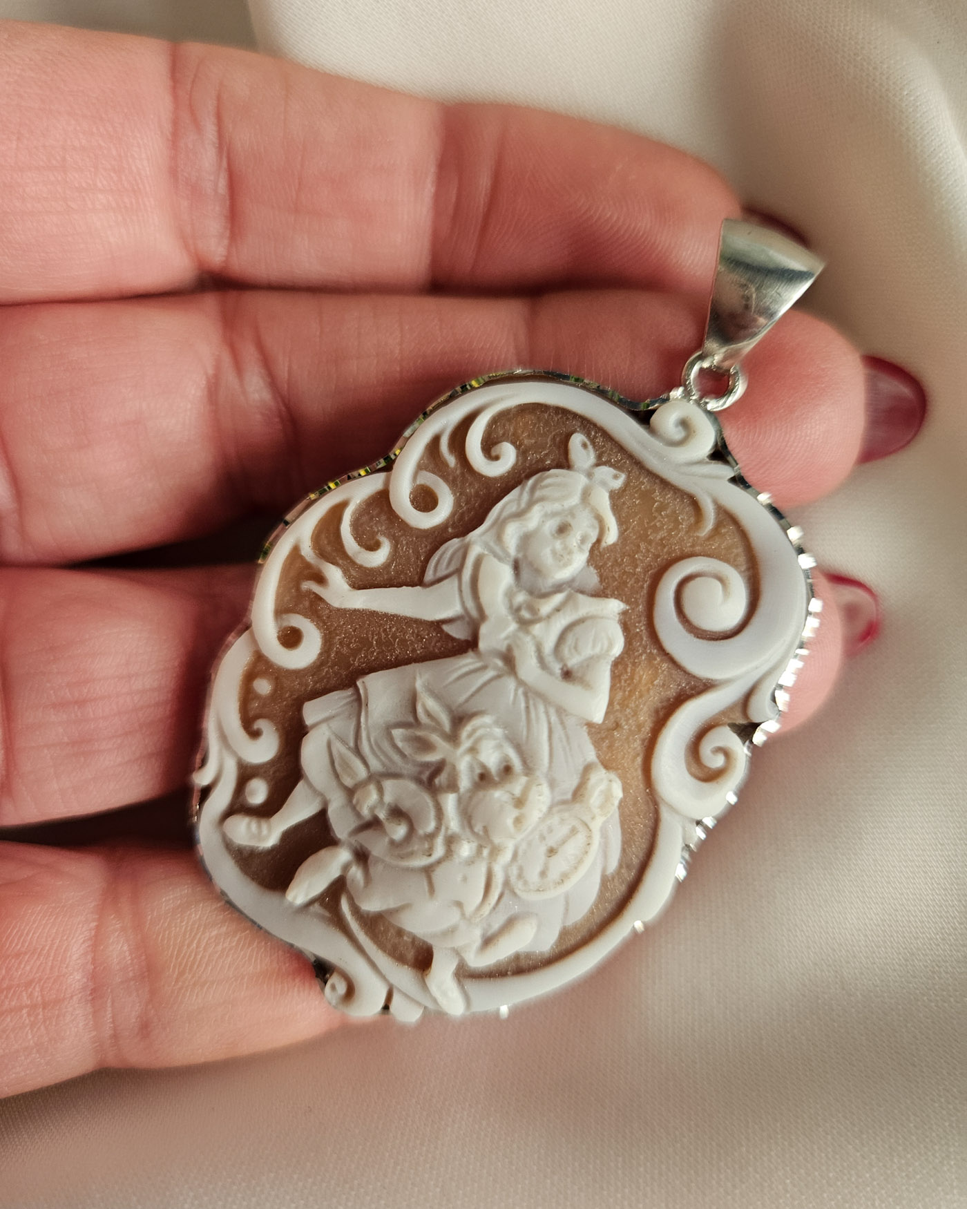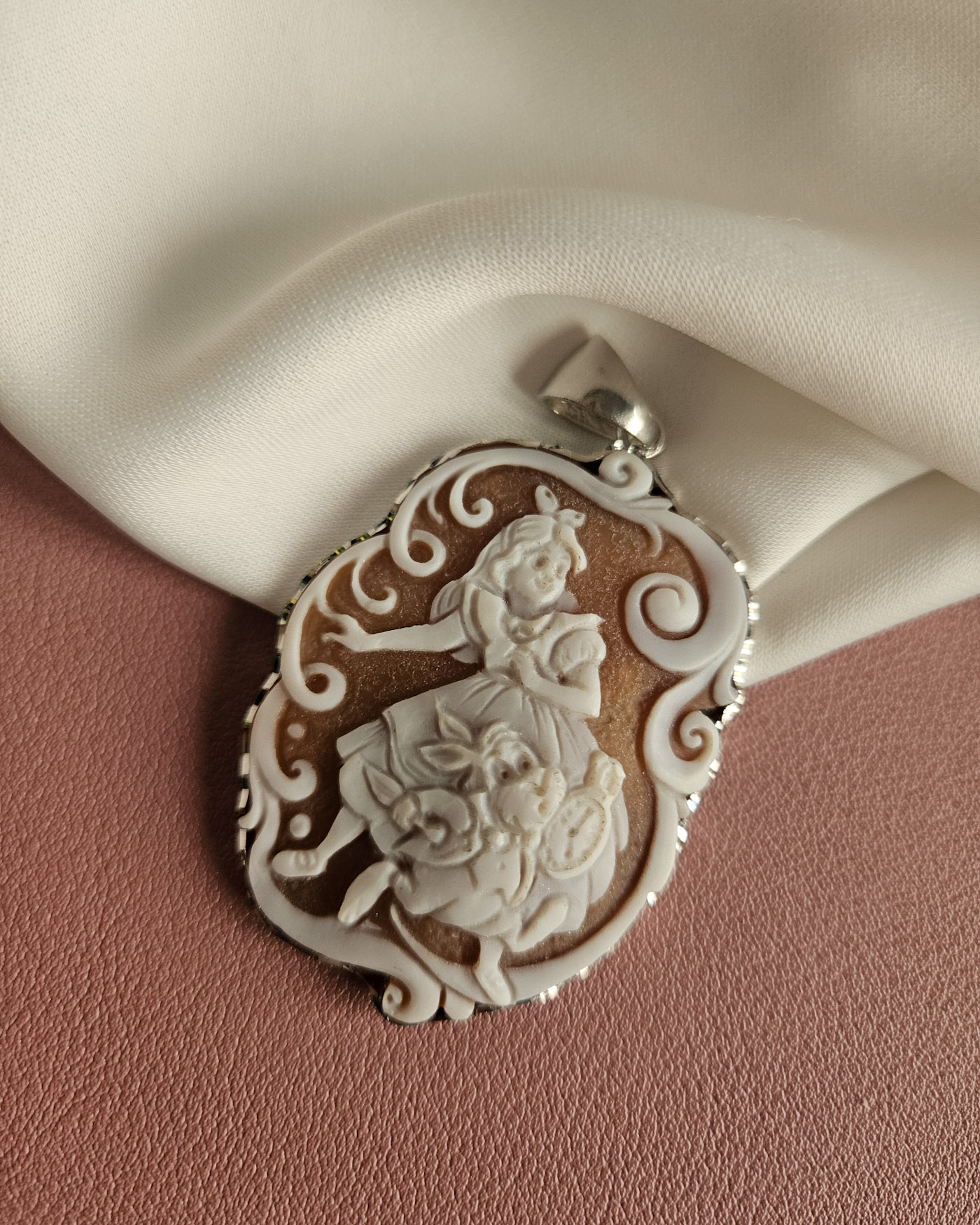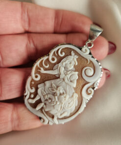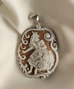A pendant with an authentic cameo of rare beauty. A skillful relief carving depicts a wonderful face, rich in finely detailed features, which leaves you breathless with its precision and beauty. All enriched with natural coral.
