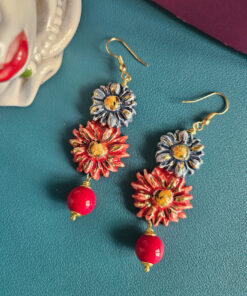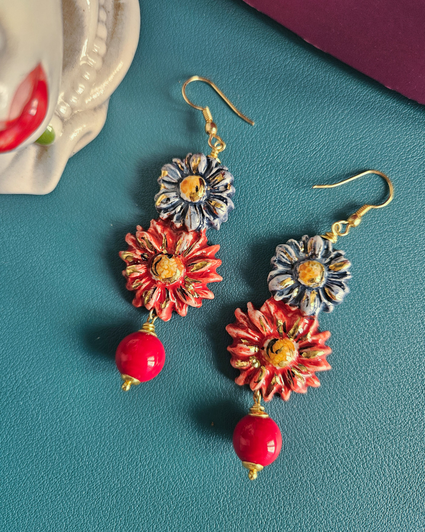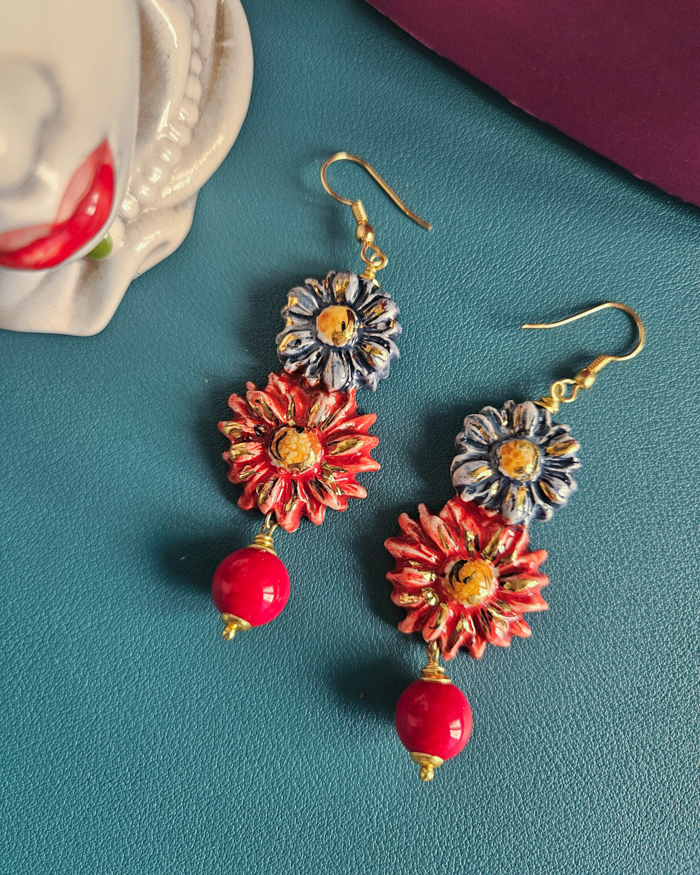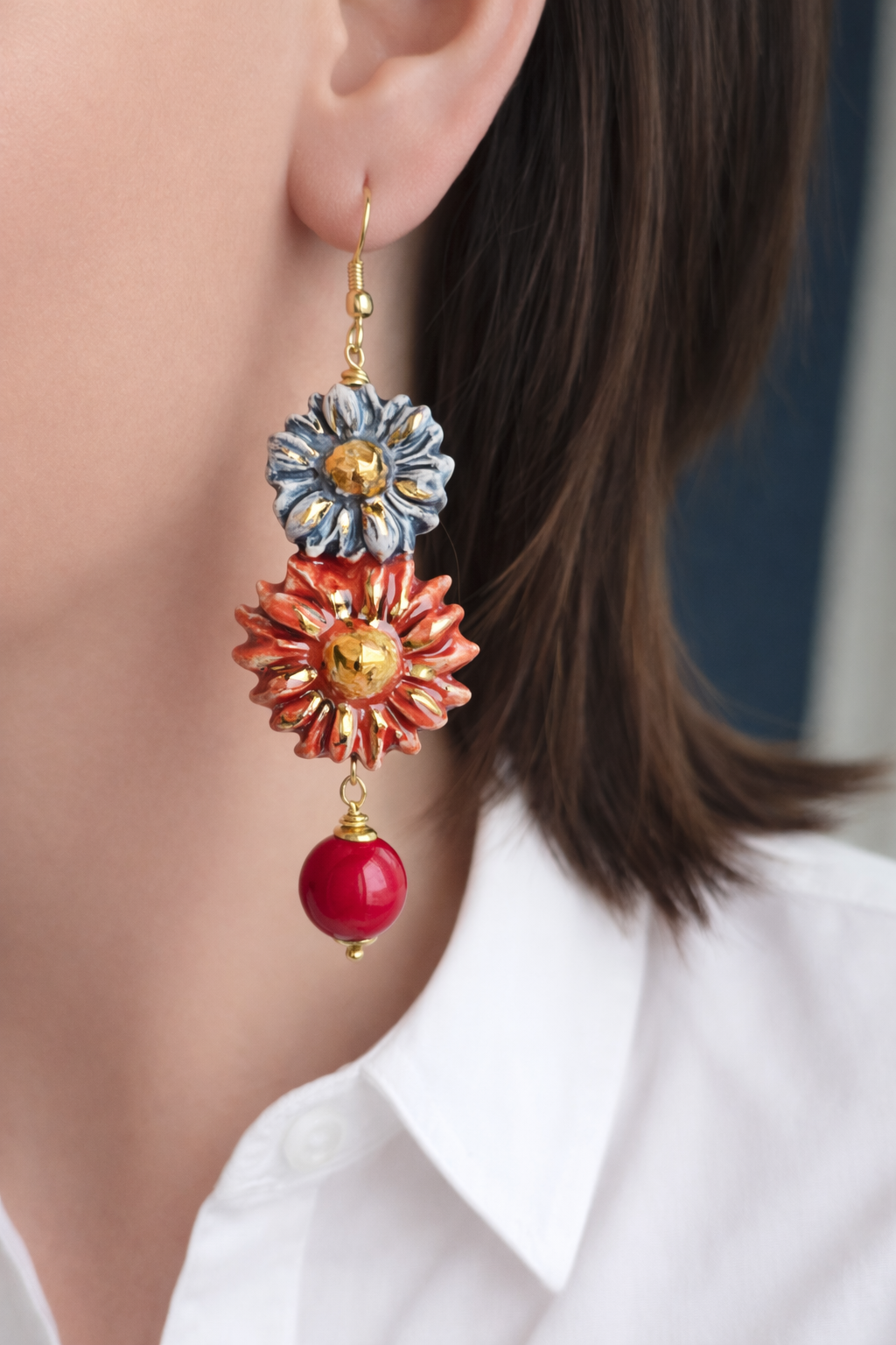 These handmade ceramic earrings from Caltagirone feature a double flower composition with petals modeled one by one, slightly wavy, which give depth and character to the design. The glazing in shades of red and blue creates a refined textural effect, while the gold details applied with a brush illuminate the petals with elegant touches of light. At the center of each flower stands out a warm orange core.