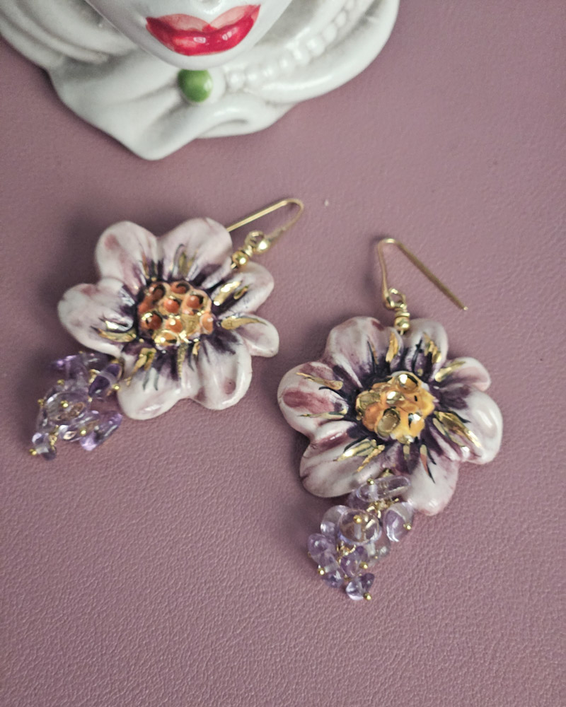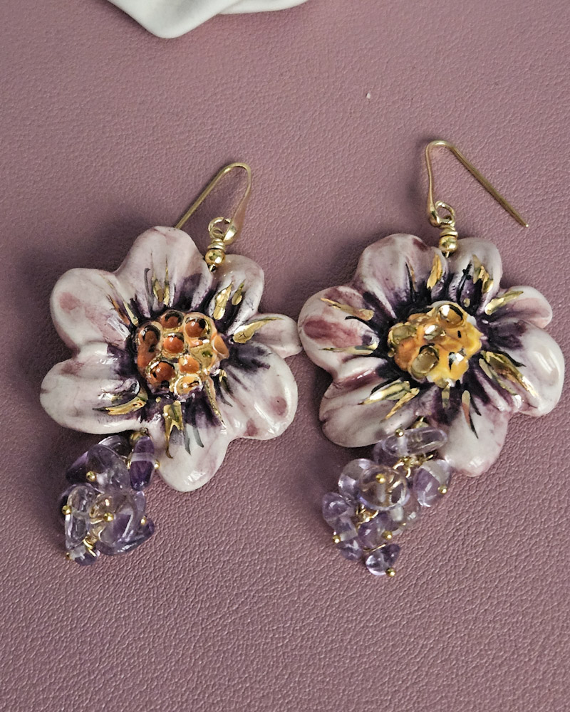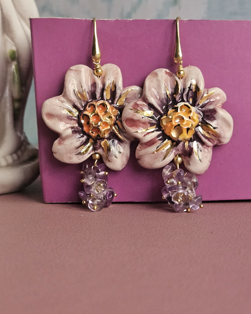 Sicilian Earrings with Ceramic Flowers and Amethyst Stones