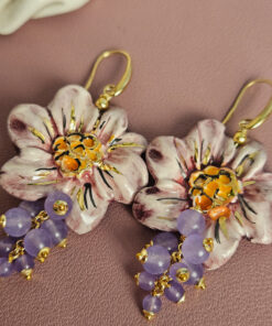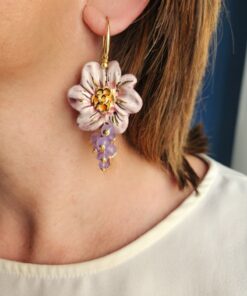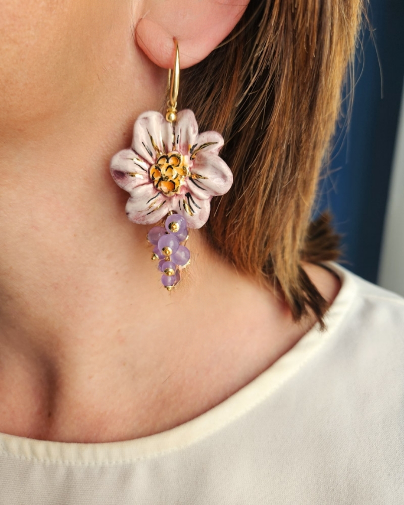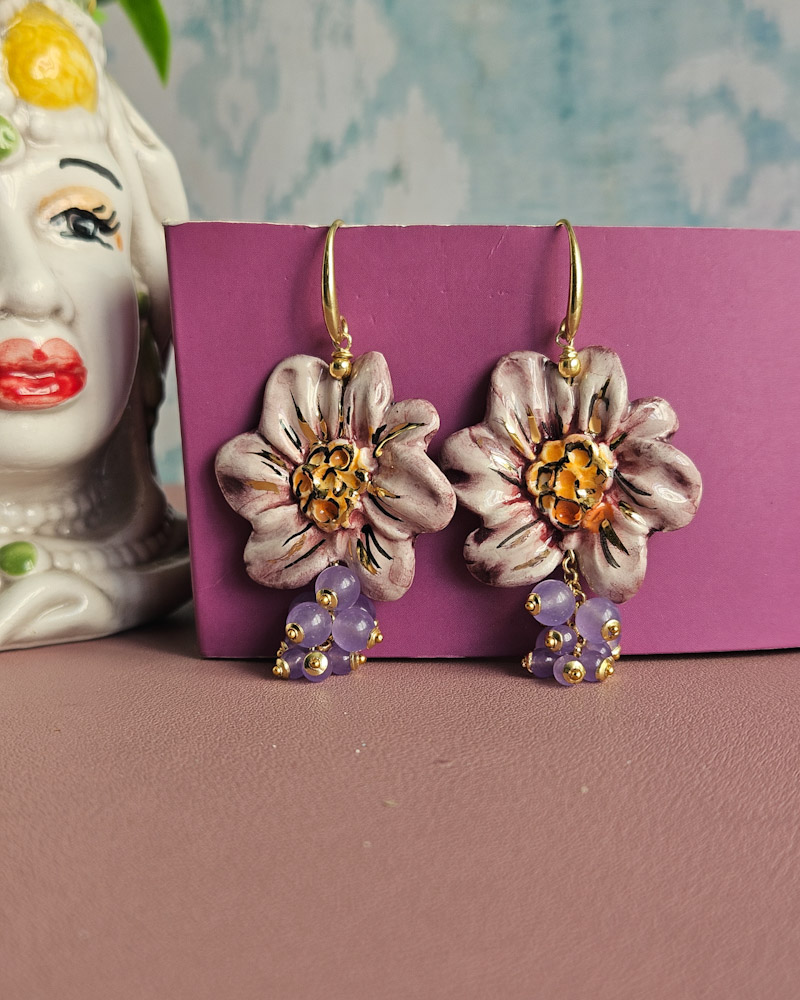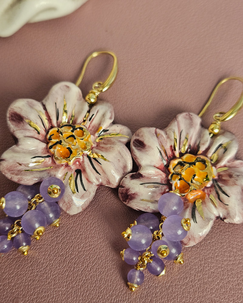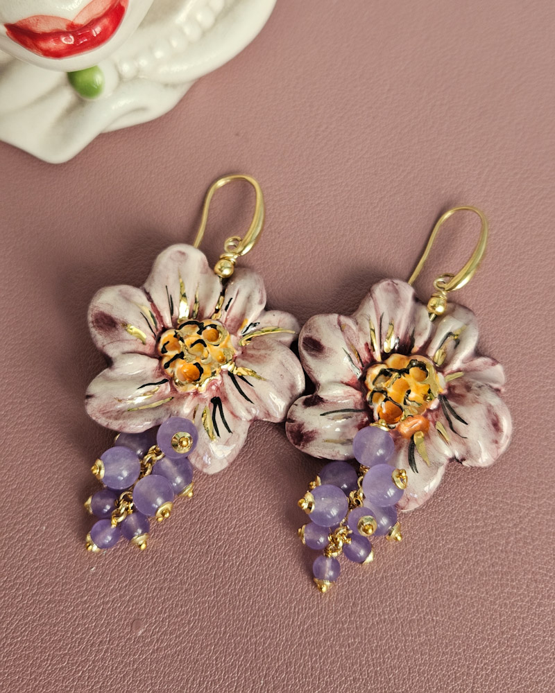 Sicilian Earrings with Ceramic Flowers and Liliac Stones