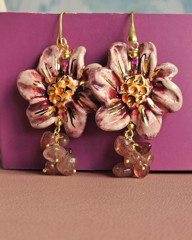 Sicilian Earrings with Ceramic Flowers and Strawberry Quartz Chips