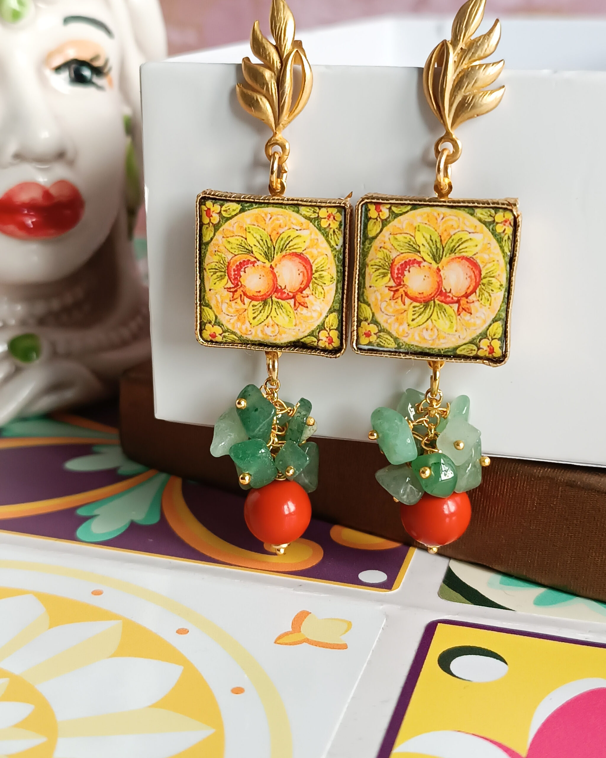 Sicilian Earrings with Ceramic Tiles and Colourful Stones