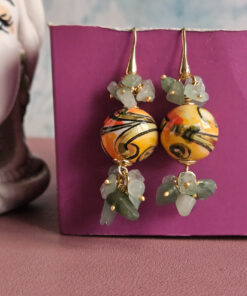 These earrings are made with hand-painted Caltagirone ceramic spheres, featuring a lively decoration in warm yellow tones, with subtle shades that make each piece unique. The glazed surface enhances the colors and highlights the precision of the decoration, the result of careful craftsmanship.