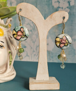 These earrings are made from hand-painted Caltagirone ceramic, featuring floral motifs in rainbow colors and embellished with golden details that enhance the design and finish.