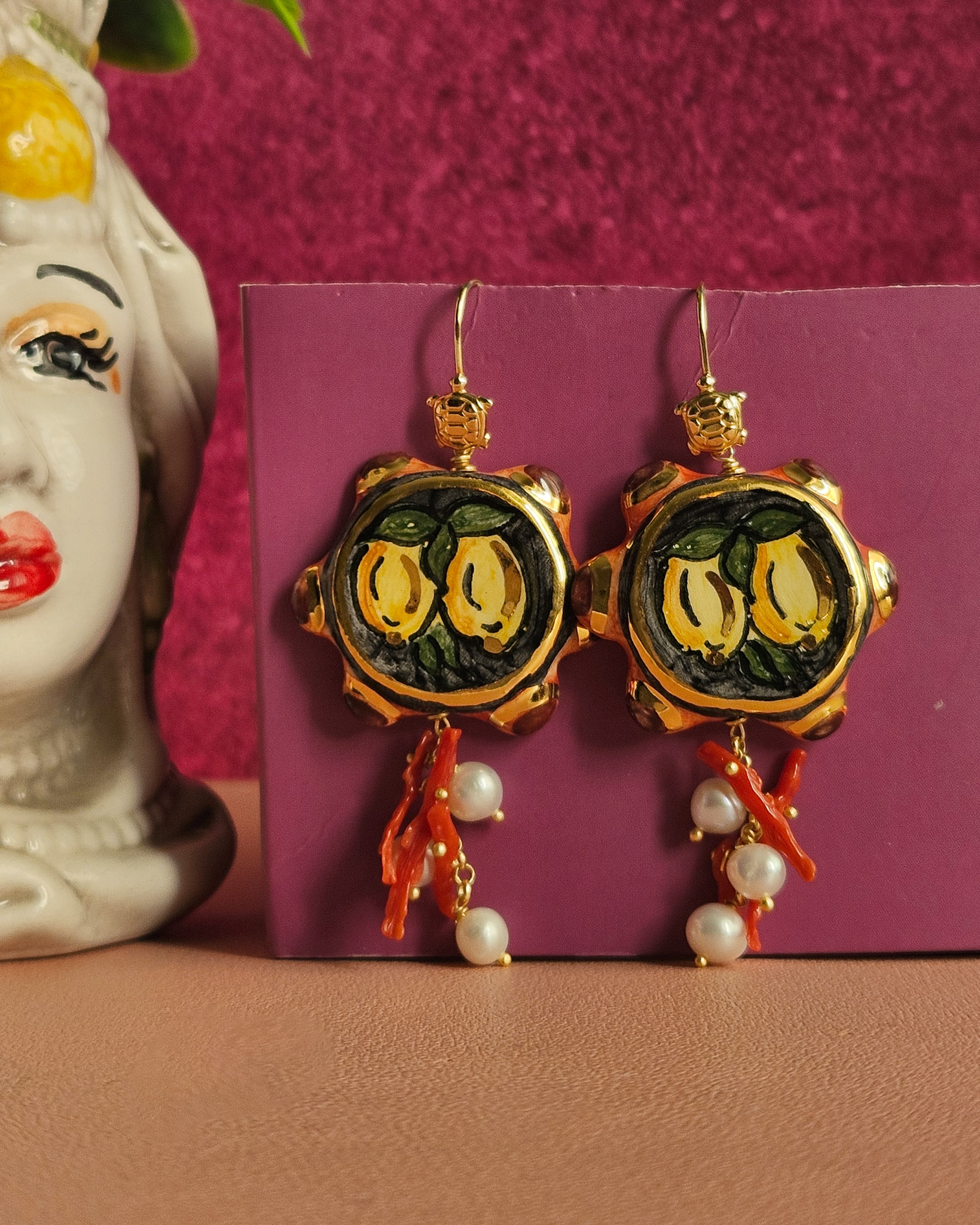 Hand-painted ceramic tambourines from Caltagirone are the stars of these unique earrings, embellished with an elegant cluster of pearls and coral branches. Perfect for those seeking an original and refined style and ideal for giving a distinctive touch to your outfits.