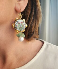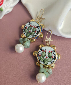 Hand-painted ceramic tambourines from Caltagirone are the stars of these unique earrings, embellished with an elegant Amazonite cluster and a baroque pearl. Perfect for those seeking an original and refined style and ideal for giving a distinctive touch to your outfits.
