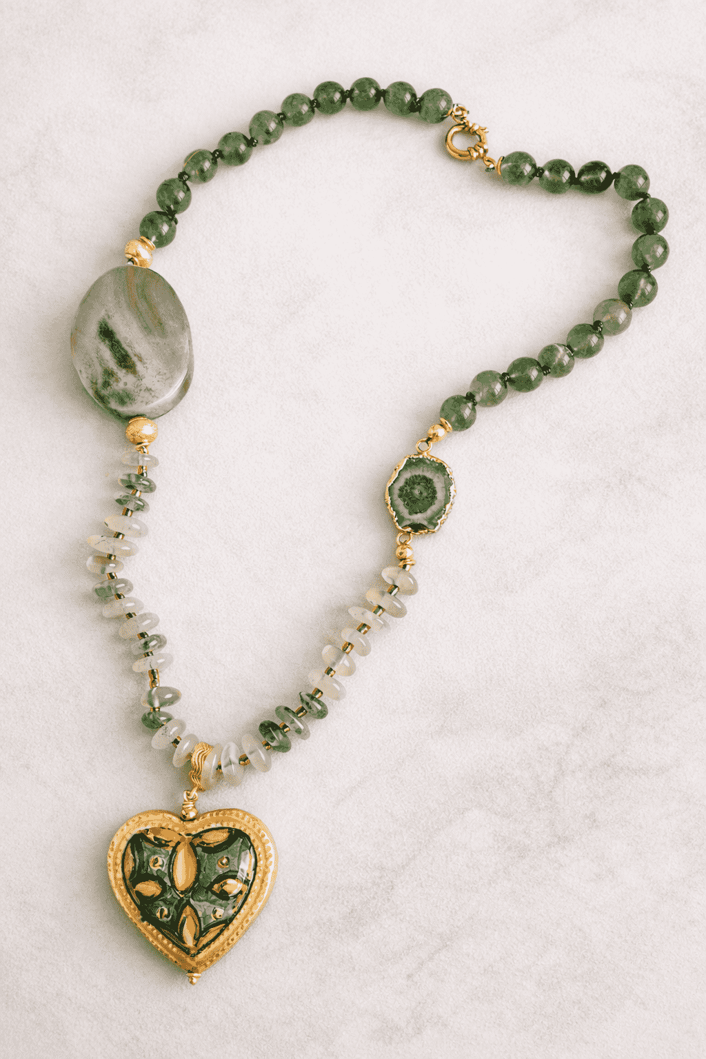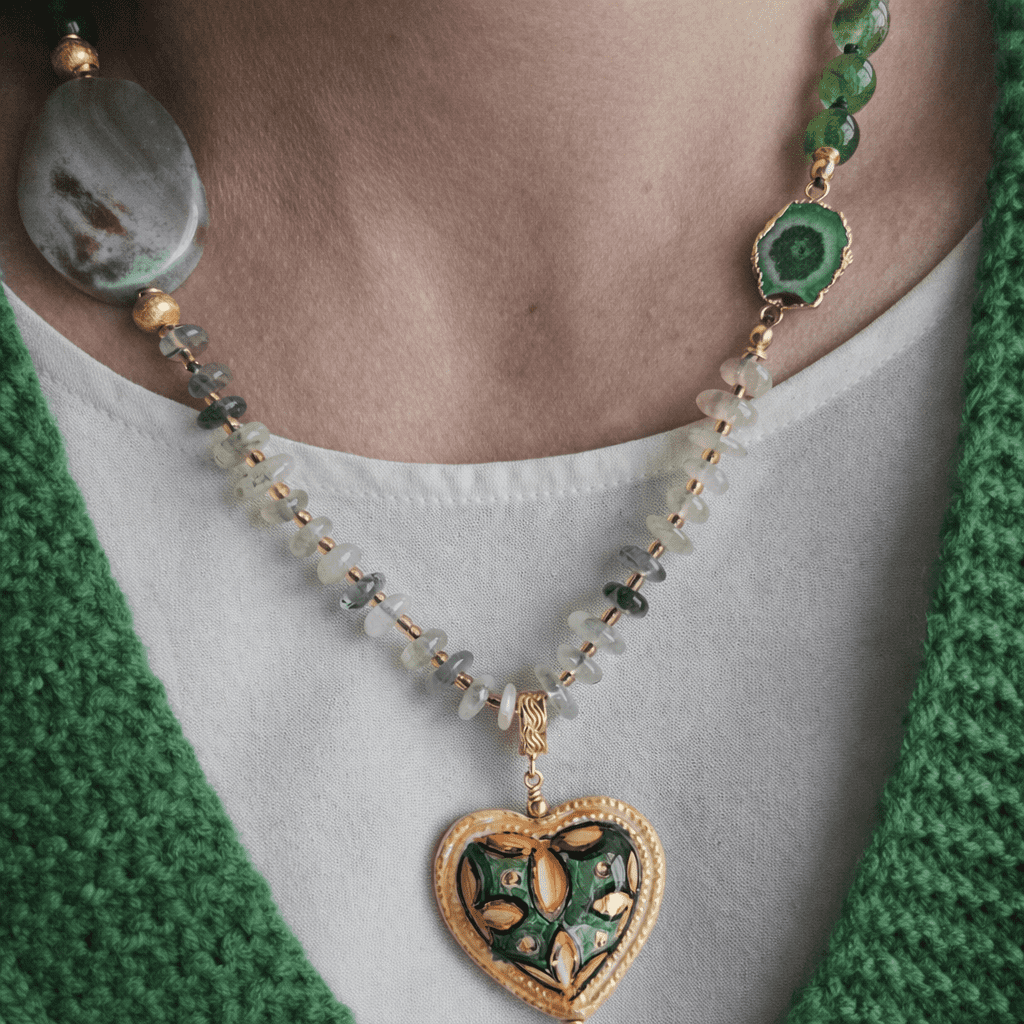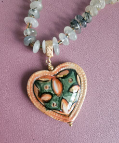 The delightful ceramic heart stands out and blends perfectly with the stones that make up the necklace.