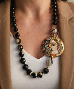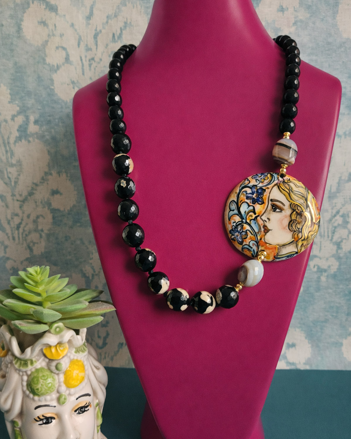 Sicilian Necklace with Black Onyx, Madagascar Stones, and a Caltagirone Ceramic
