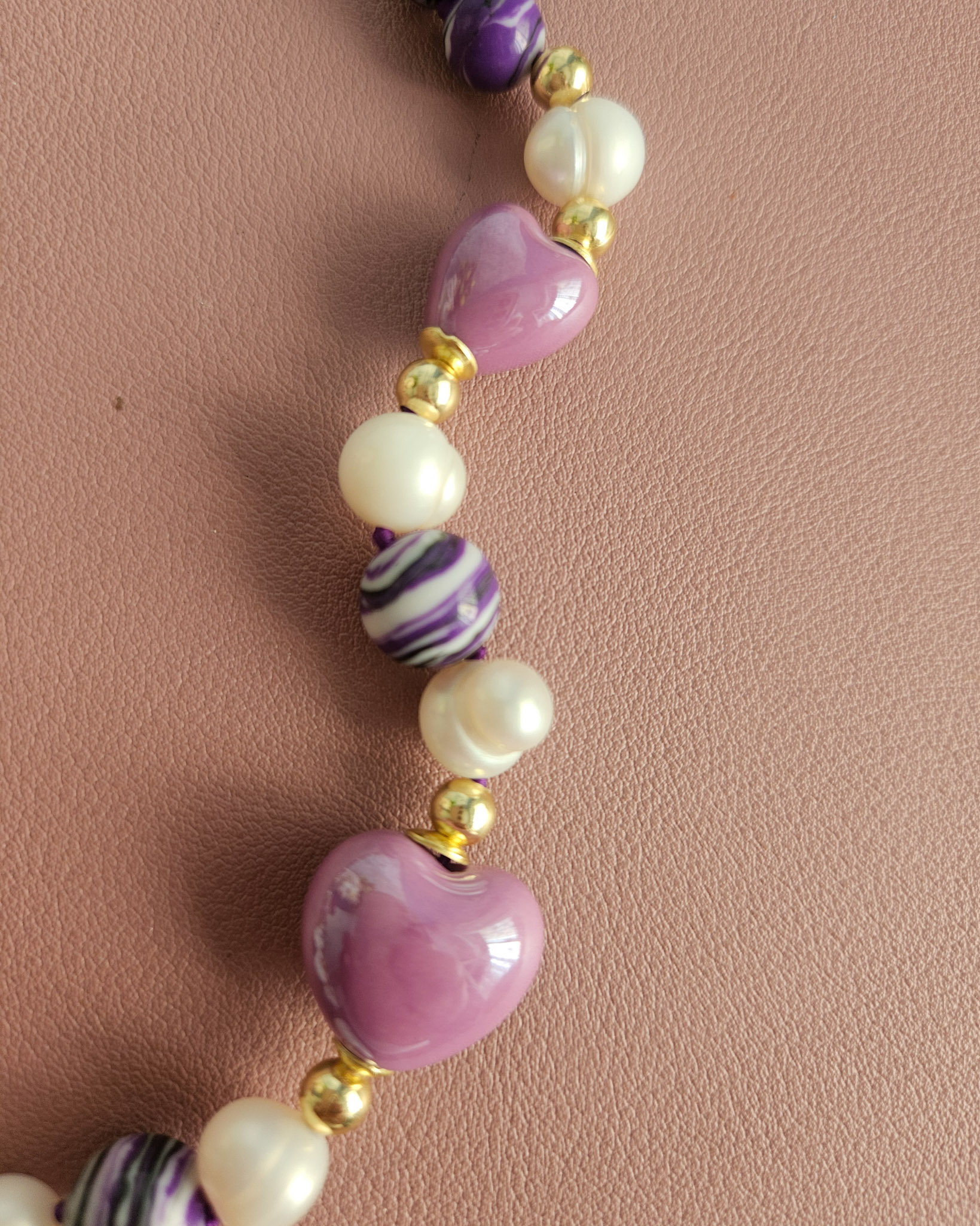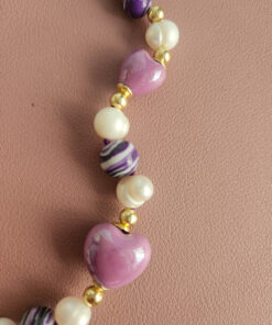 Shades of purple and lilac intertwine with the purity of the pearls, illuminated by small golden details.