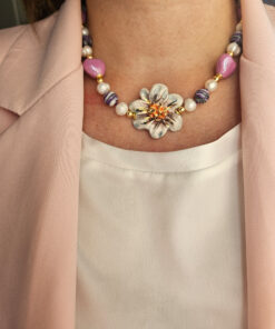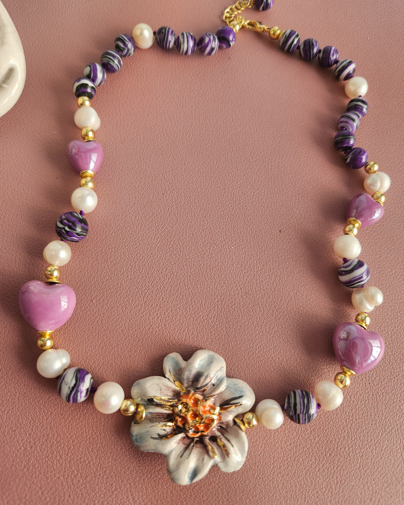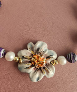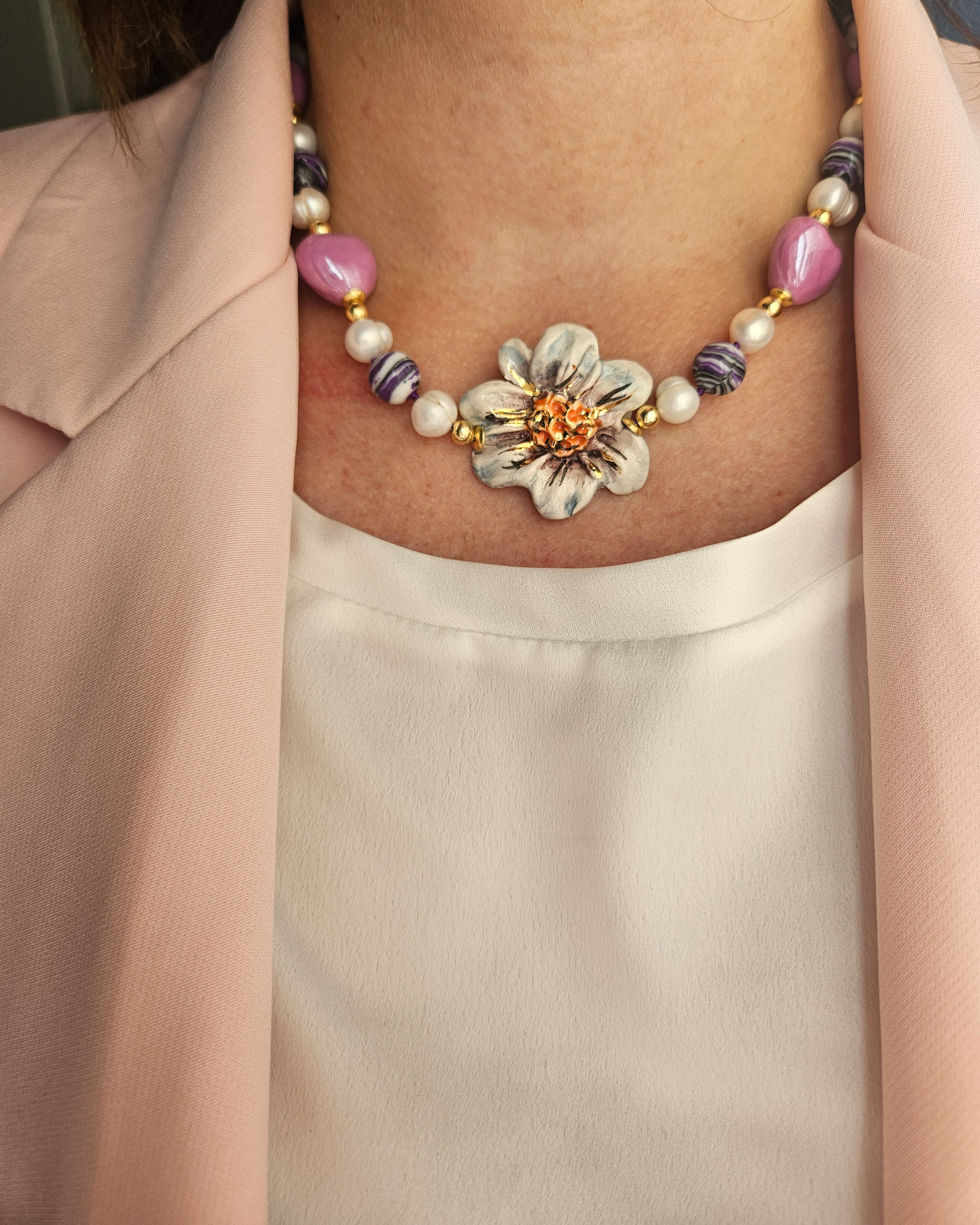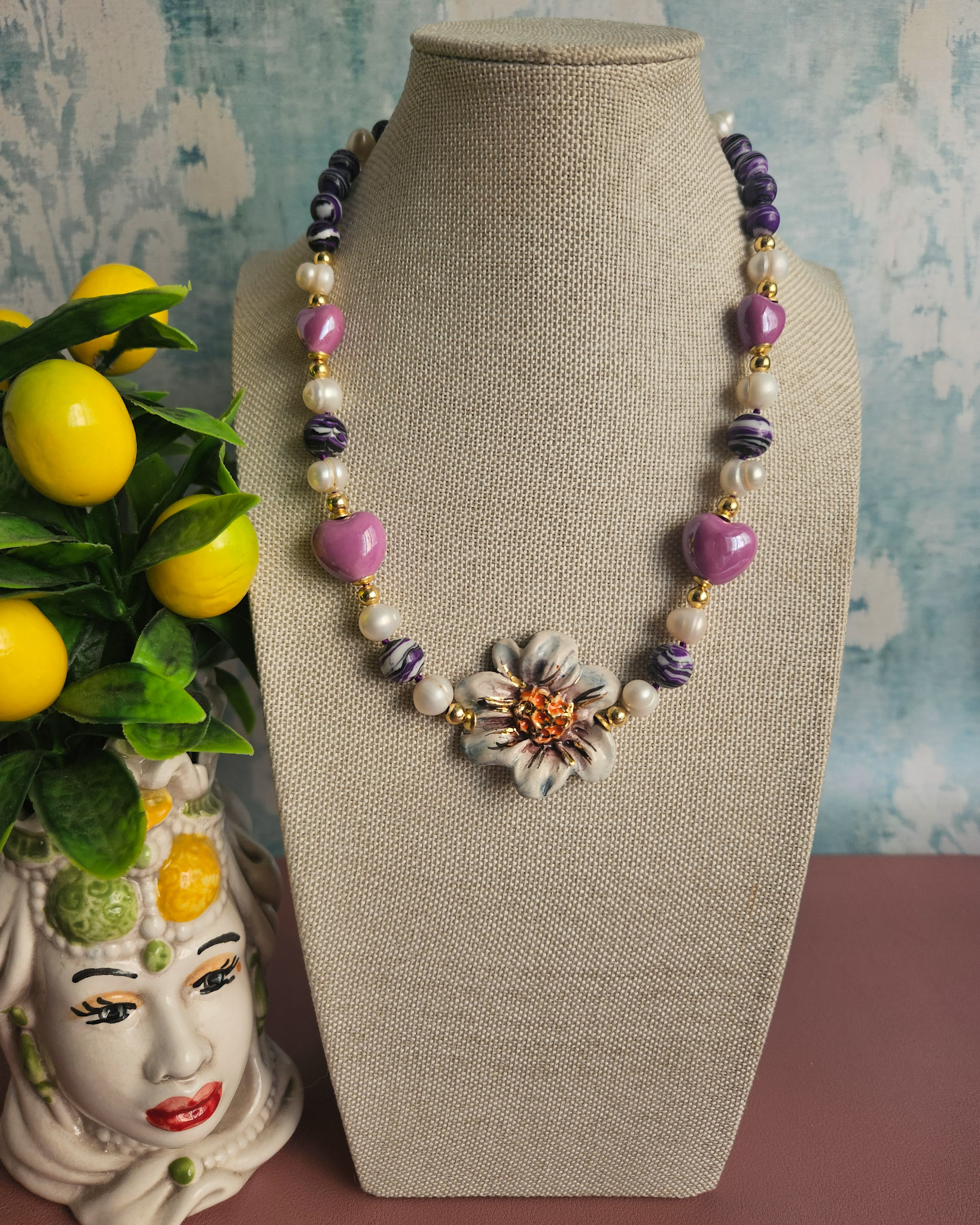 At the center, a hand-painted ceramic flower from Caltagirone blooms with all its delicacy, transforming this jewel into a symbol of femininity and creativity.
