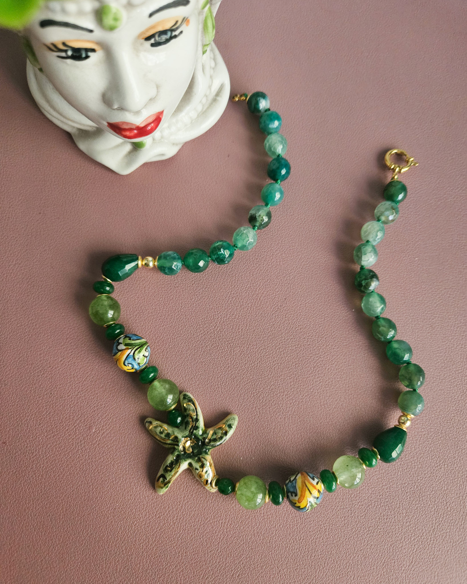 Along the length of the necklace are small beads and a hand-painted ceramic star, adding a touch of originality and elegance.