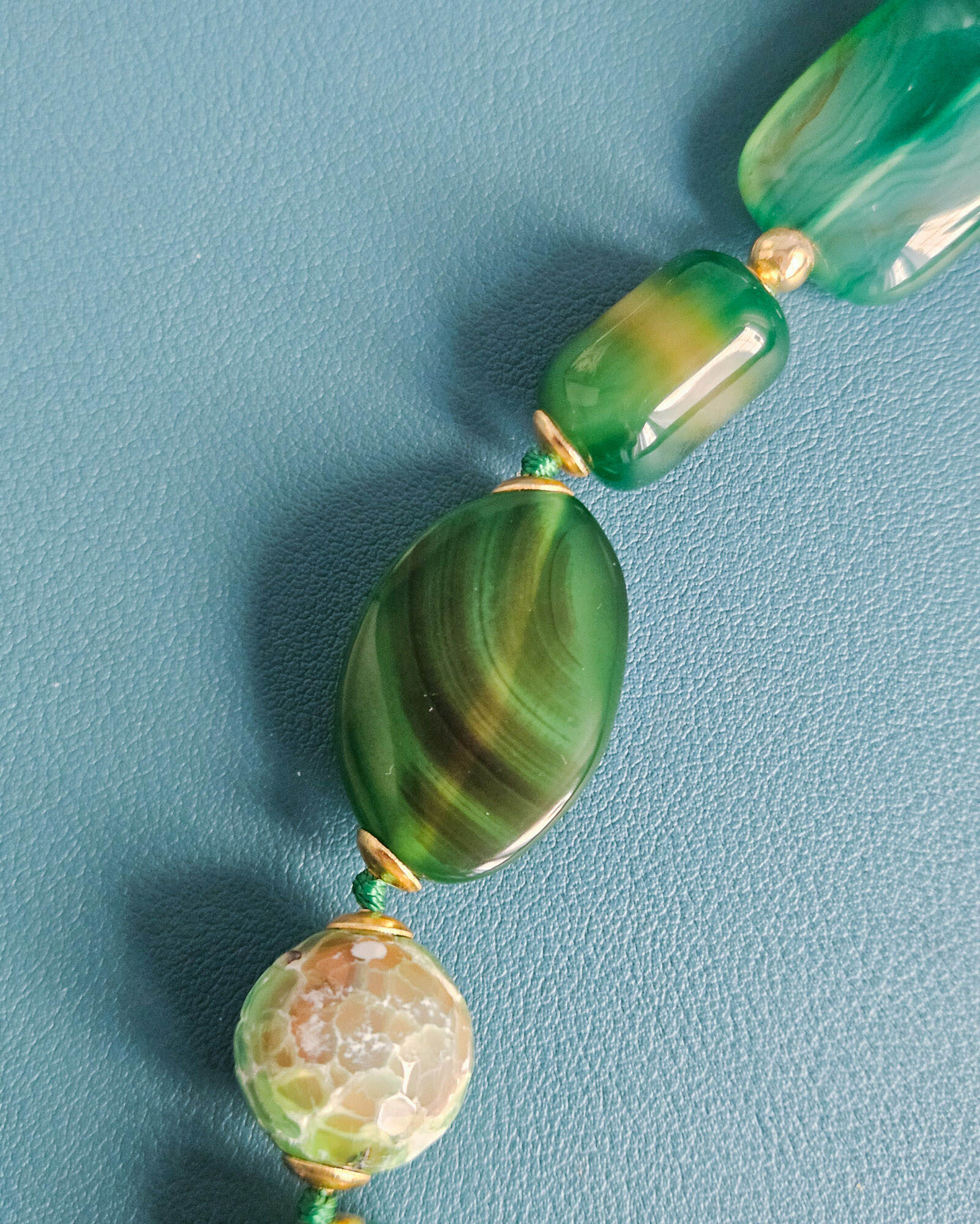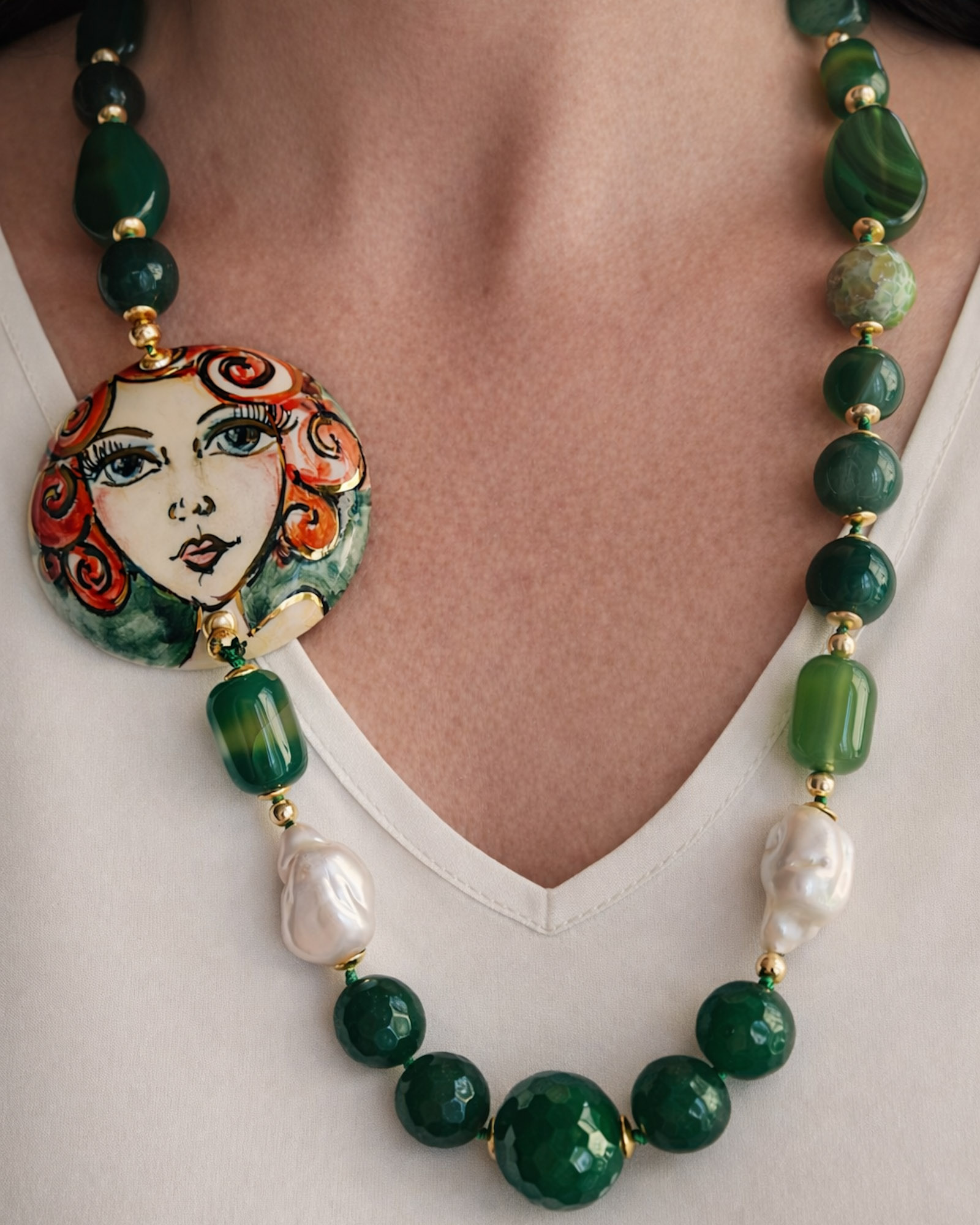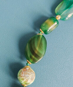 A necklace that tells a story, crafted from artisanal work, natural stones, and lively colors. The emerald-toned stones create an elegant and feminine rhythm on the décolleté.