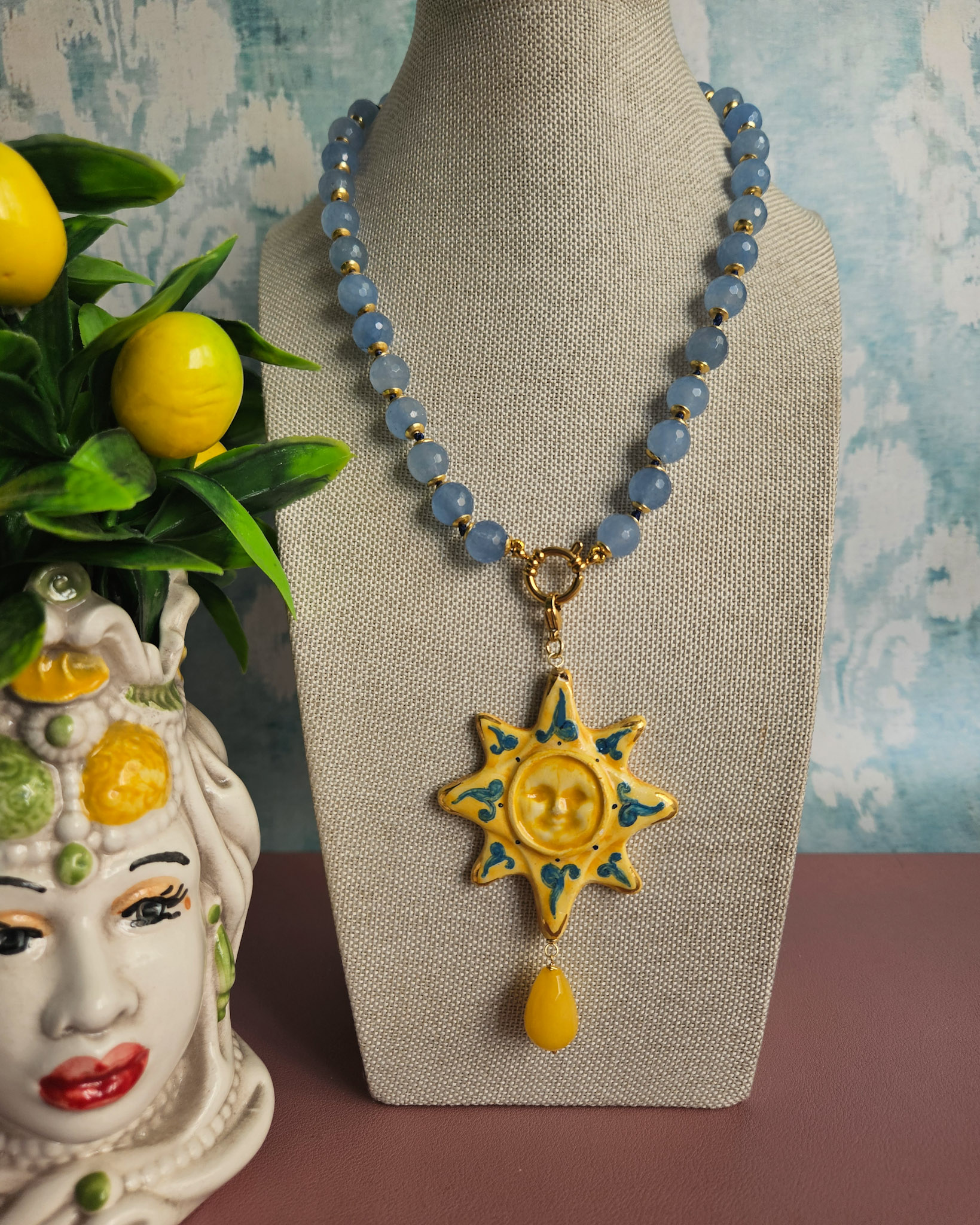 Sicilian Necklace with Light Blue Stones and Sicilian Ceramic Sun