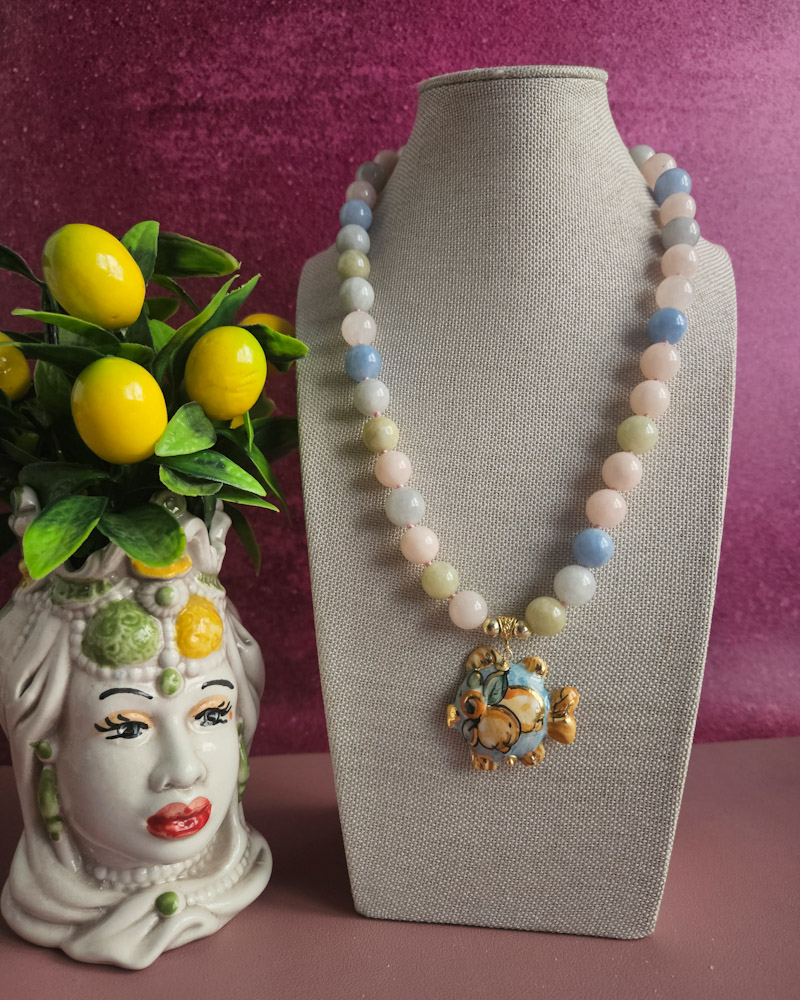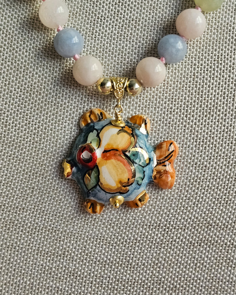 At the center of the necklace, gracefully stealing the spotlight, is a small ceramic fish from Caltagirone. Finely glazed, it has that burst of color that only Sicilian ceramics can deliver. Every detail reflects the artistic tradition of Southern Italy: vibrant colors, carefully crafted shapes, and a strong connection to the sea and a simple, authentic way of life.