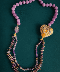 The lower part is more textured and lively: sugilite chips alternate with purple striped agate, arranged in a fluid and natural way. The stones are not uniform, and it is precisely this irregularity that gives rhythm and character to the jewel.