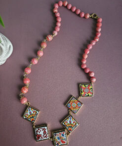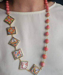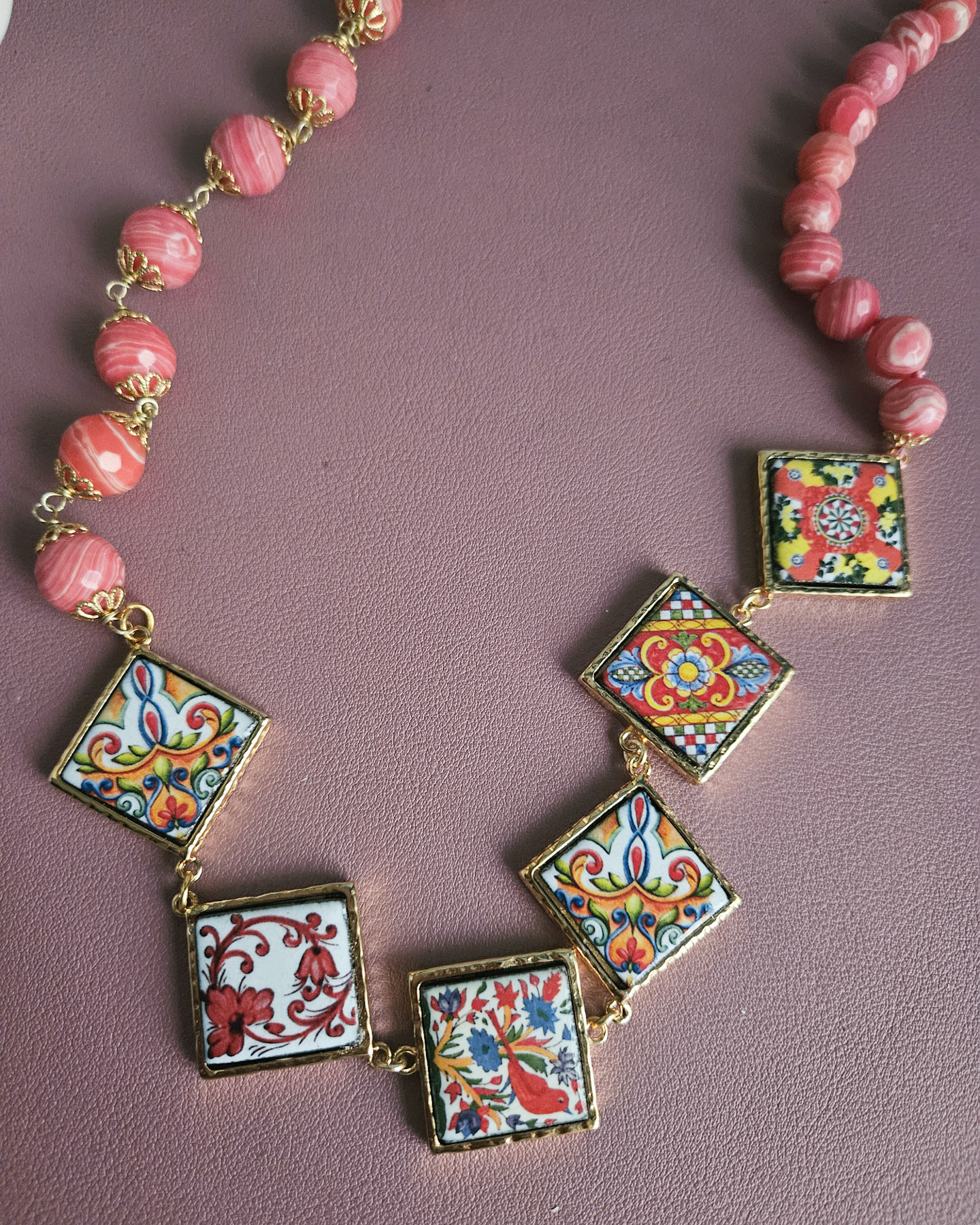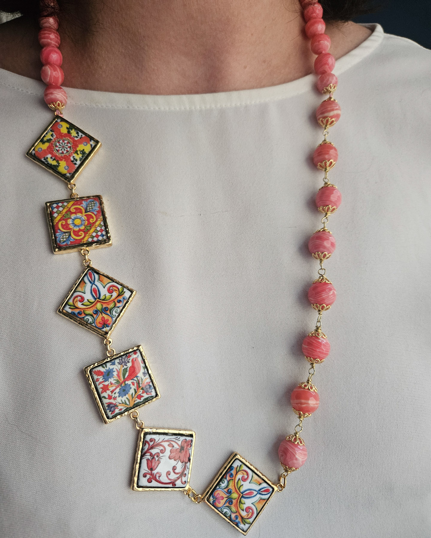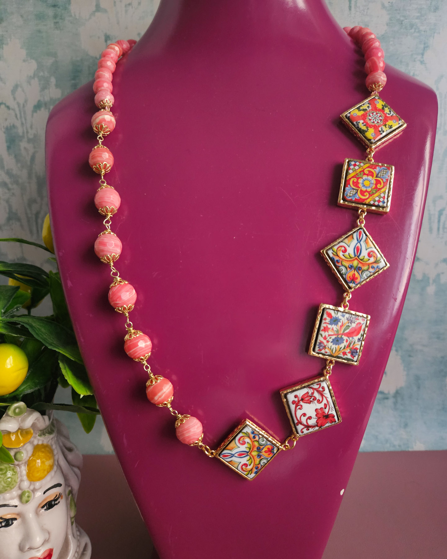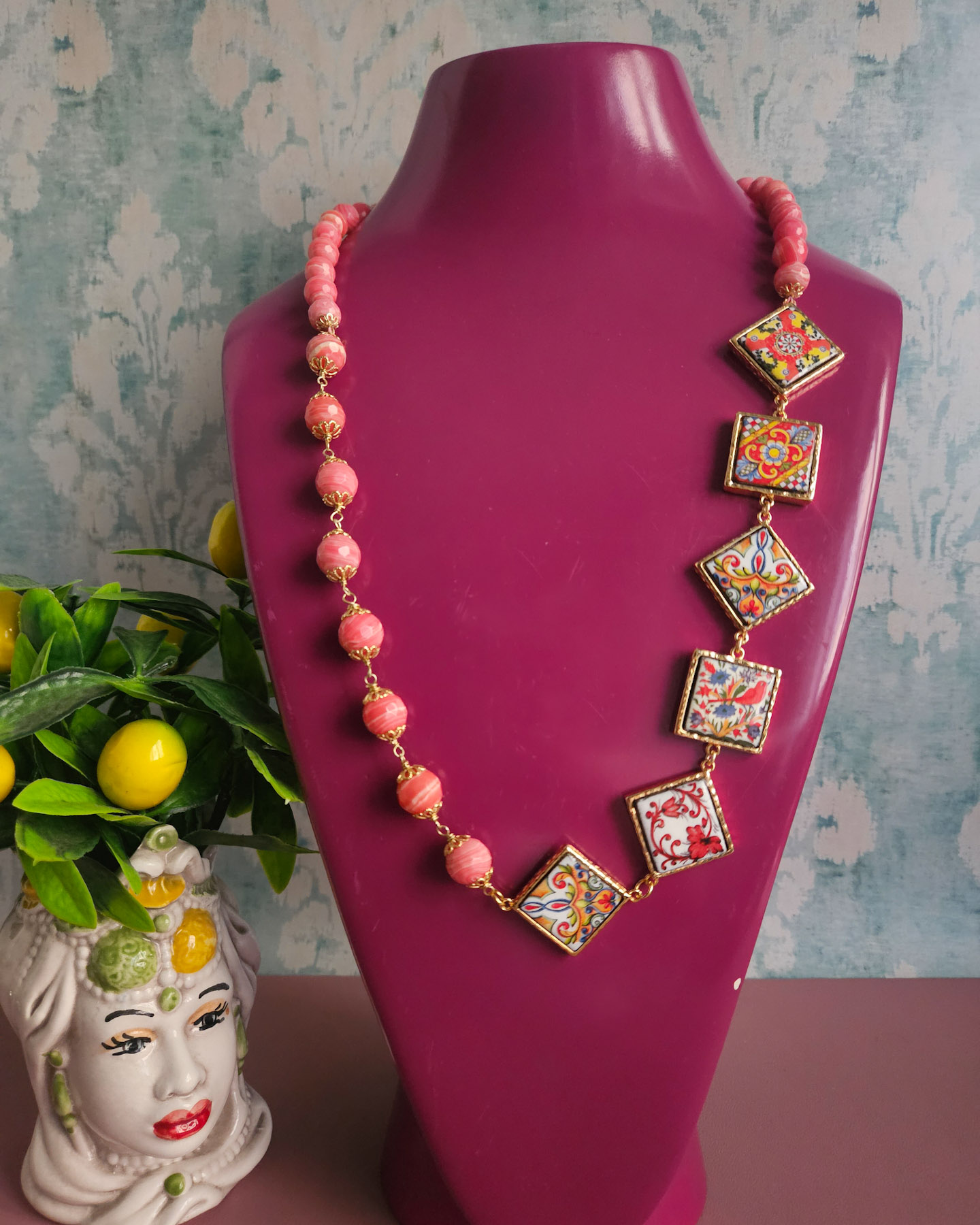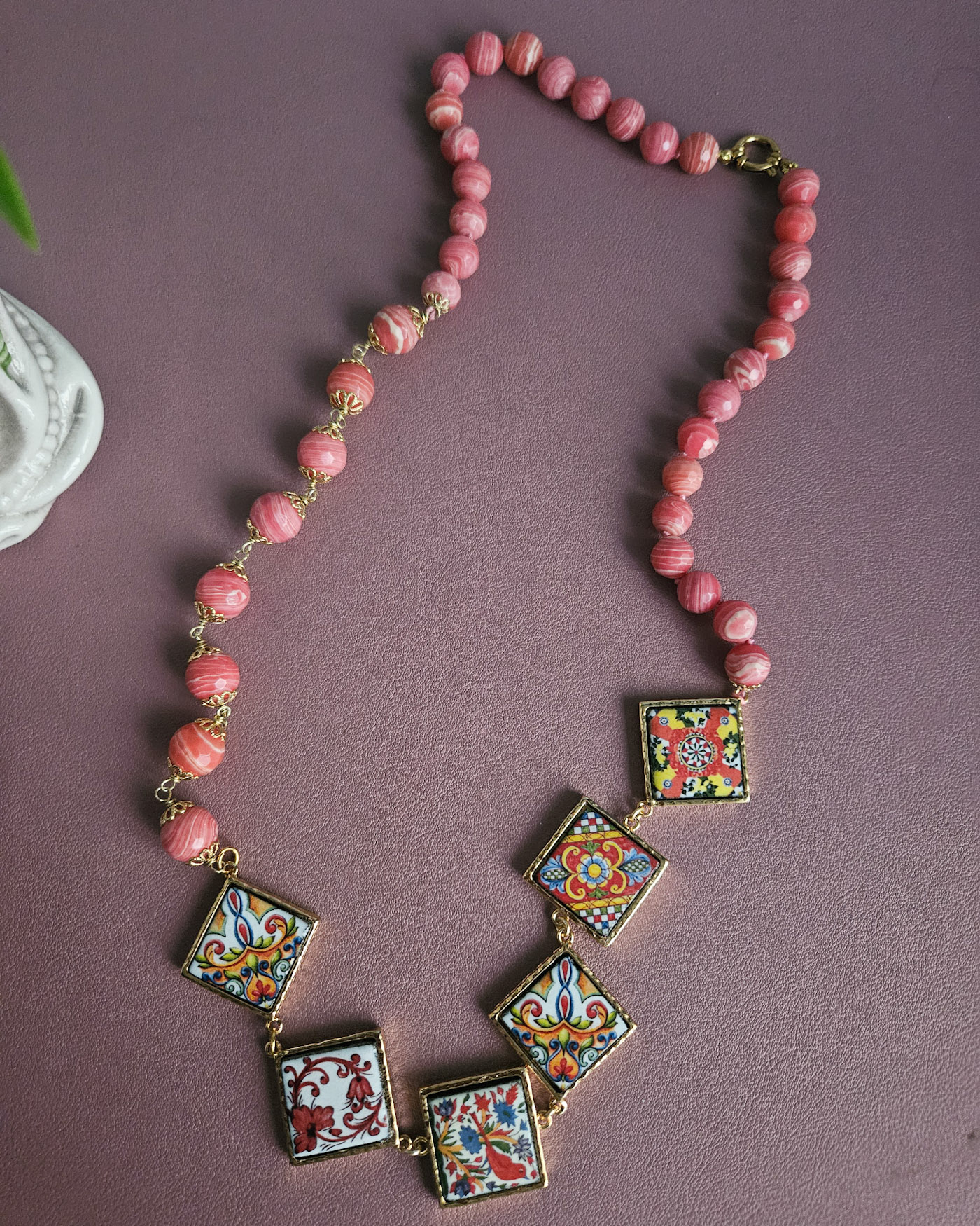 Sicilian Necklace with Rose Stones and Sicily Ceramic Tiles