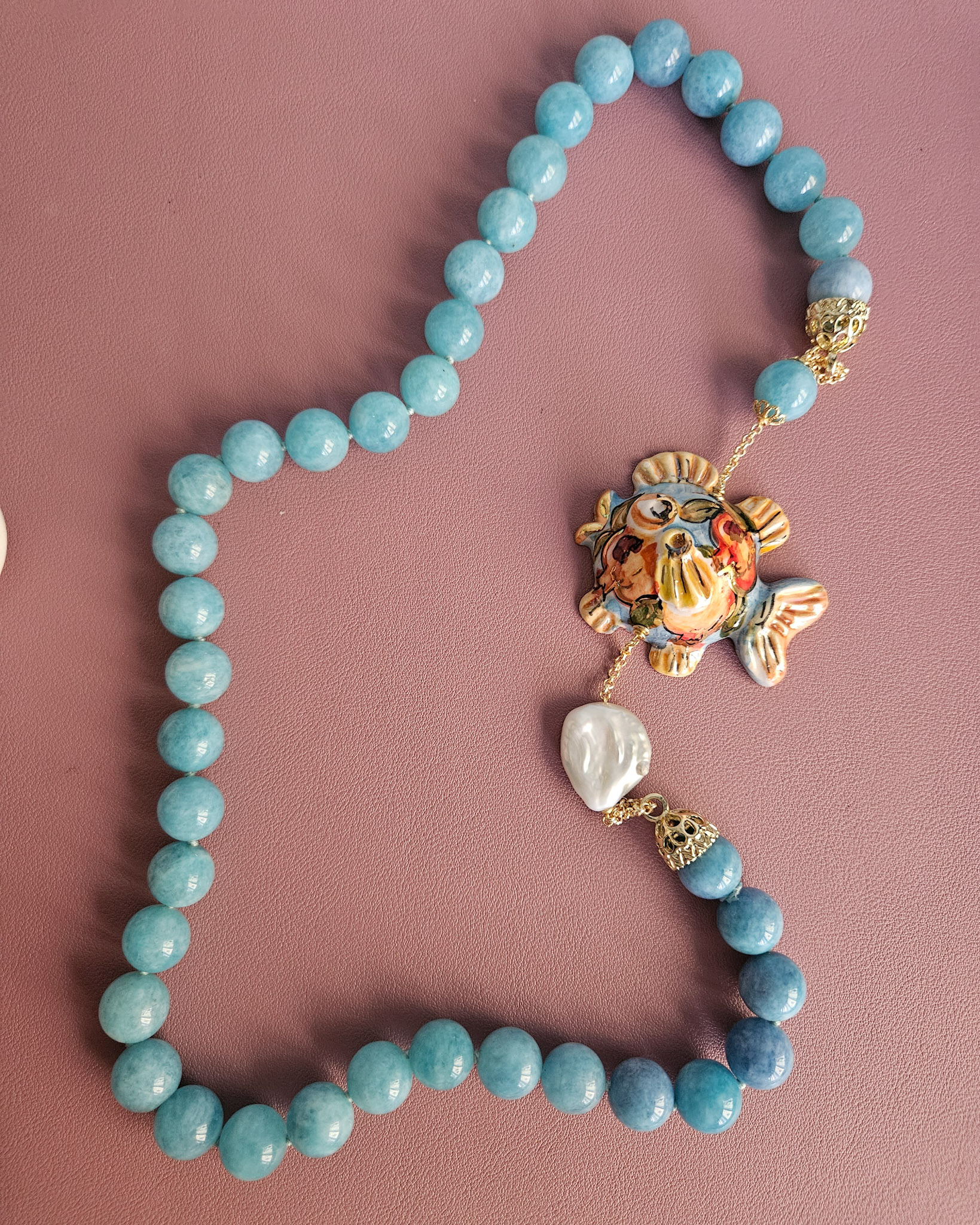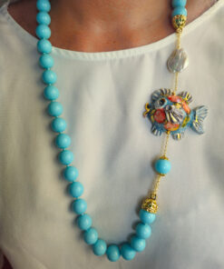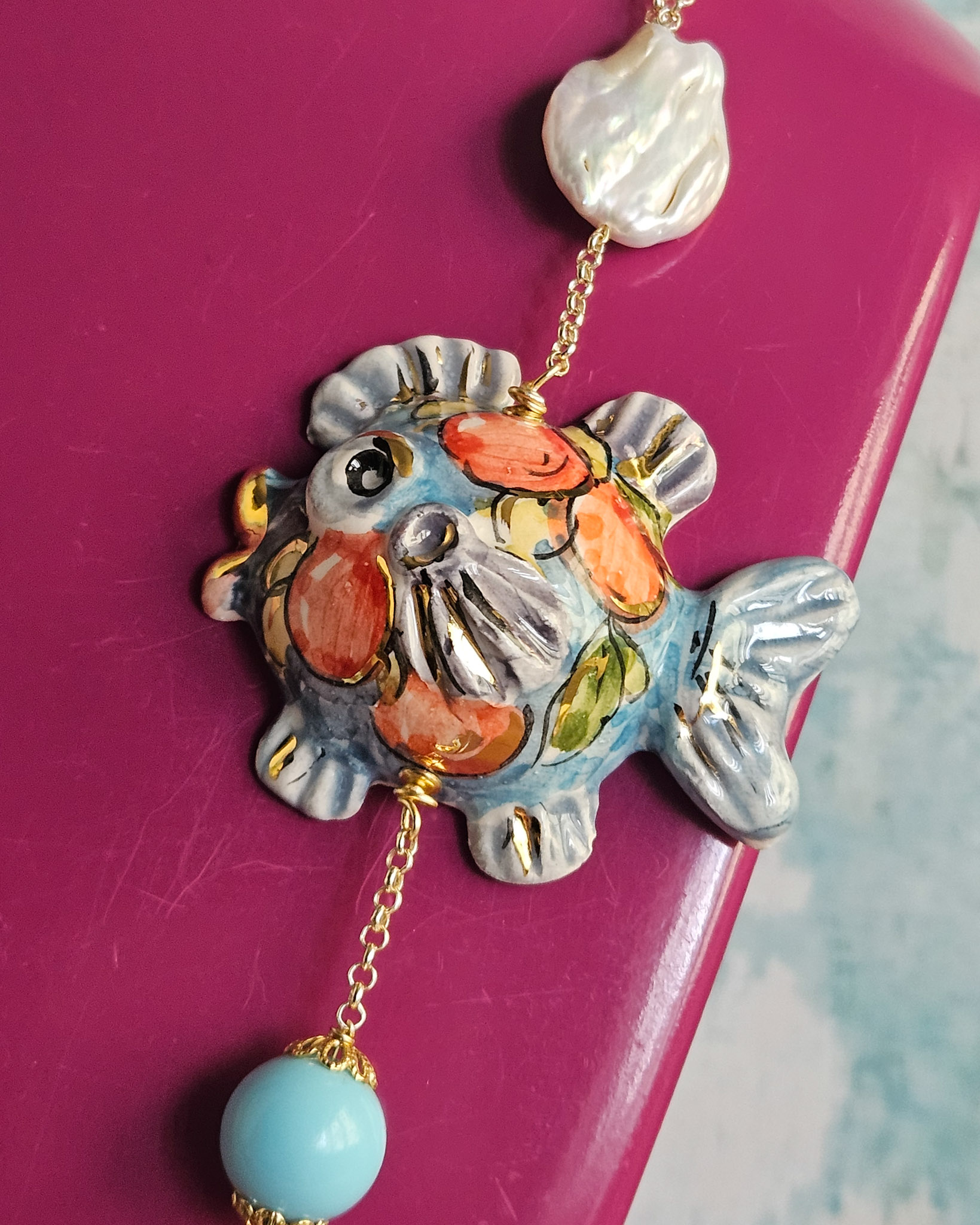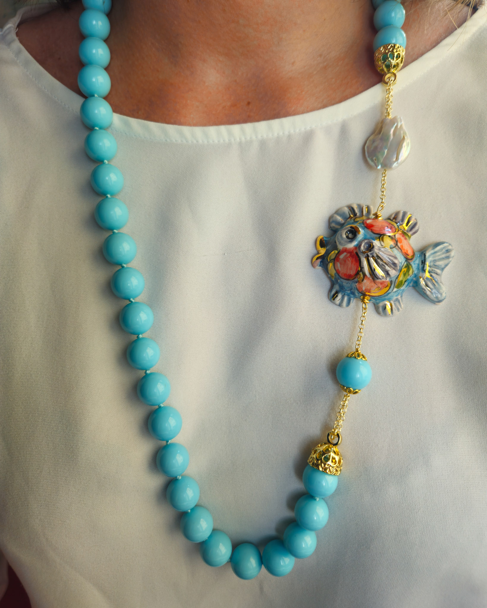 Gorgeous Turquoise necklace with hand-painted Caltagirone ceramic fish.