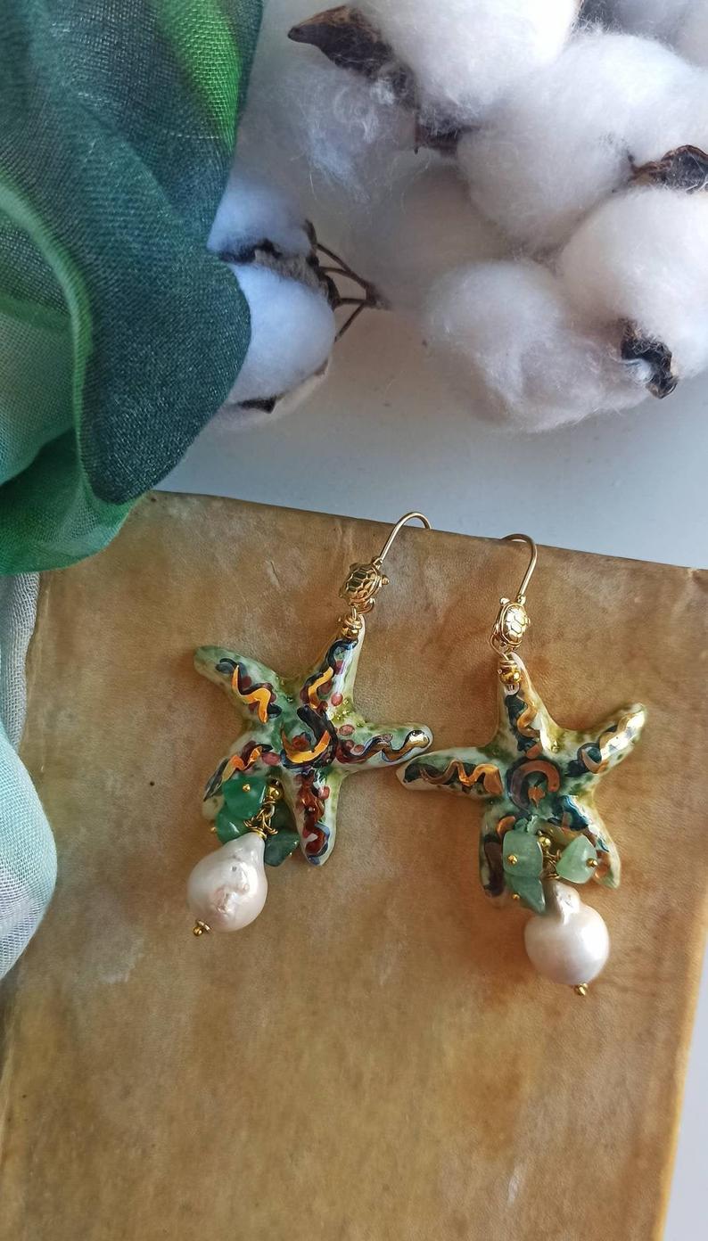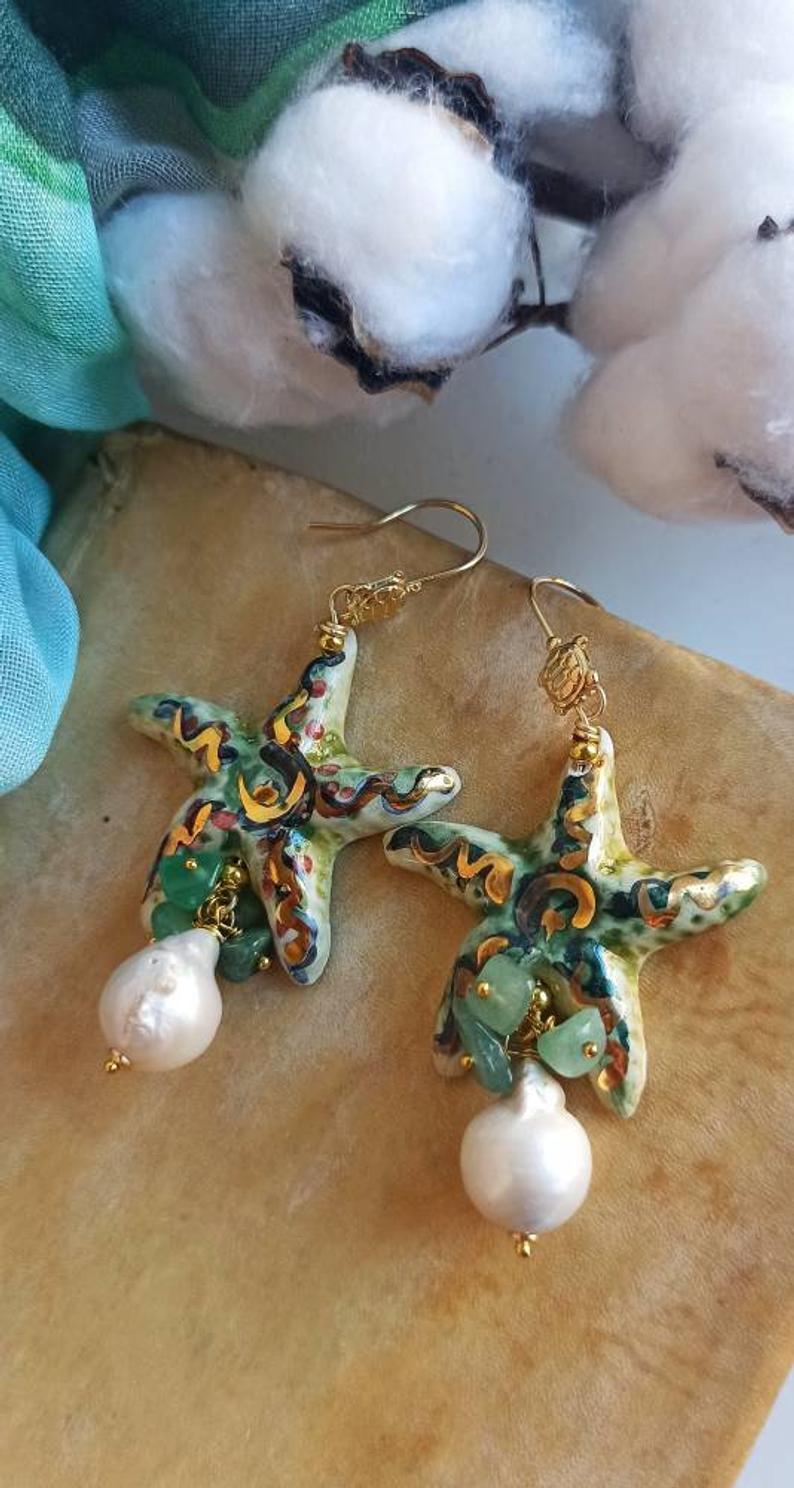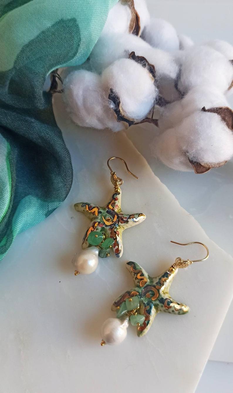 Sicily Ceramic Starfish Earrings with Baroque Pearl Drops