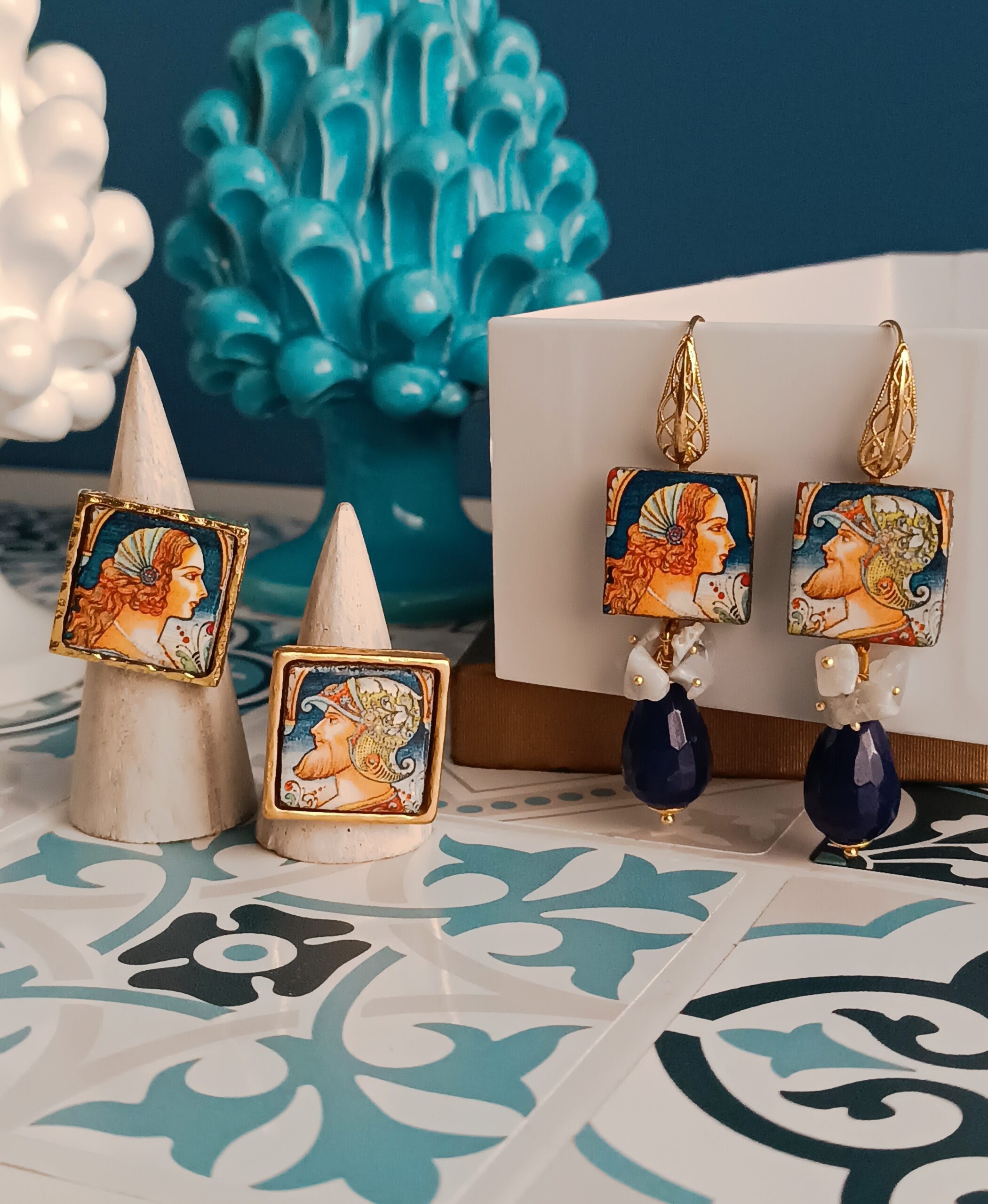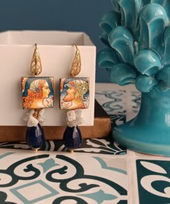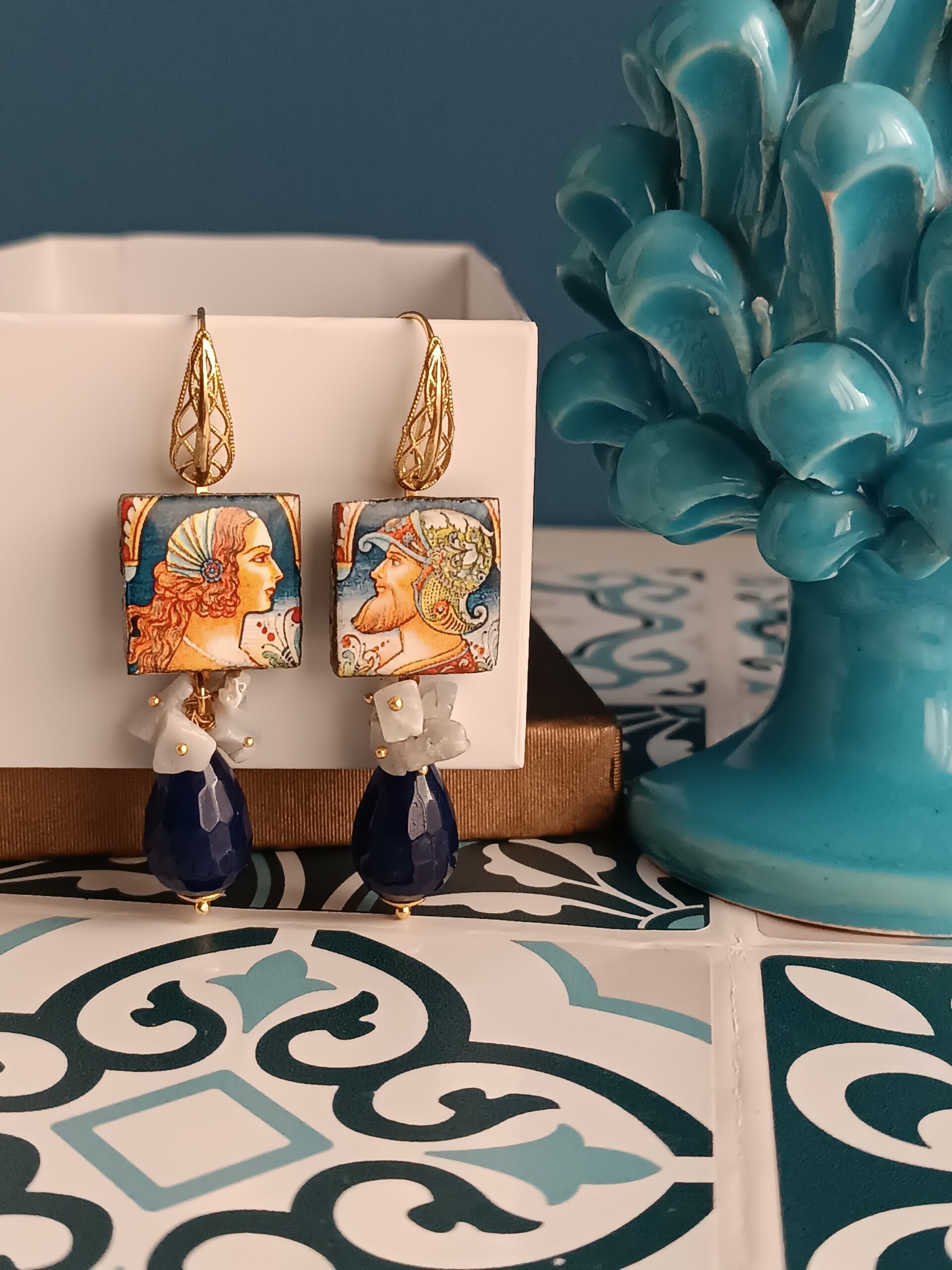 Earrings with Sicilian tiles combined with drops of blue Agate and Chalcedony chips.