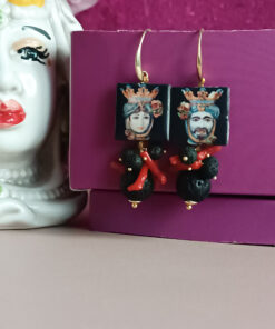 The protagonists are the Sicilian Moors depicted in the ceramic tiles, an unequivocal symbol of Sicilian tradition and history, mounted with lava stone and natural red coral sprigs that bring to mind the incandescent lava flowing from the volcano Etna.