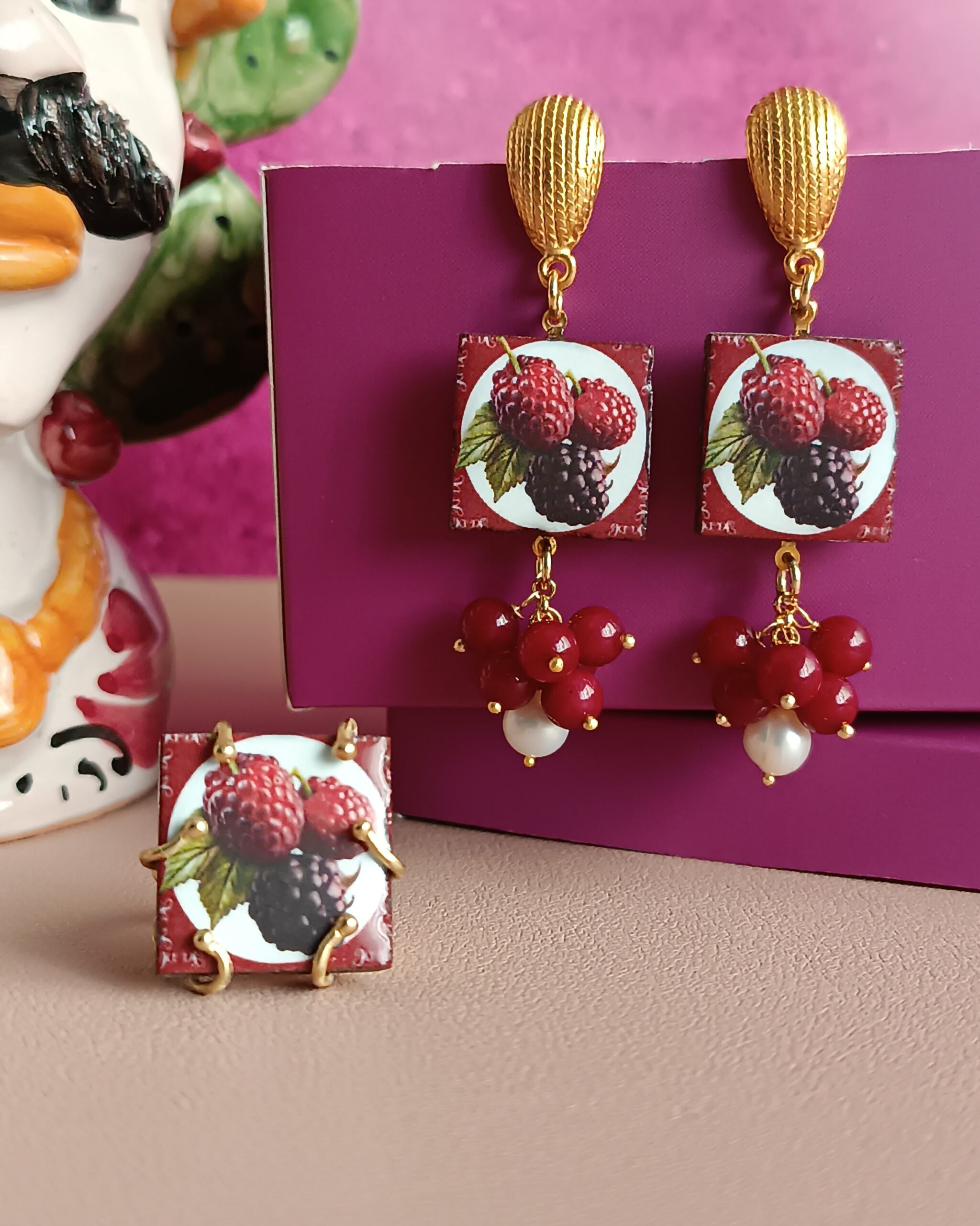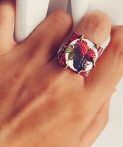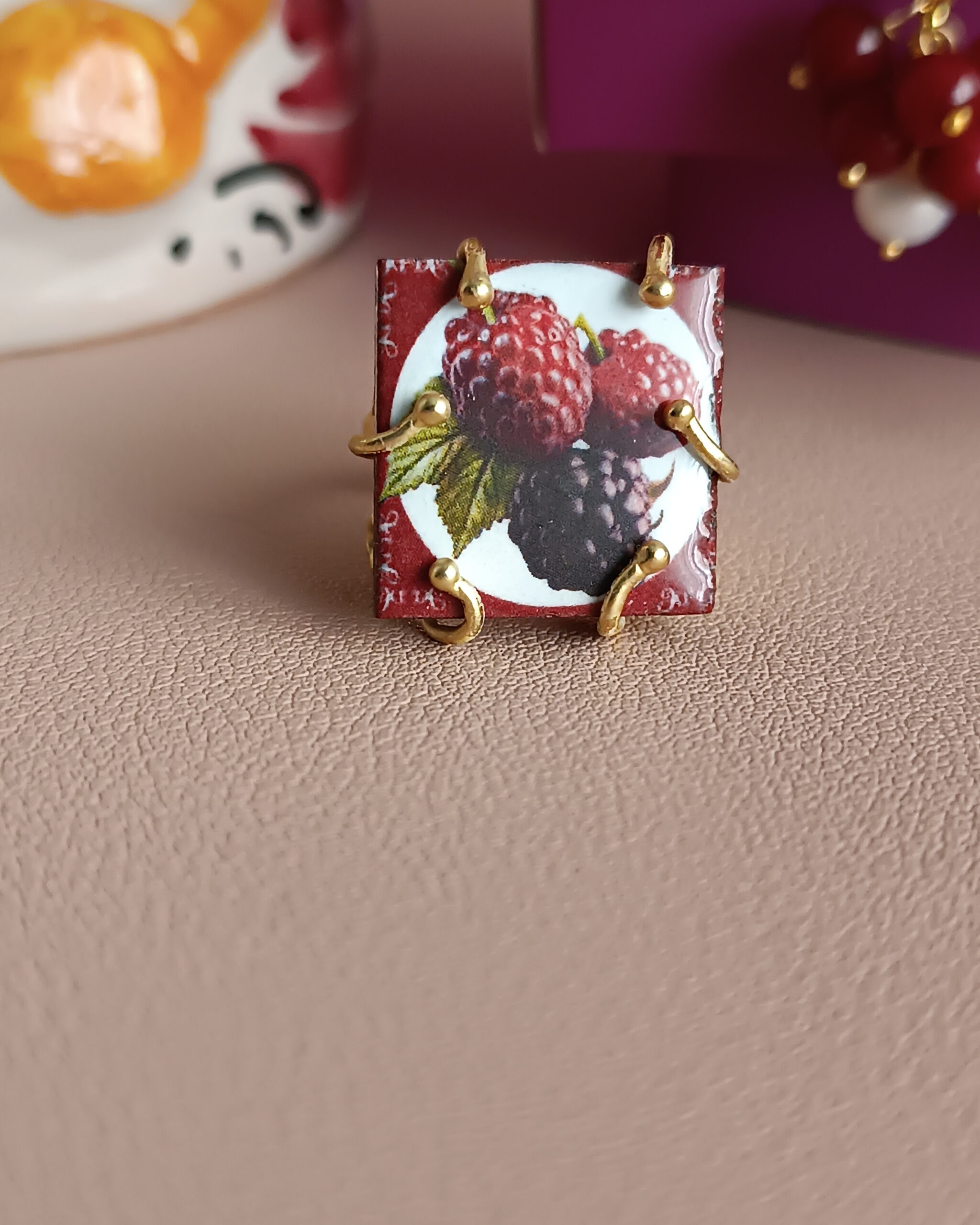 Delightful square ring with lava stone and ceramic tile from Caltagirone with an absolutely new image, blackberry fruit. This is an absolutely unique design that you won’t find anywhere else, because it was designed by the very precious collaborator of Chapeau.