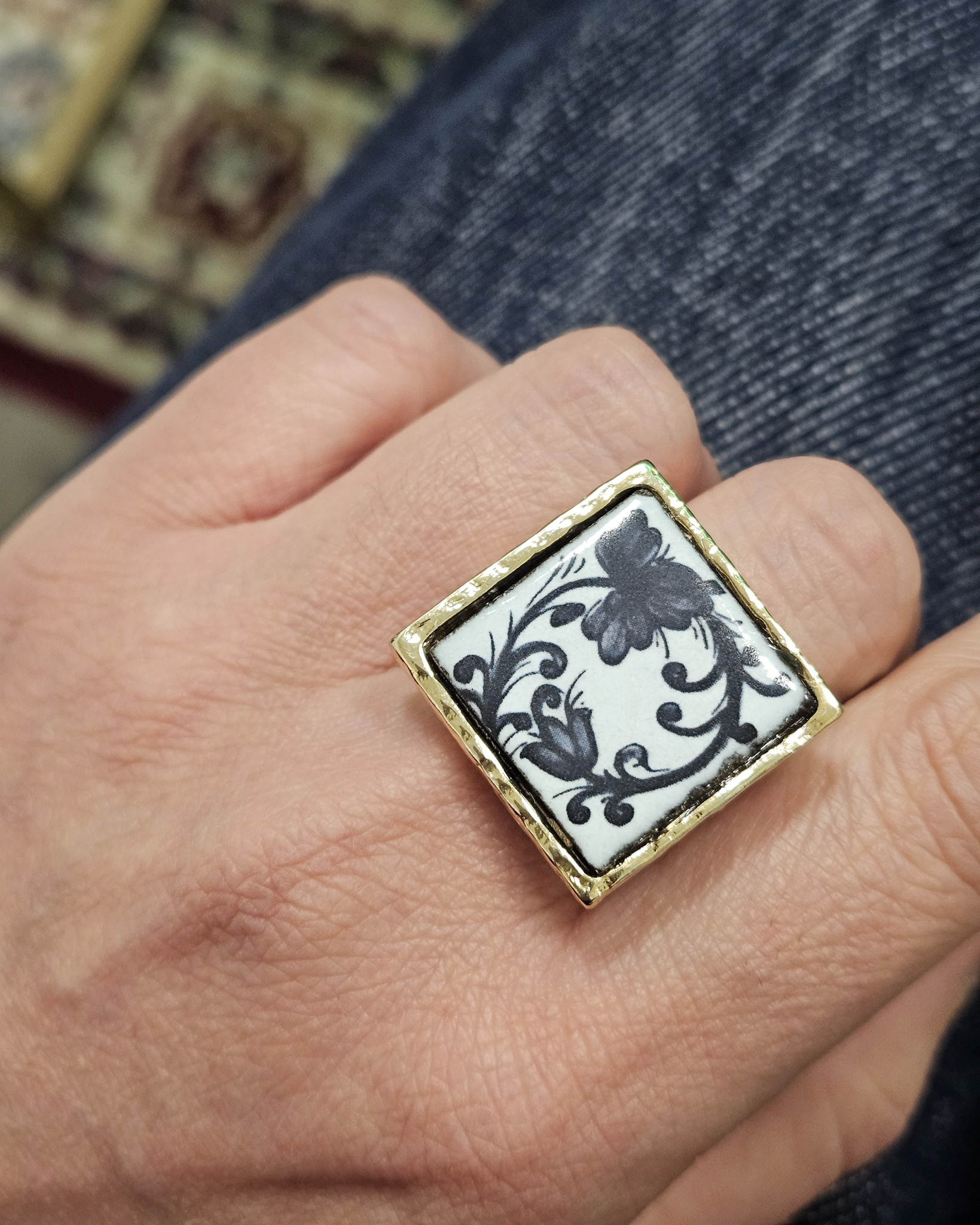 Delightful square ring with lava stone and Caltagirone ceramic tile featuring a floral design.