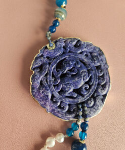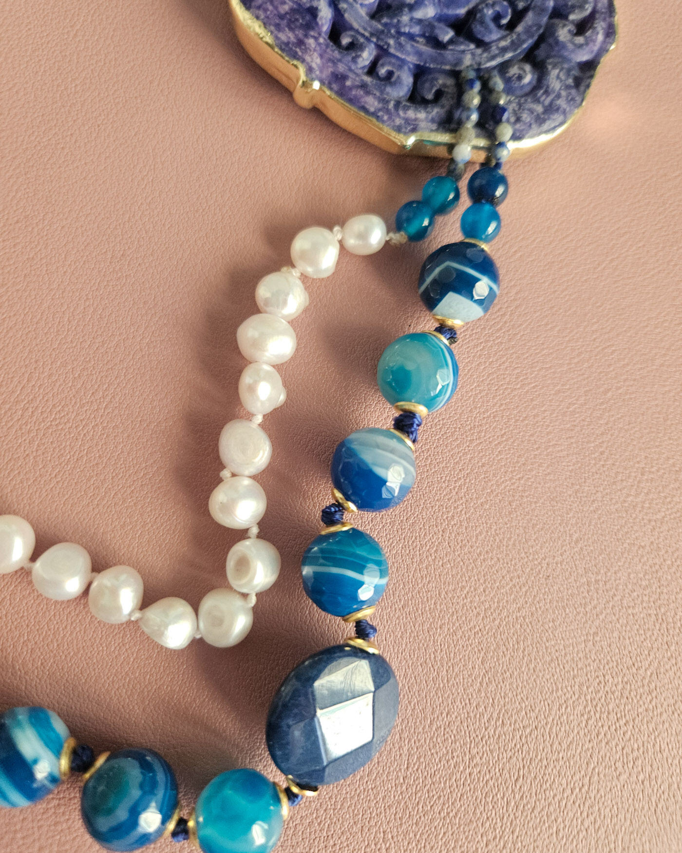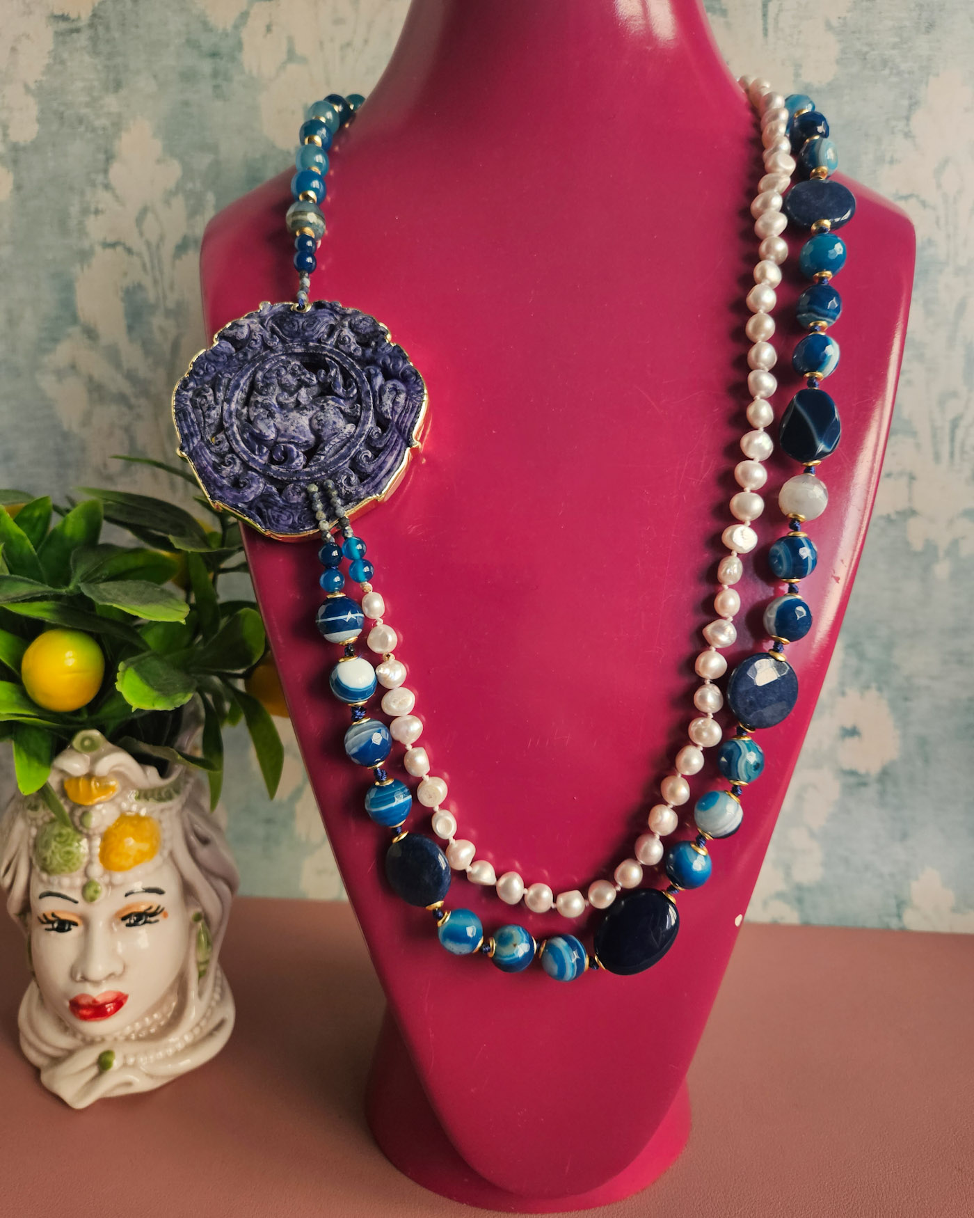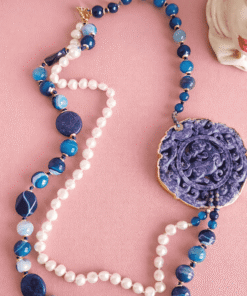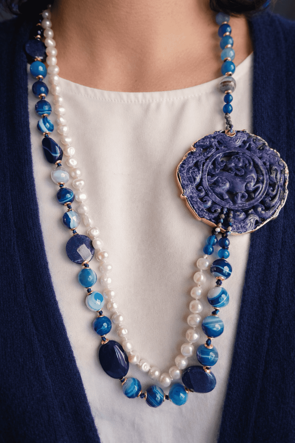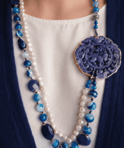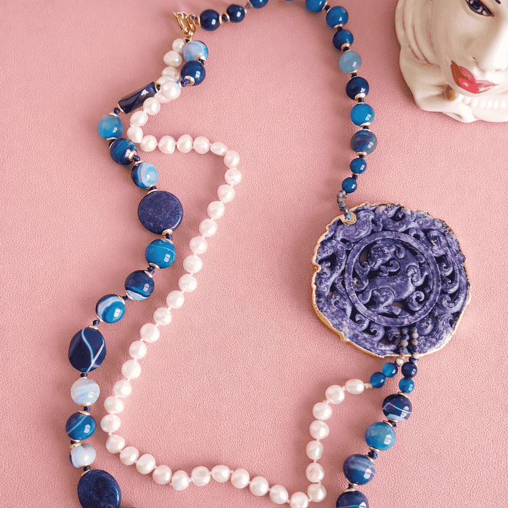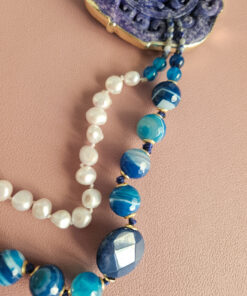 Statement Double Necklace with Blue Stones, Pearls and Natural Blue Jade
