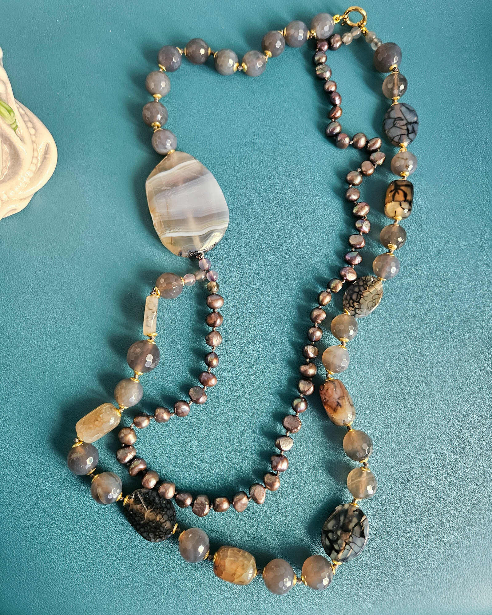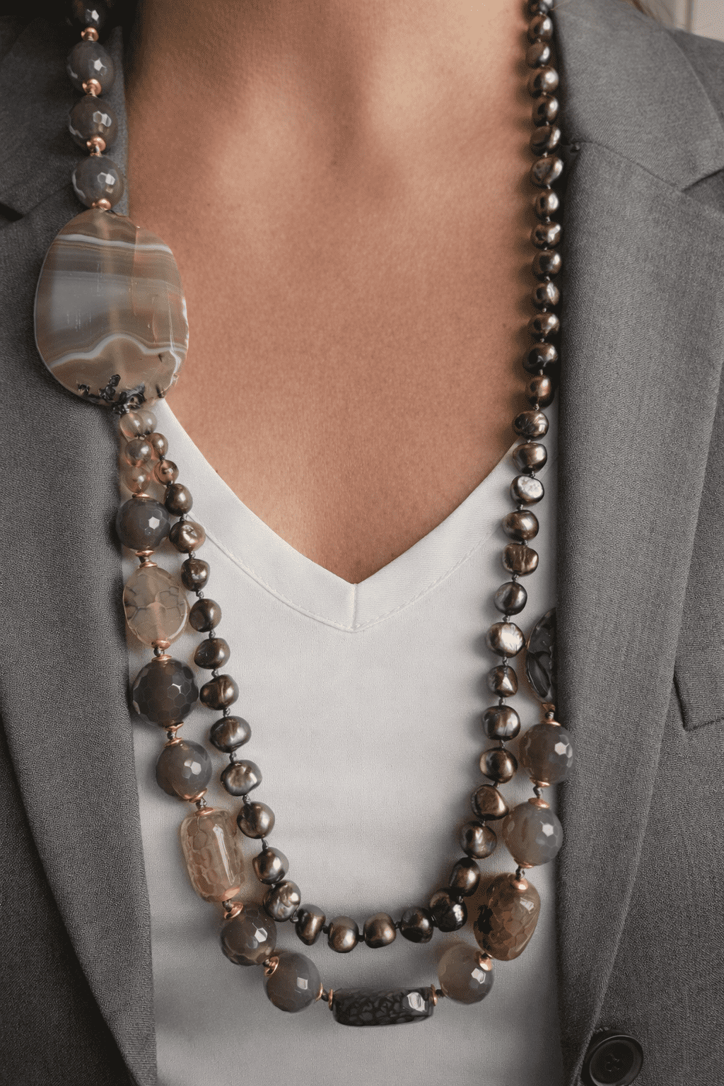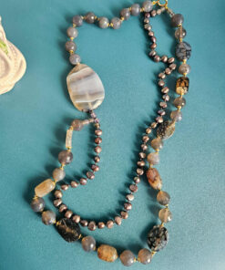 Statement Double Necklace with Grey Stones, Bronze Pearls and Natural Jade