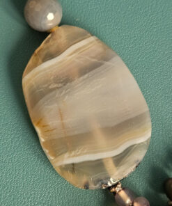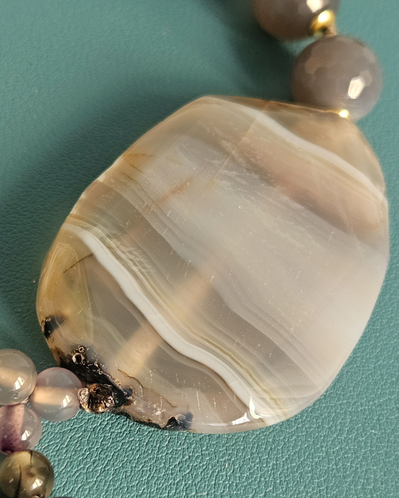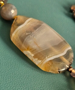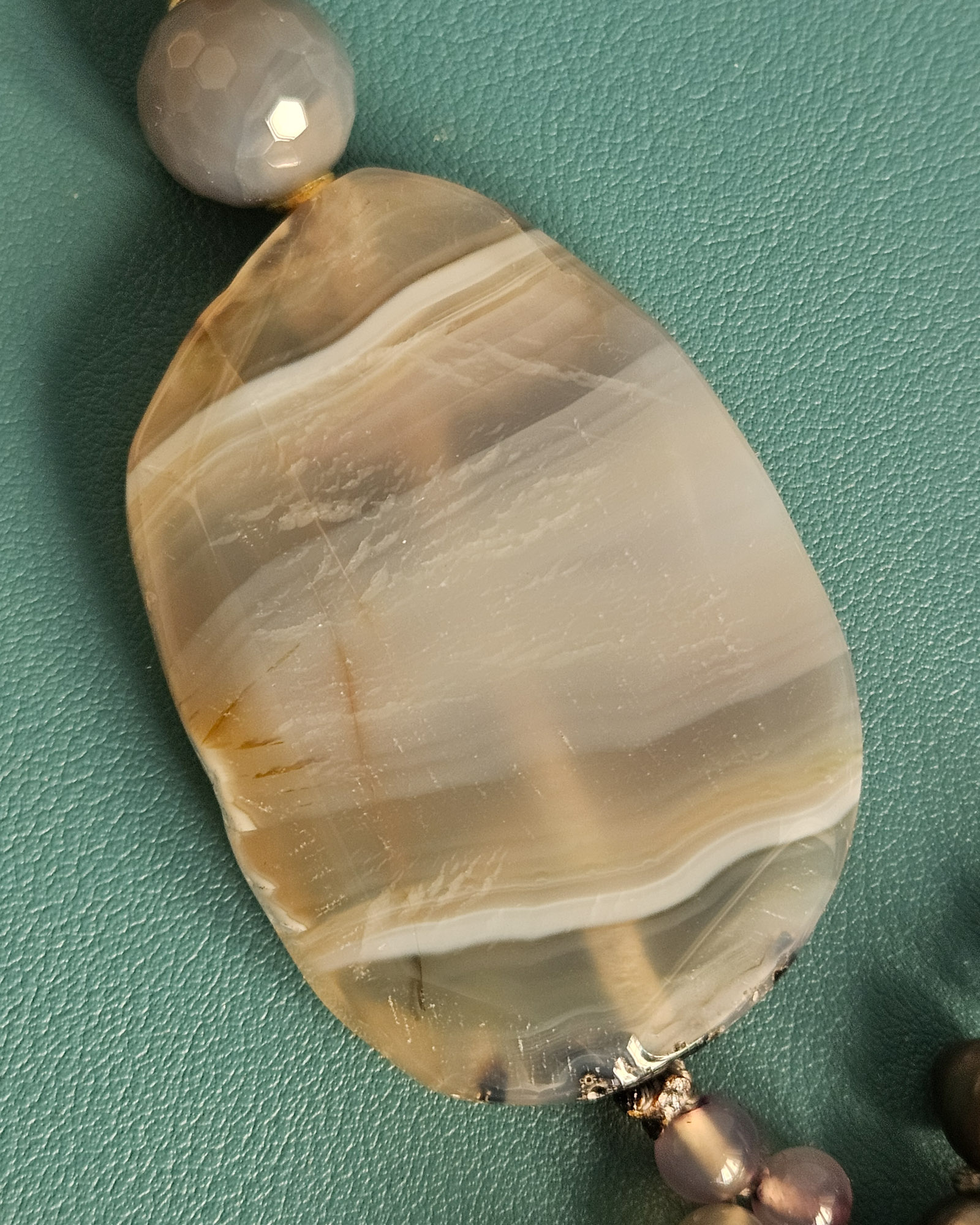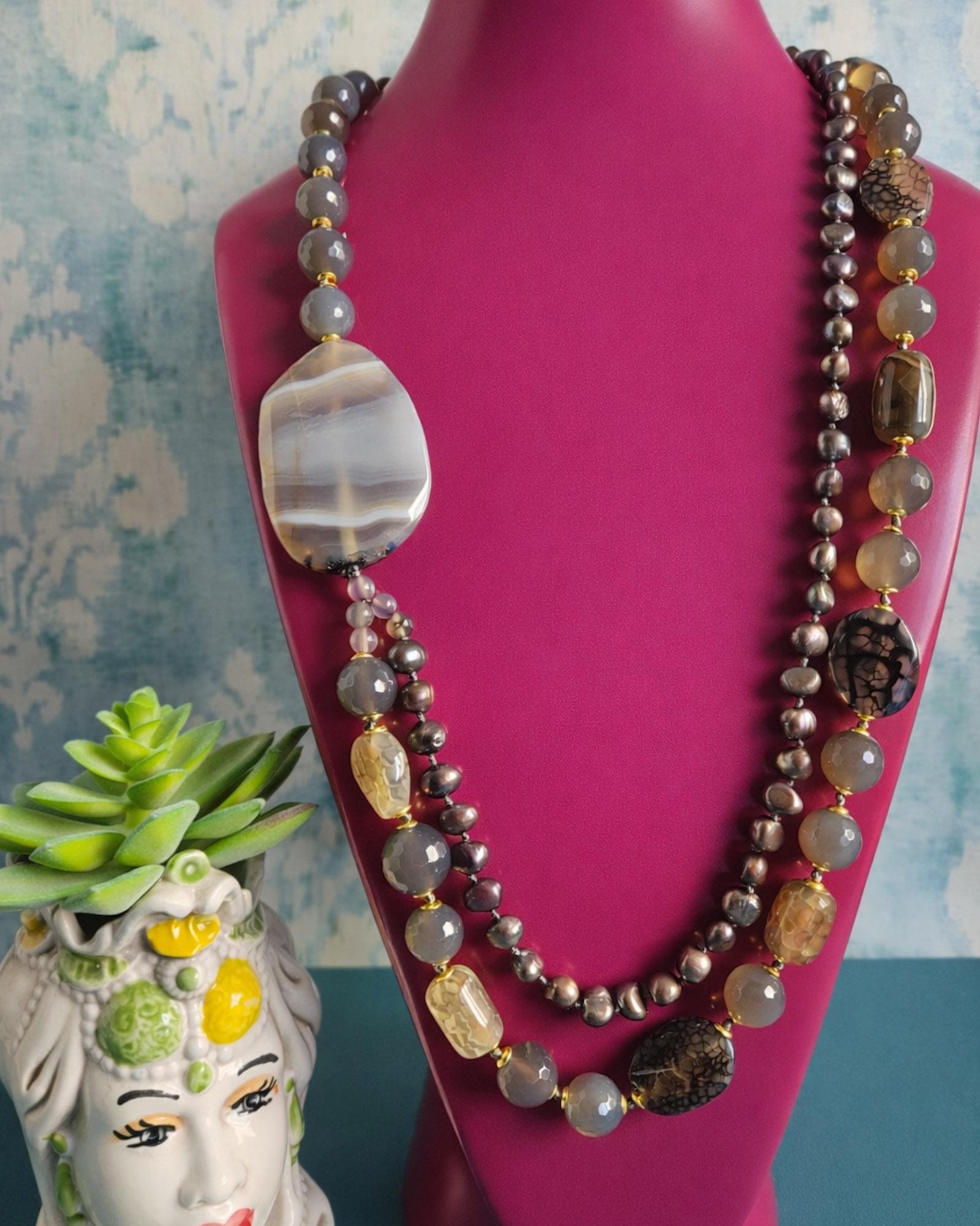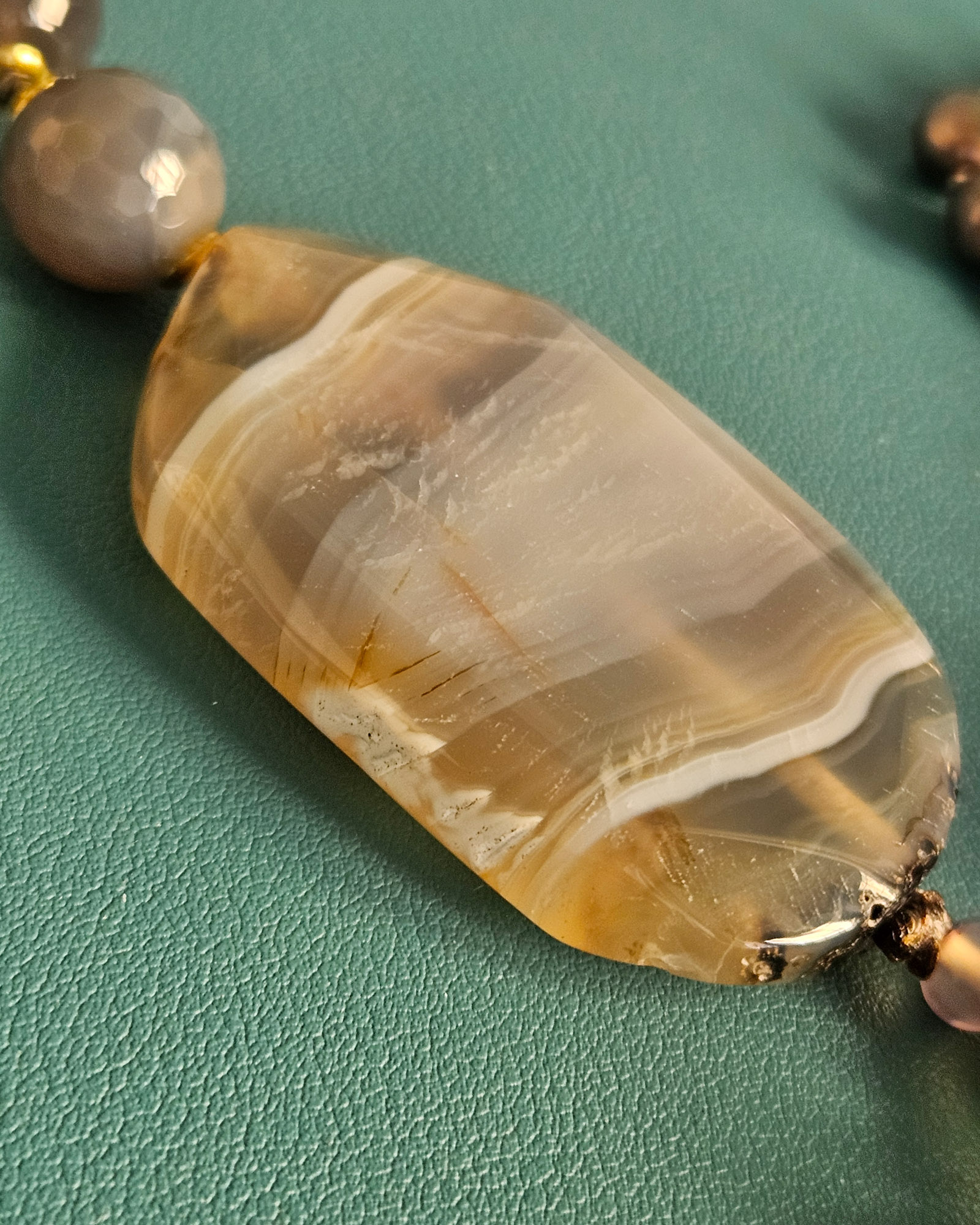 The main piece is composed of smoky agate in different shapes and facets, characterized by delicate veins and transparencies that create refined plays of light. A second strand of bronze pearls, with a warm, luminous finish, adds depth and a touch of luxury, creating a harmonious color contrast with the neutral tones of the agate.