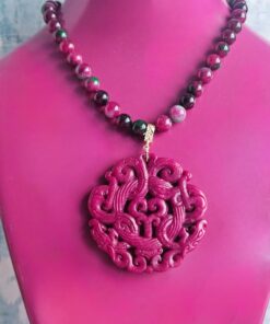 The carved Burmese jade pendant, featuring details inspired by traditional Eastern motifs, is known for its hardness and rich color. In many Eastern cultures, jade is often associated with protection and well-being.
