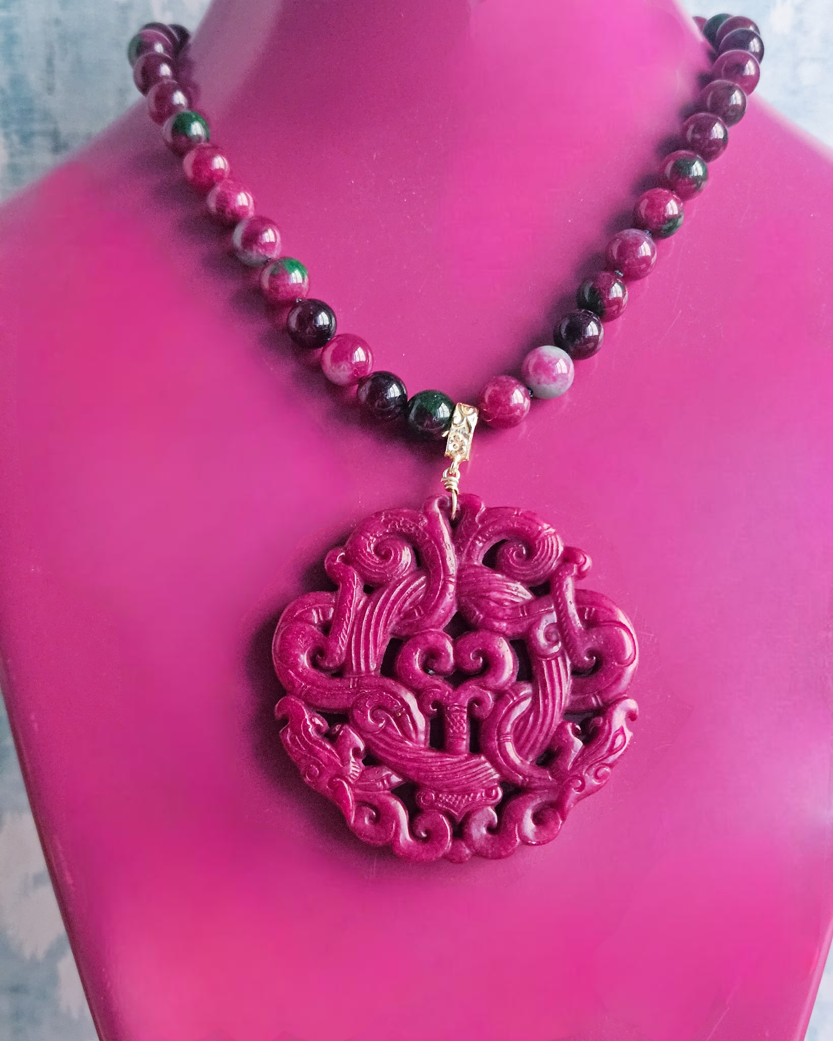 This necklace is made with ruby-zoisite, a semi-precious stone that combines the deep red of ruby with the dark green of zoisite, creating a bold yet harmonious color effect. The beads are smooth, polished, and hand-strung to ensure an elegant and durable finish.