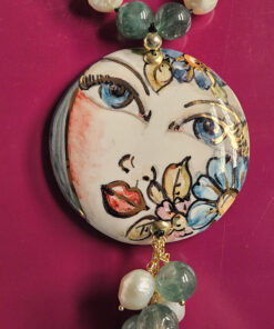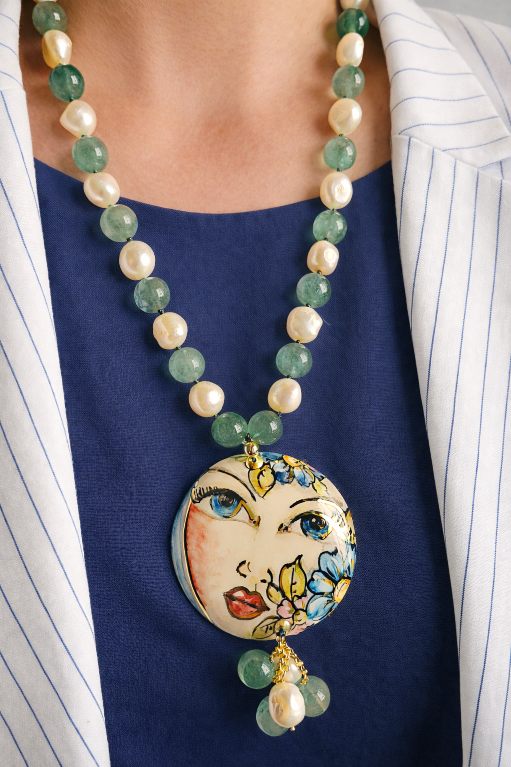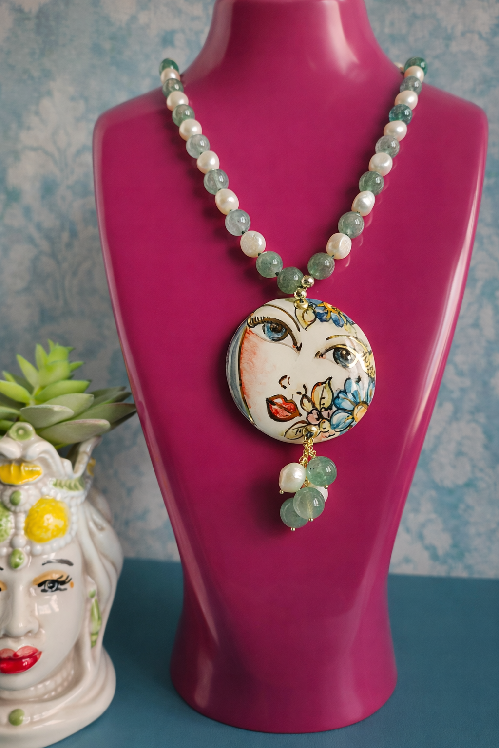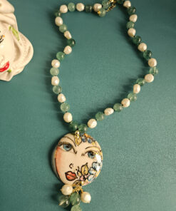 This necklace combines the natural luster of river pearls with the fresh green of jade, creating a very harmonious and luminous color combination. The alternating spheres give rhythm to the composition and highlight the large hand-painted ceramic pendant, the star of the jewel. The female face, decorated with small floral details, is handcrafted, making each piece unique.