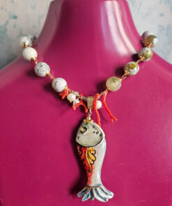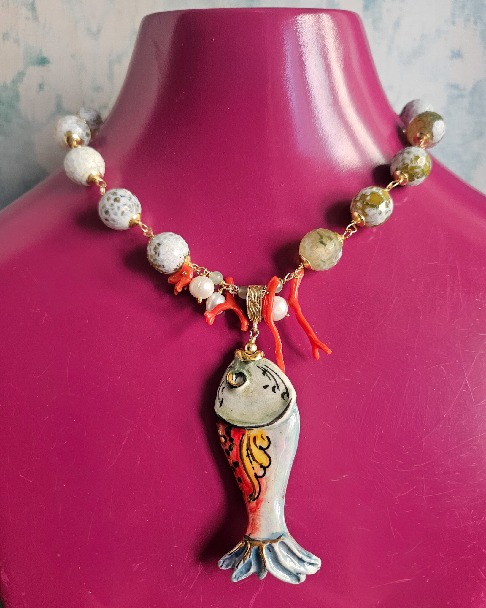 Statement Necklace with Green Stones and Sicilian Ceramic Fish