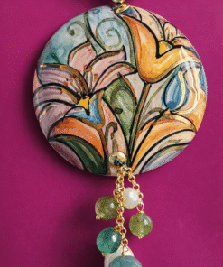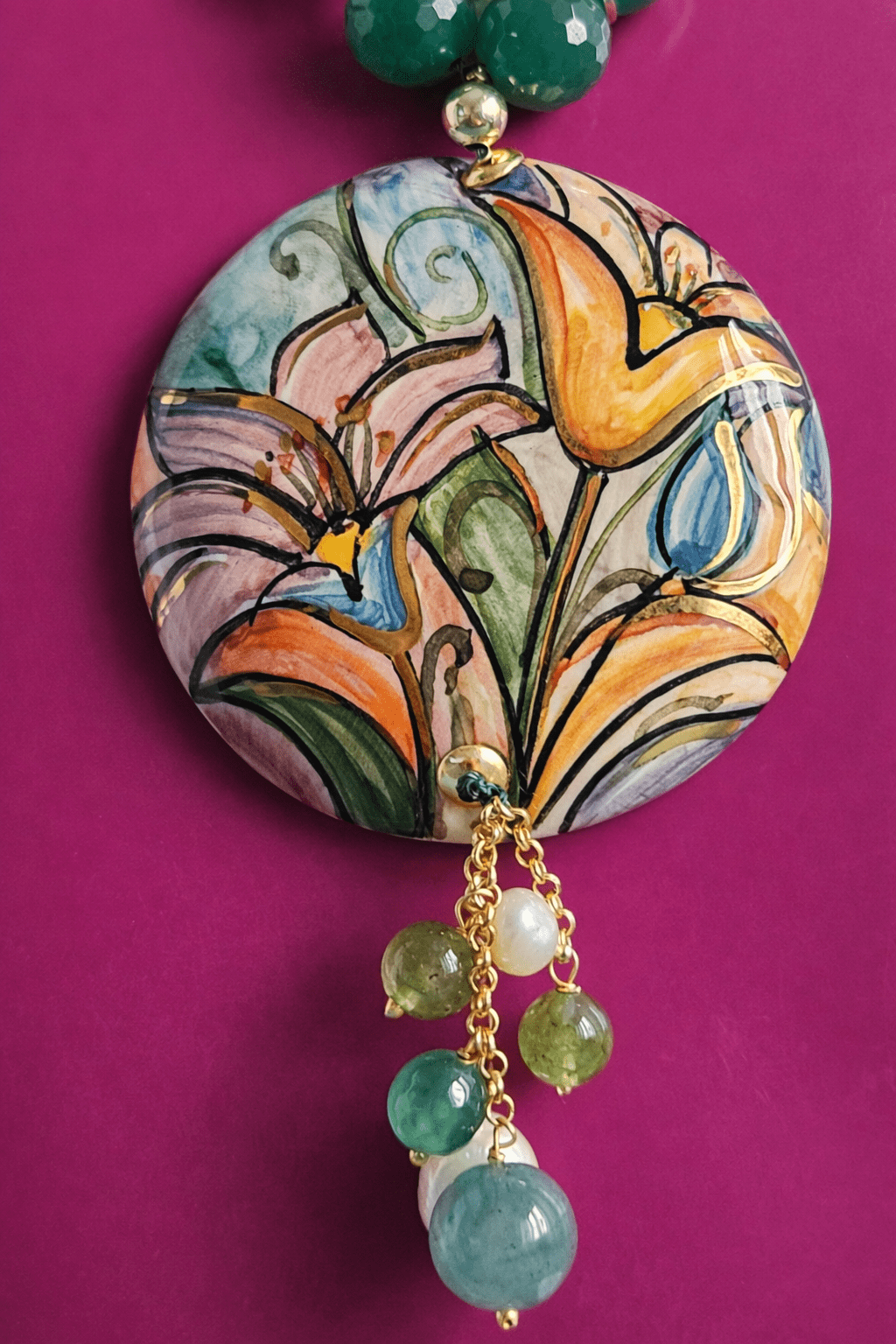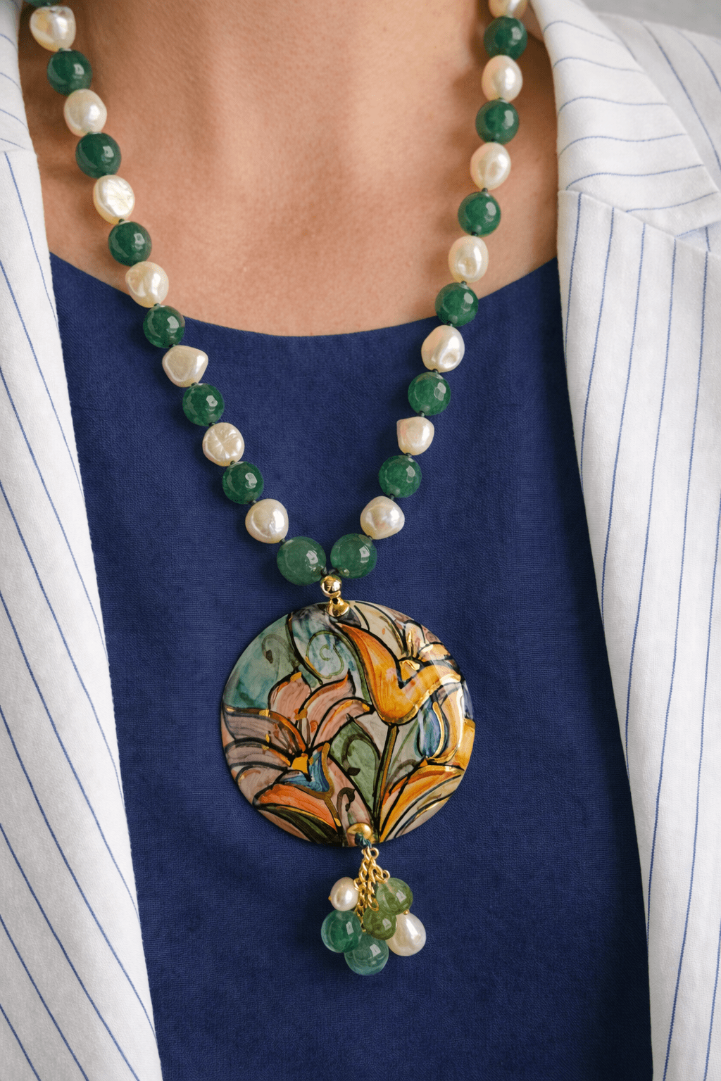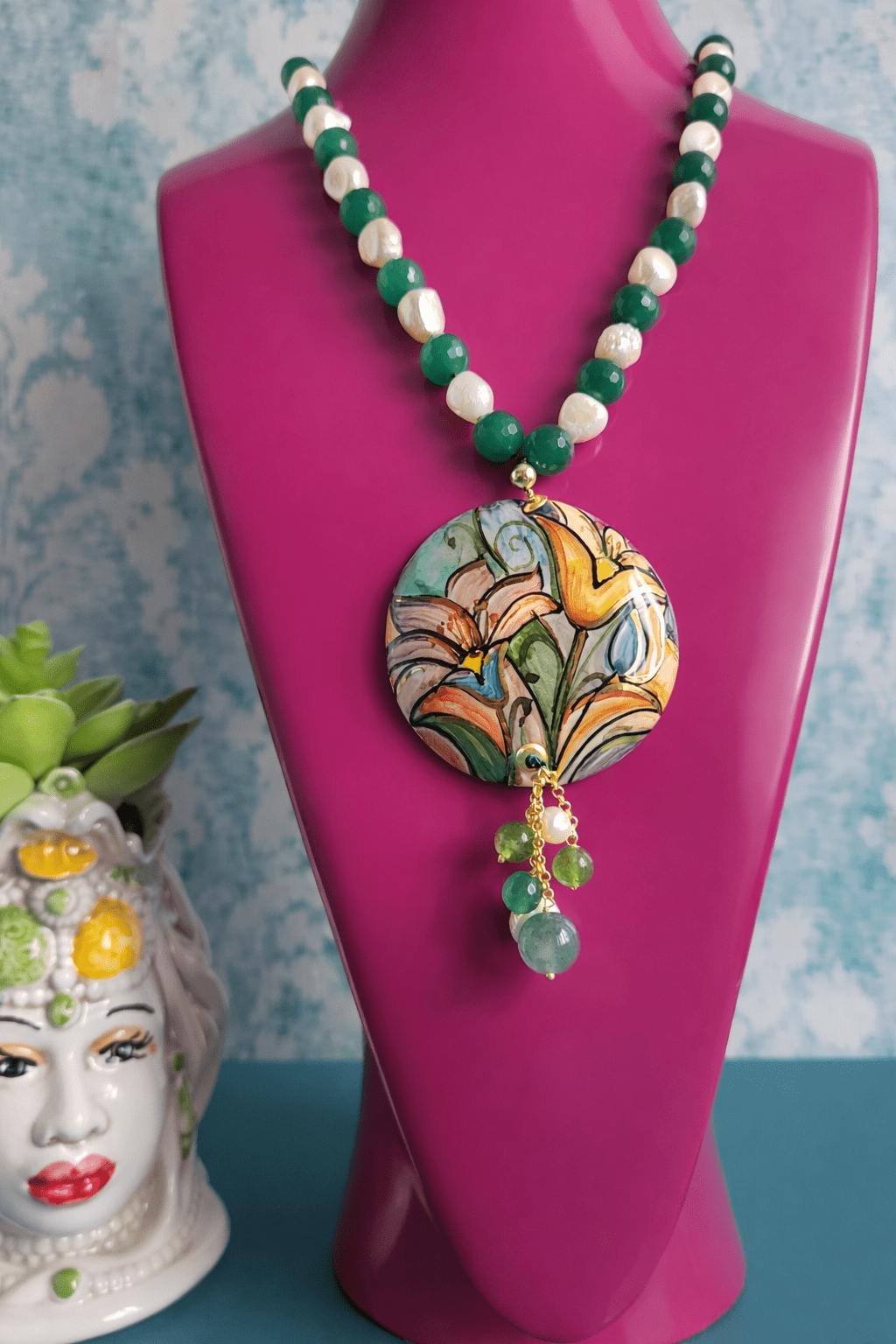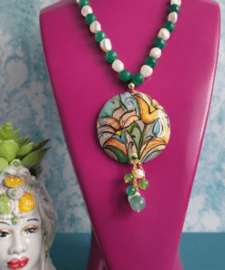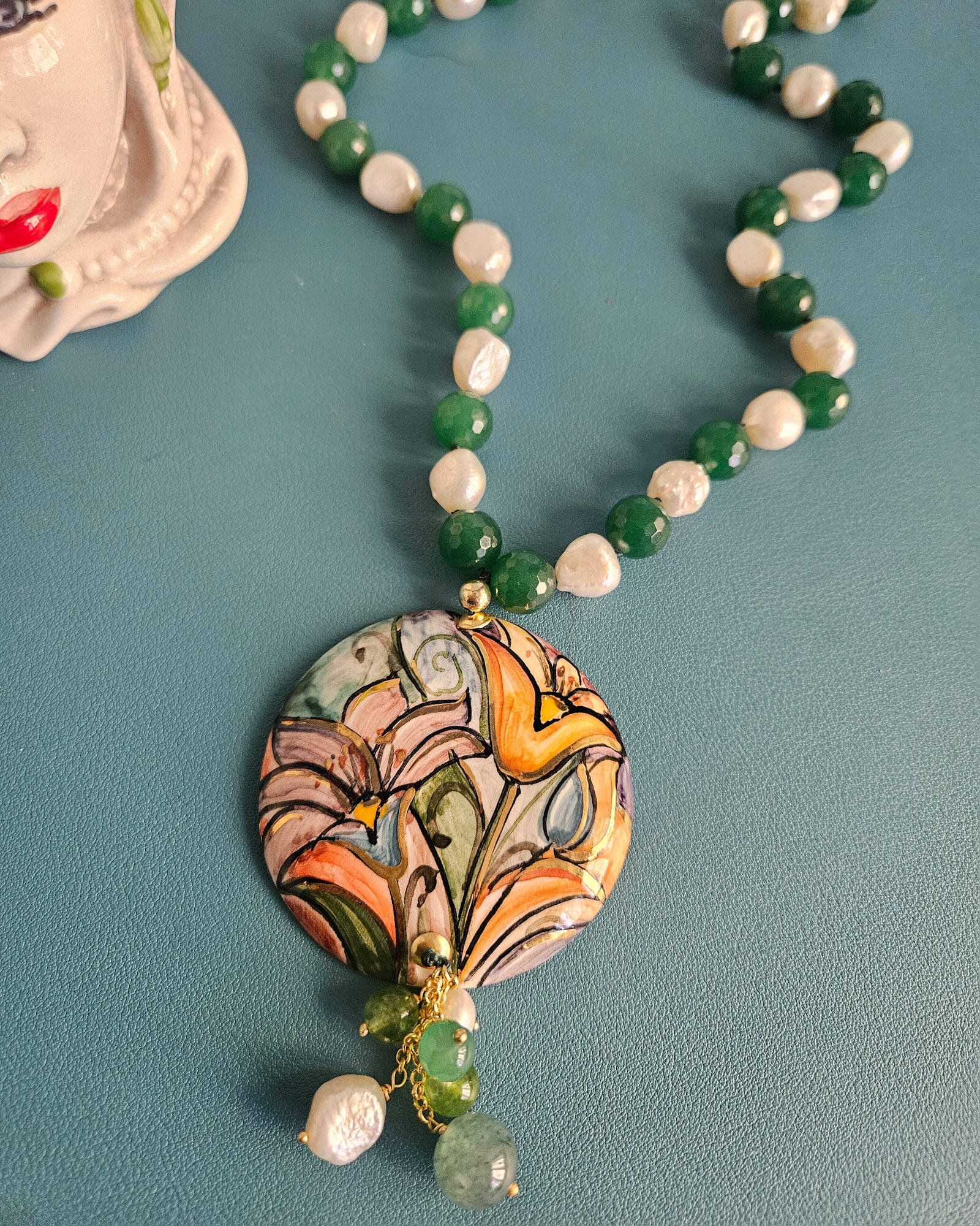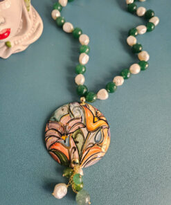 This necklace combines the natural luster of river pearls with the fresh green of jade, creating a very harmonious and luminous color combination. The alternating spheres give rhythm to the composition and highlight the large hand-painted ceramic pendant, the star of the jewel. The female face, decorated with small floral details, is handcrafted, making each piece unique.